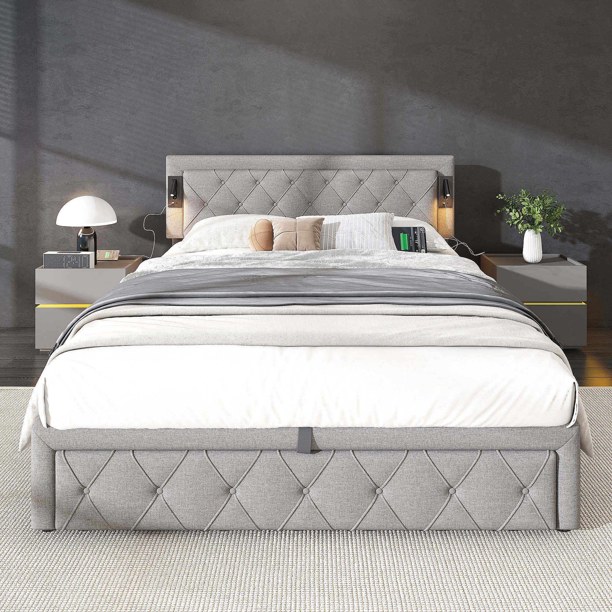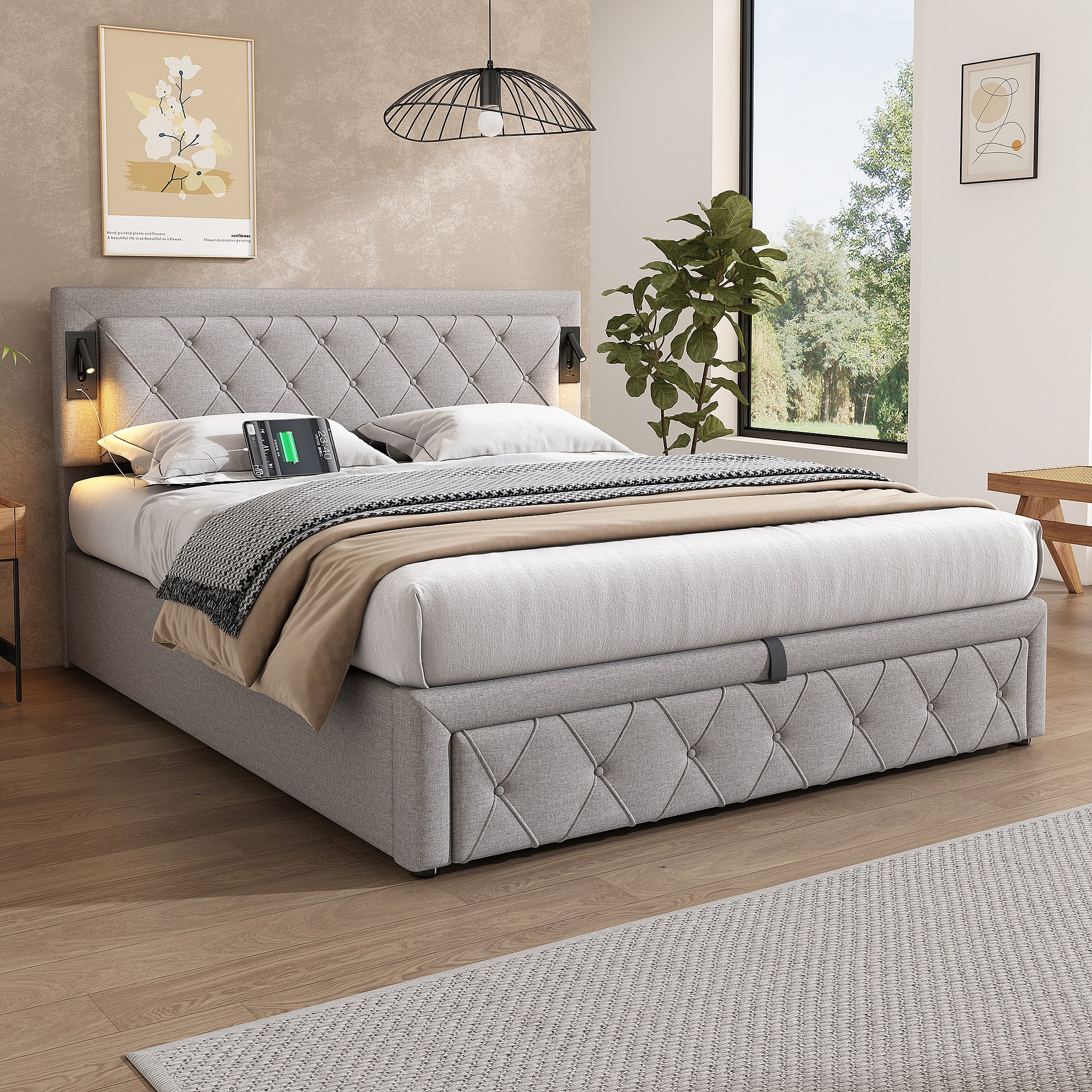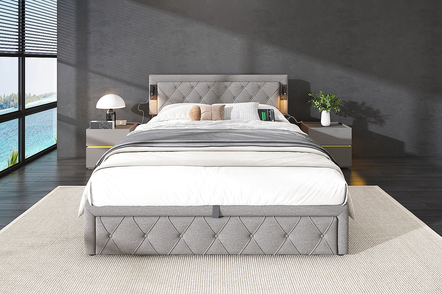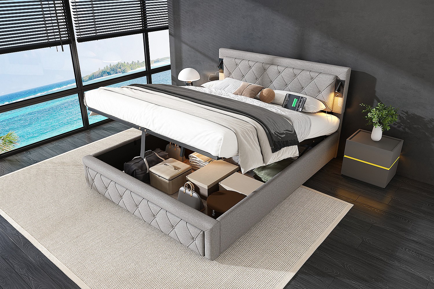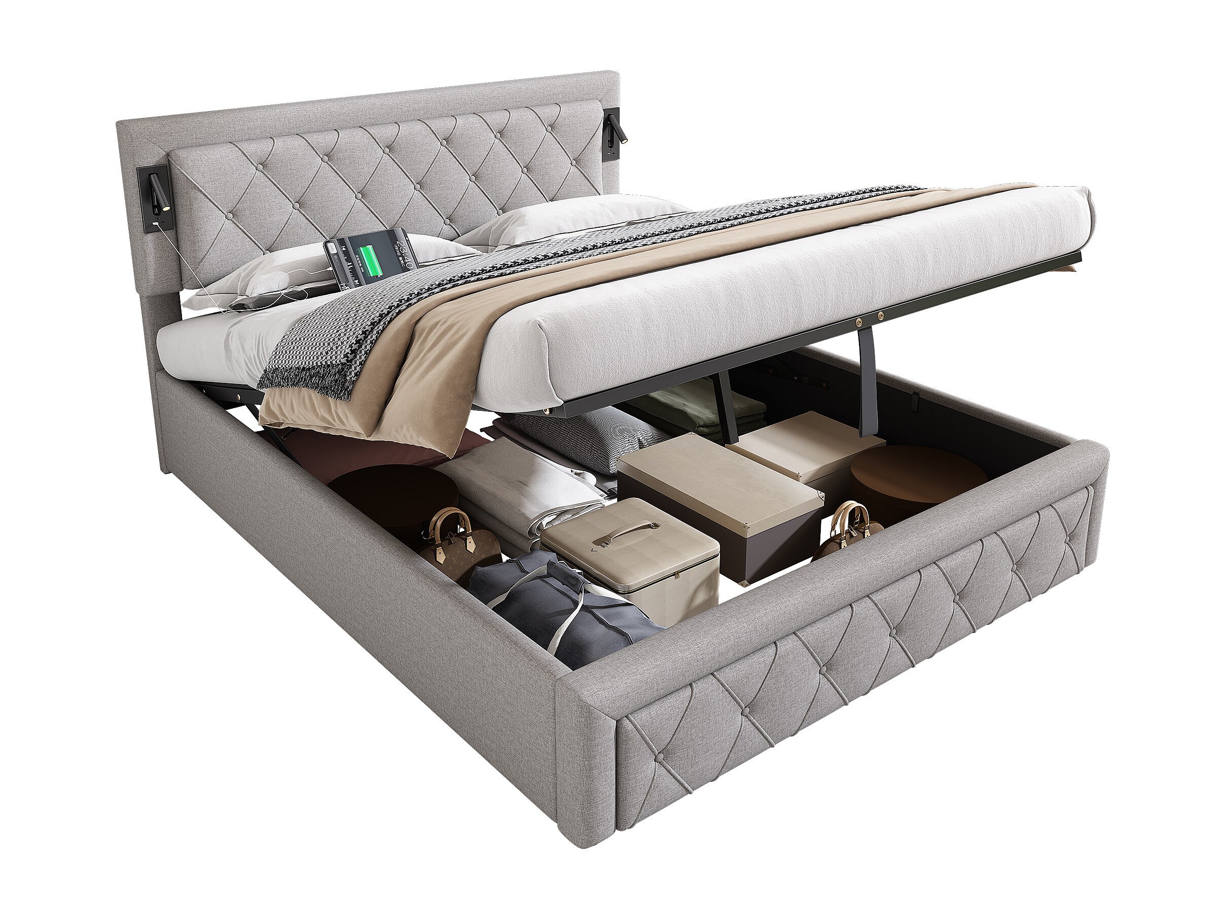 Lit rembourré 160×200 cm, avec éclairage LED et port USB, tête de lit en lin, structure hydraulique, rangement intégré