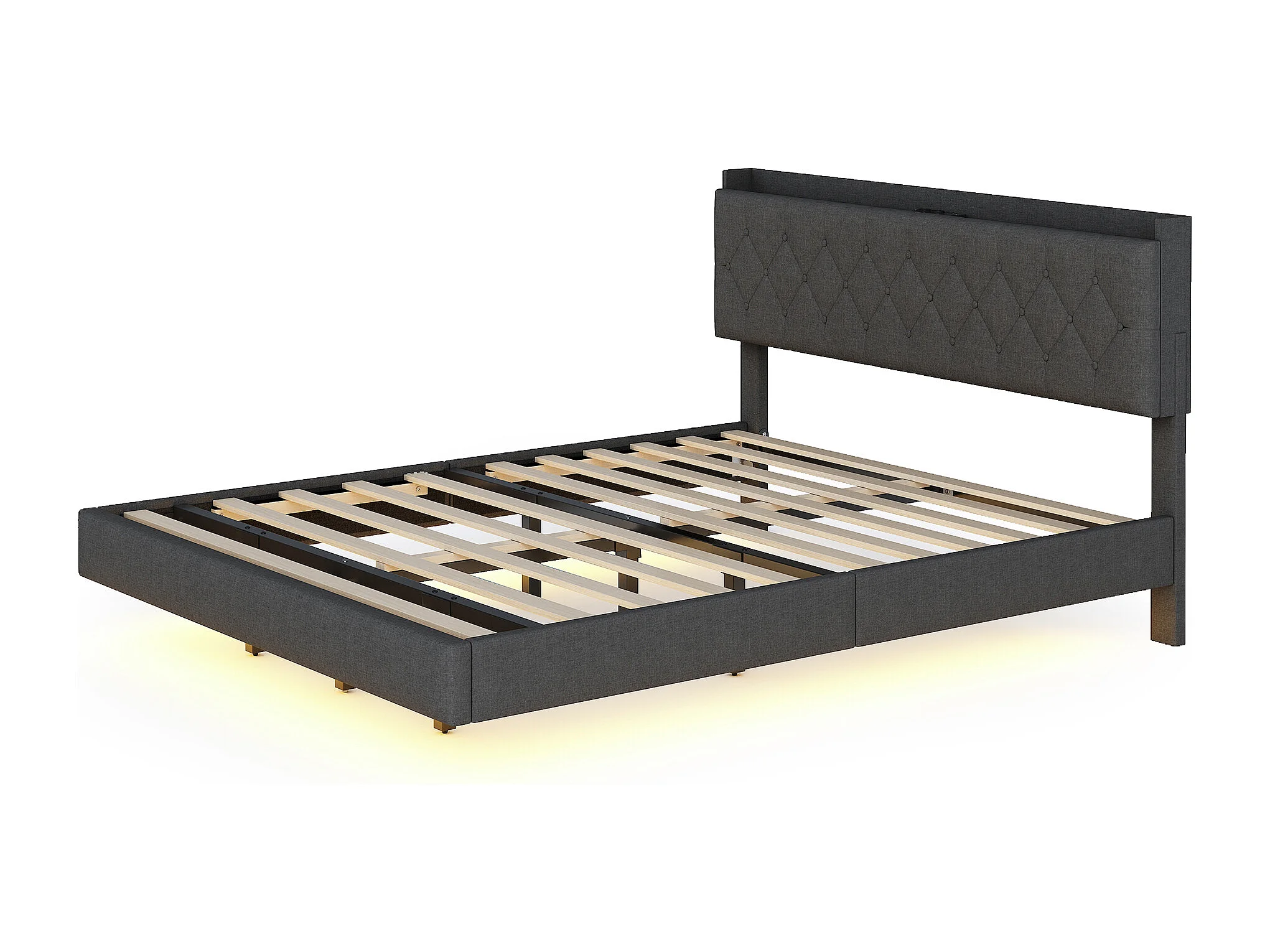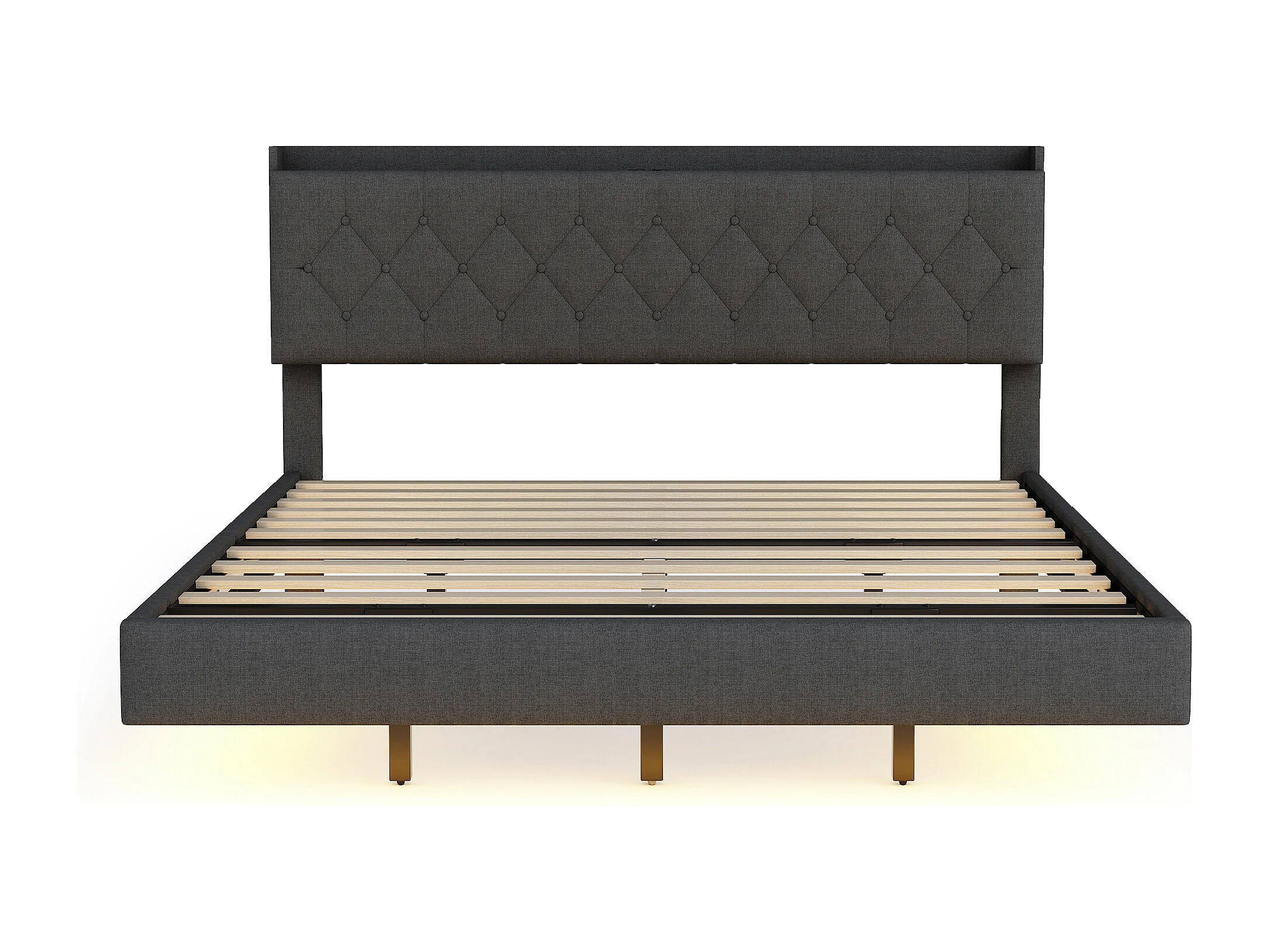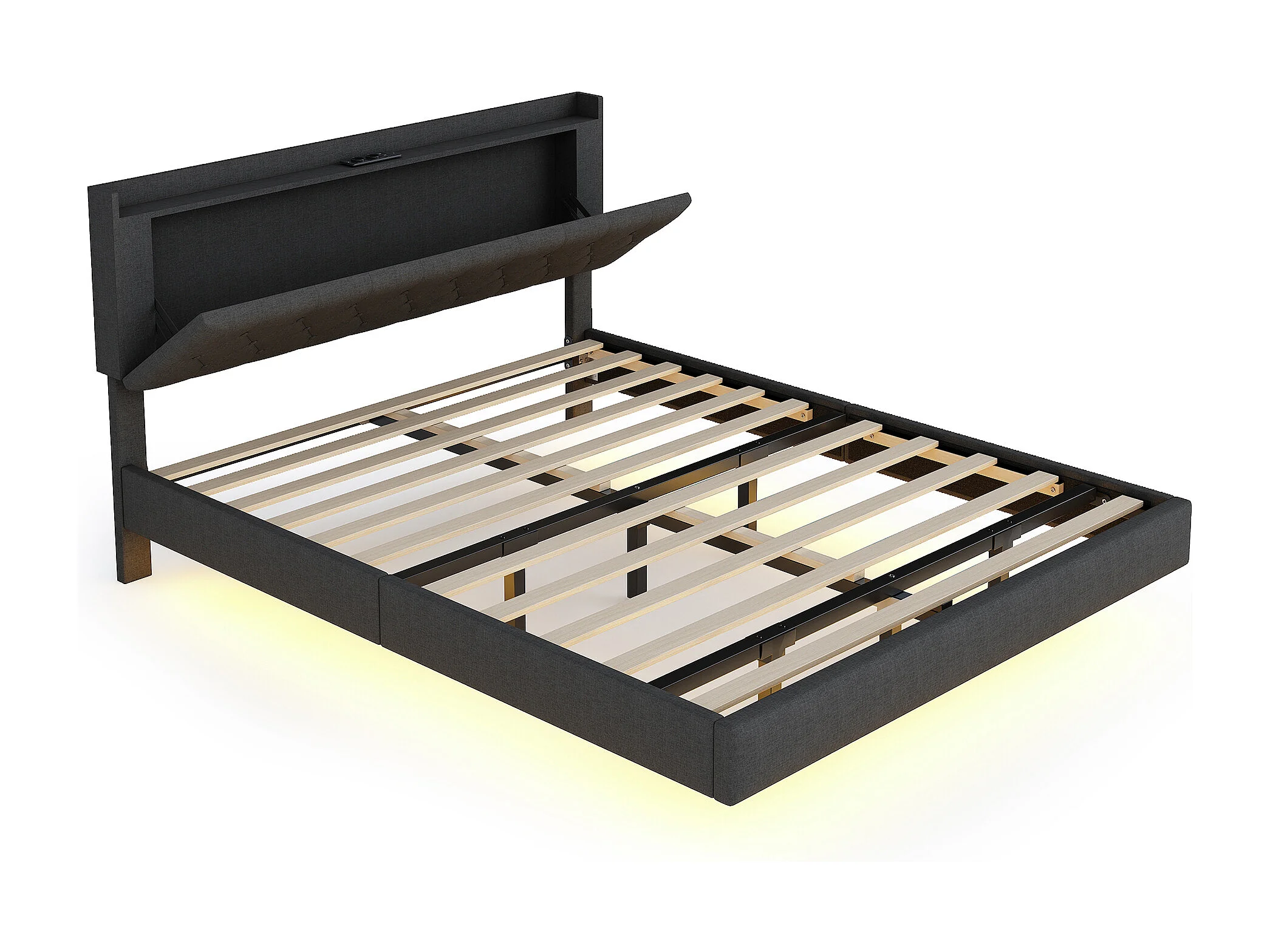 Lit rembourré 160x200 cm avec USB ,rangement et LED - Lit suspendu double - Tissu lin gris