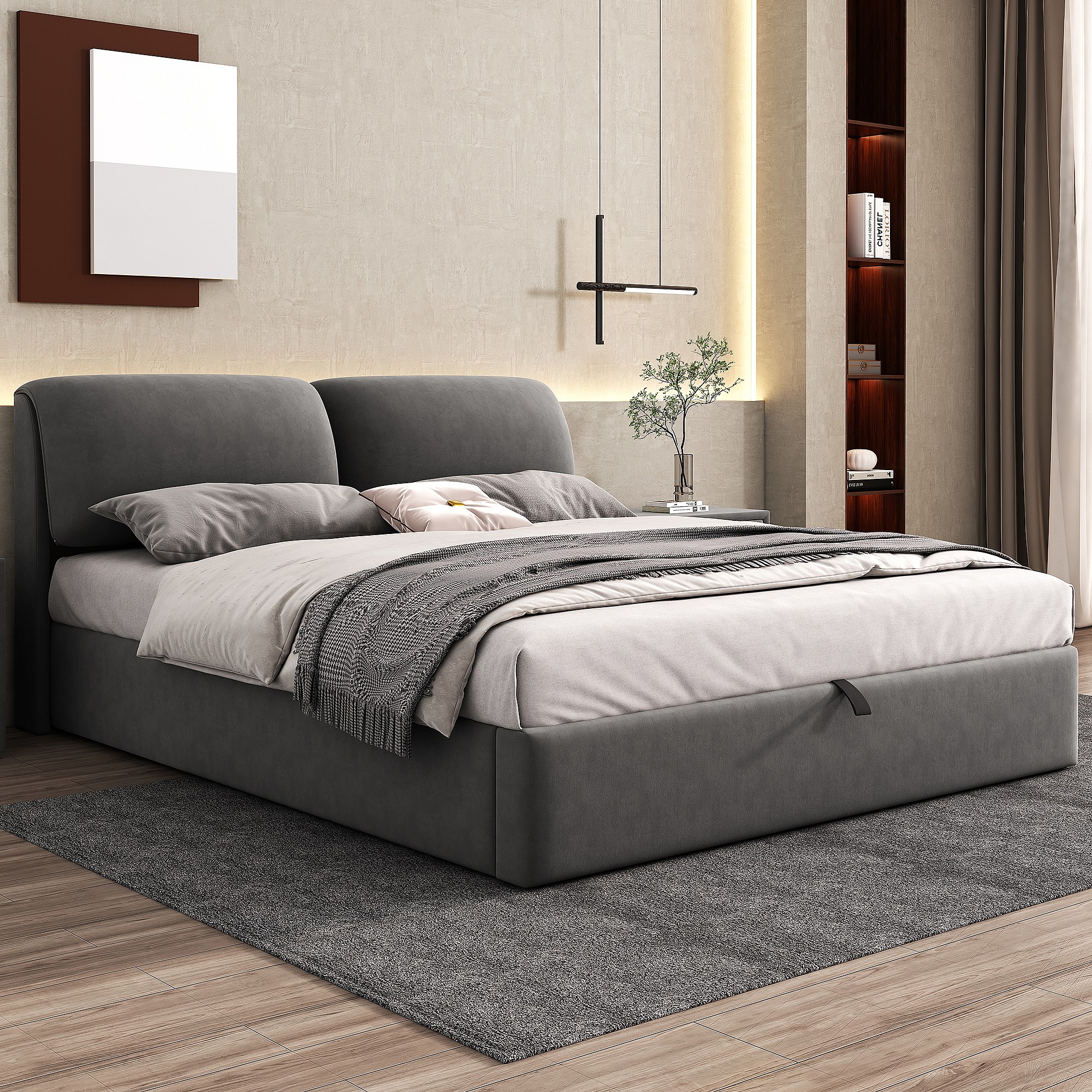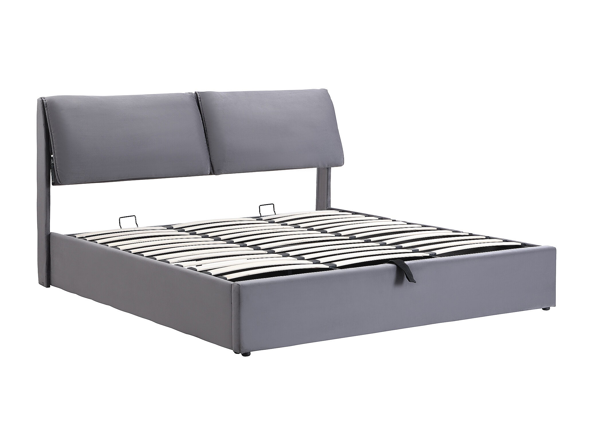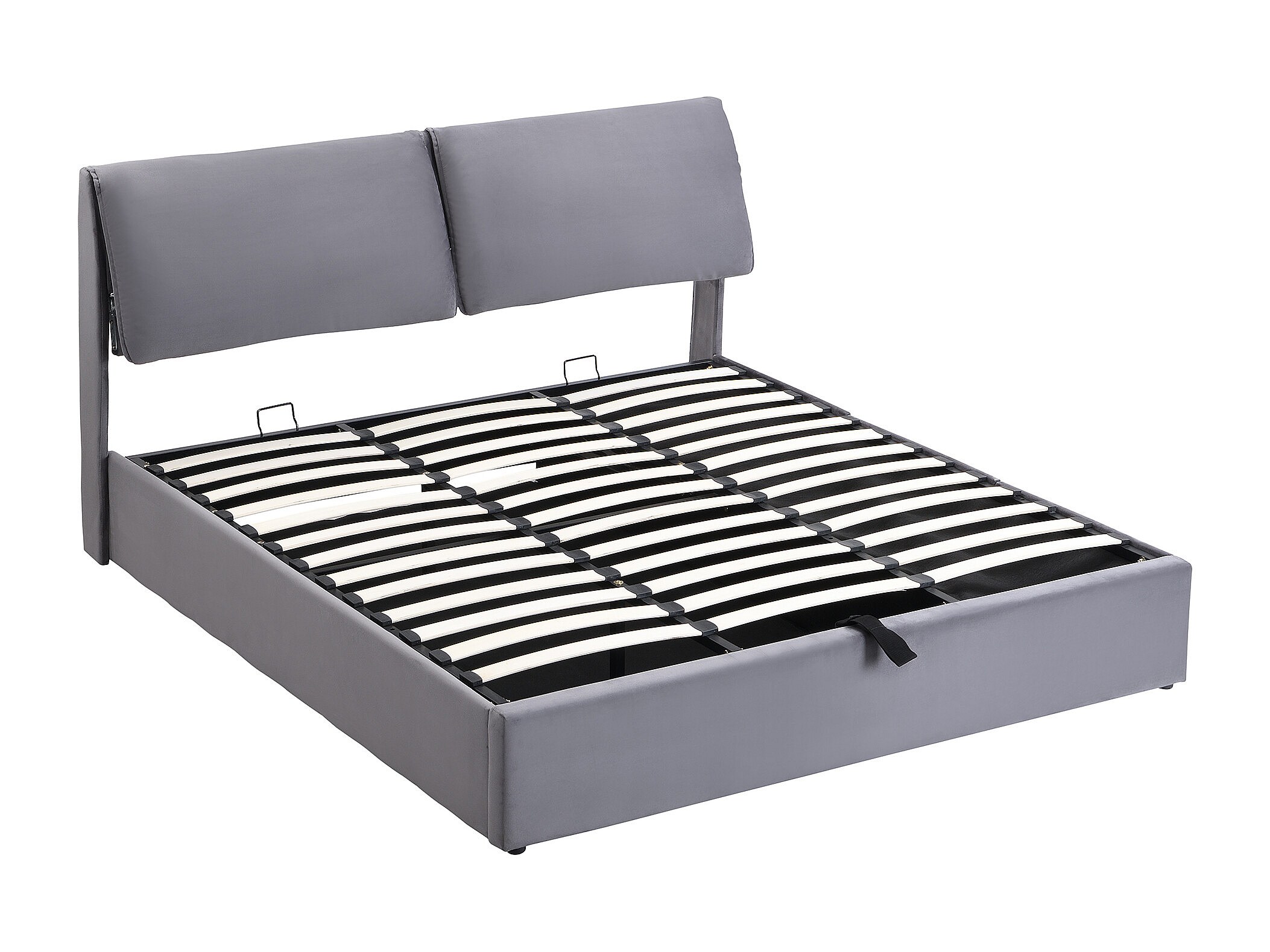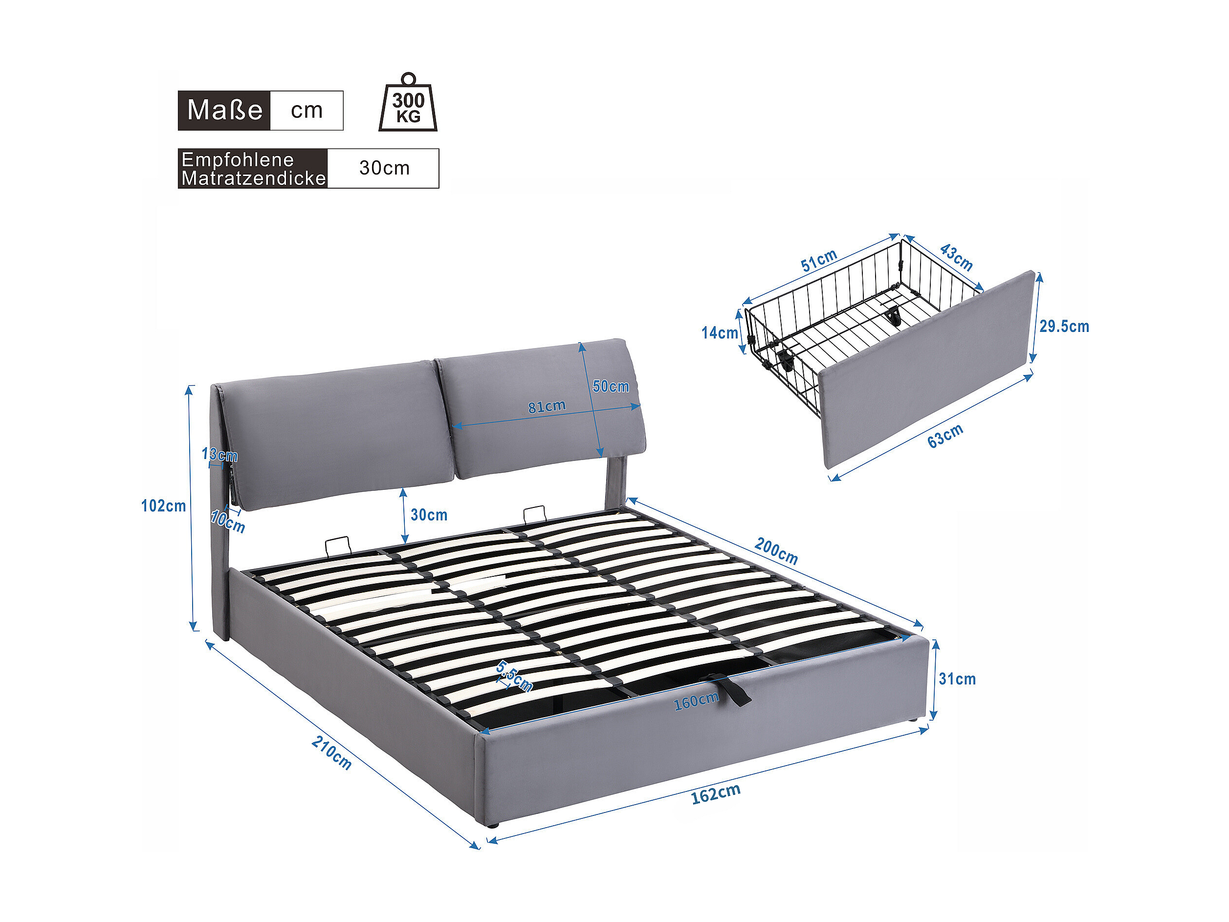 Lit rembourré 160×200 cm, gris, avec tête de lit, trois tiroirs et coffre de rangement