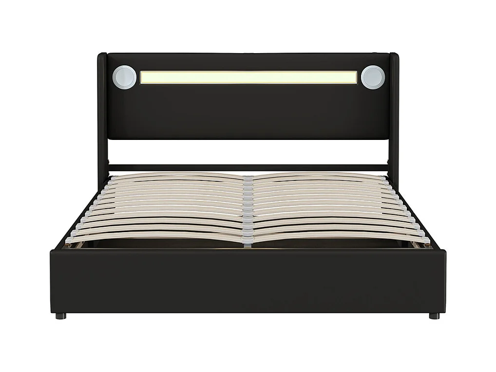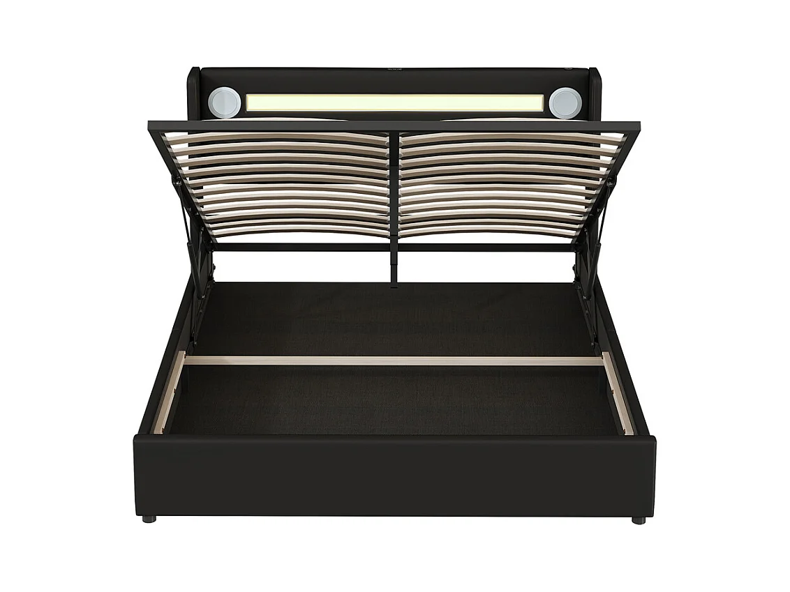 Lit rembourré 160x200 cm lit sommier à lattes lit barre lumineuse à led lecteur bluetooth et recharge usb lit double cuir pu noir