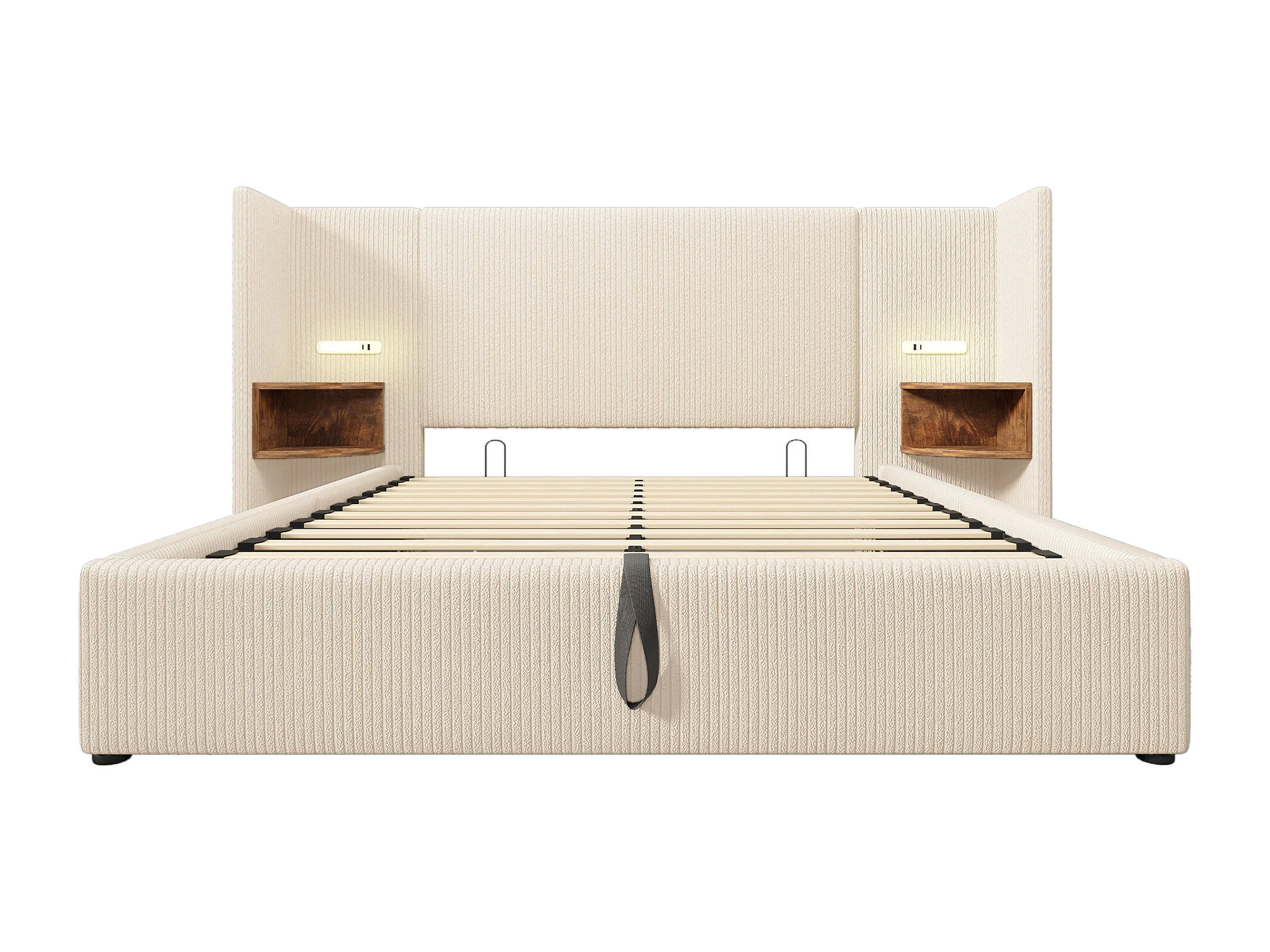 Lit rembourré 160x200cm, avec table de chevet,lampe de lecture,USB Type-C et sommier à lattes,lit coffre,beige et blanc,avec matelas