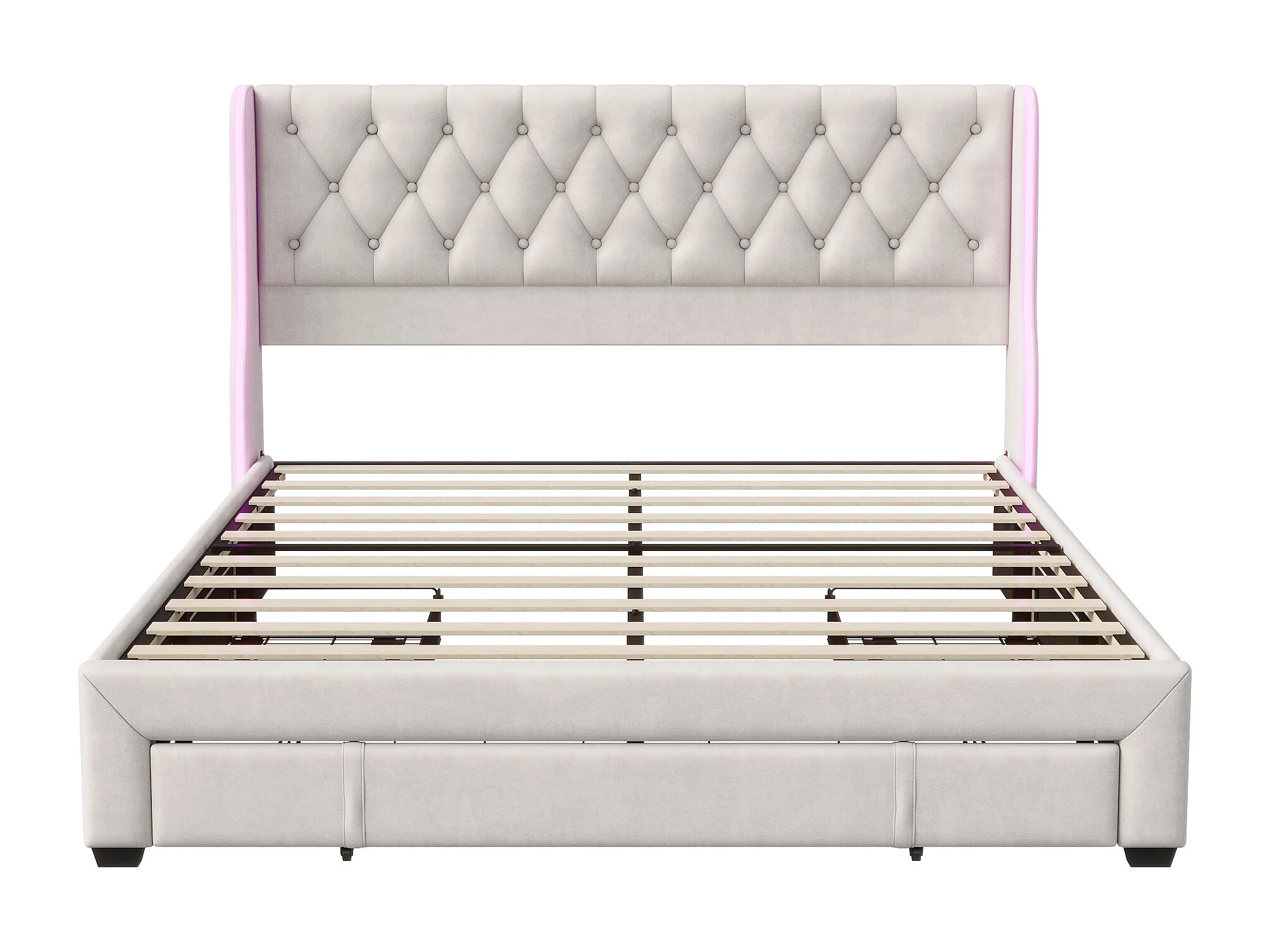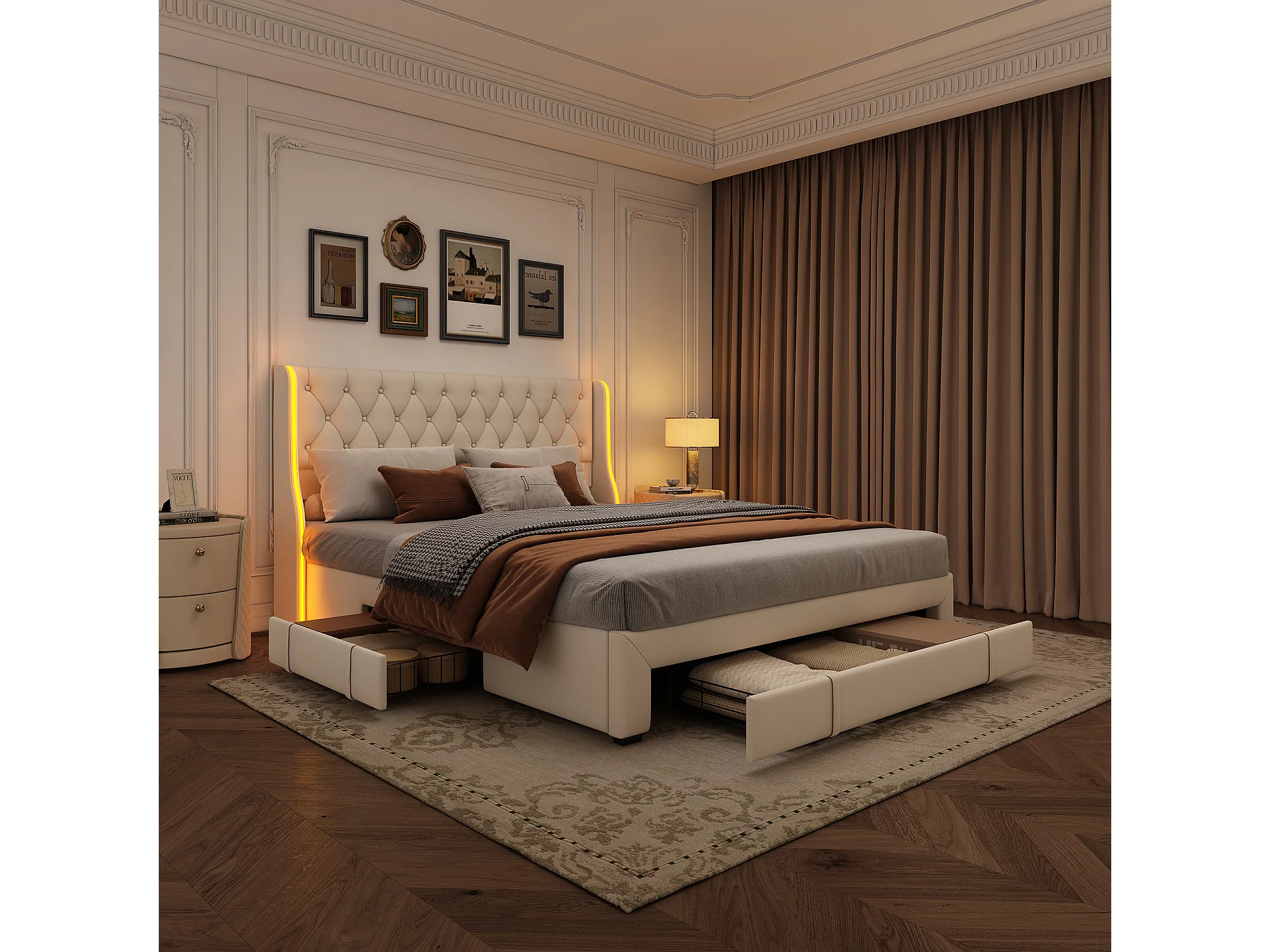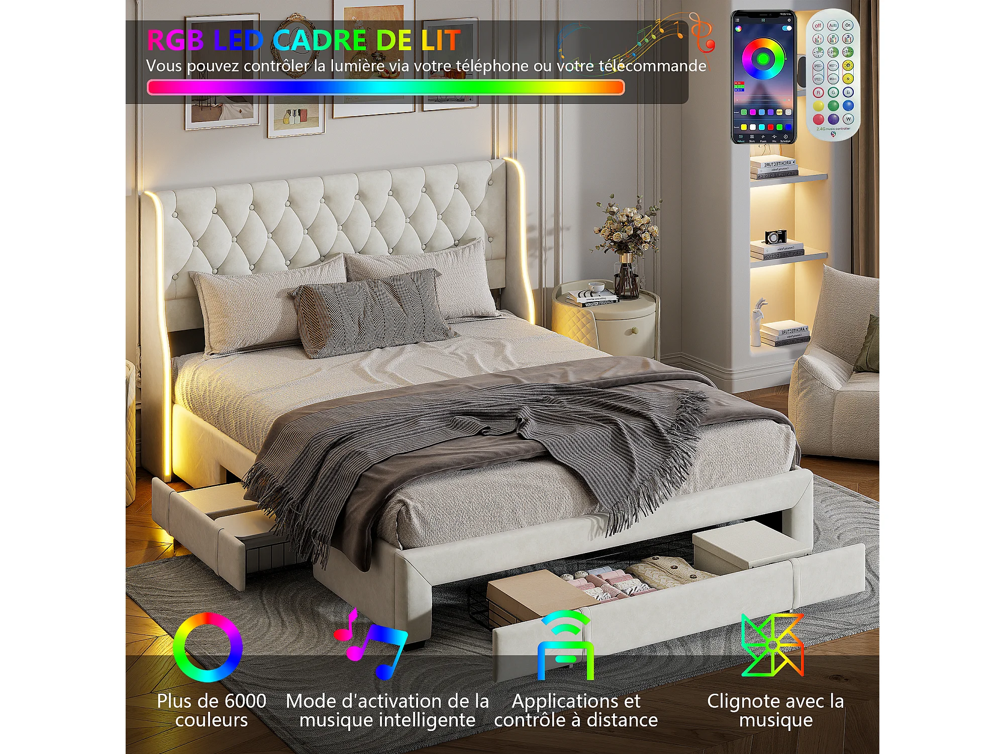 Lit rembourré 160x200cm - lit de stockage avec 3 tiroirs en fer et tête avec bandes de lumière double côté, cadre de lit double