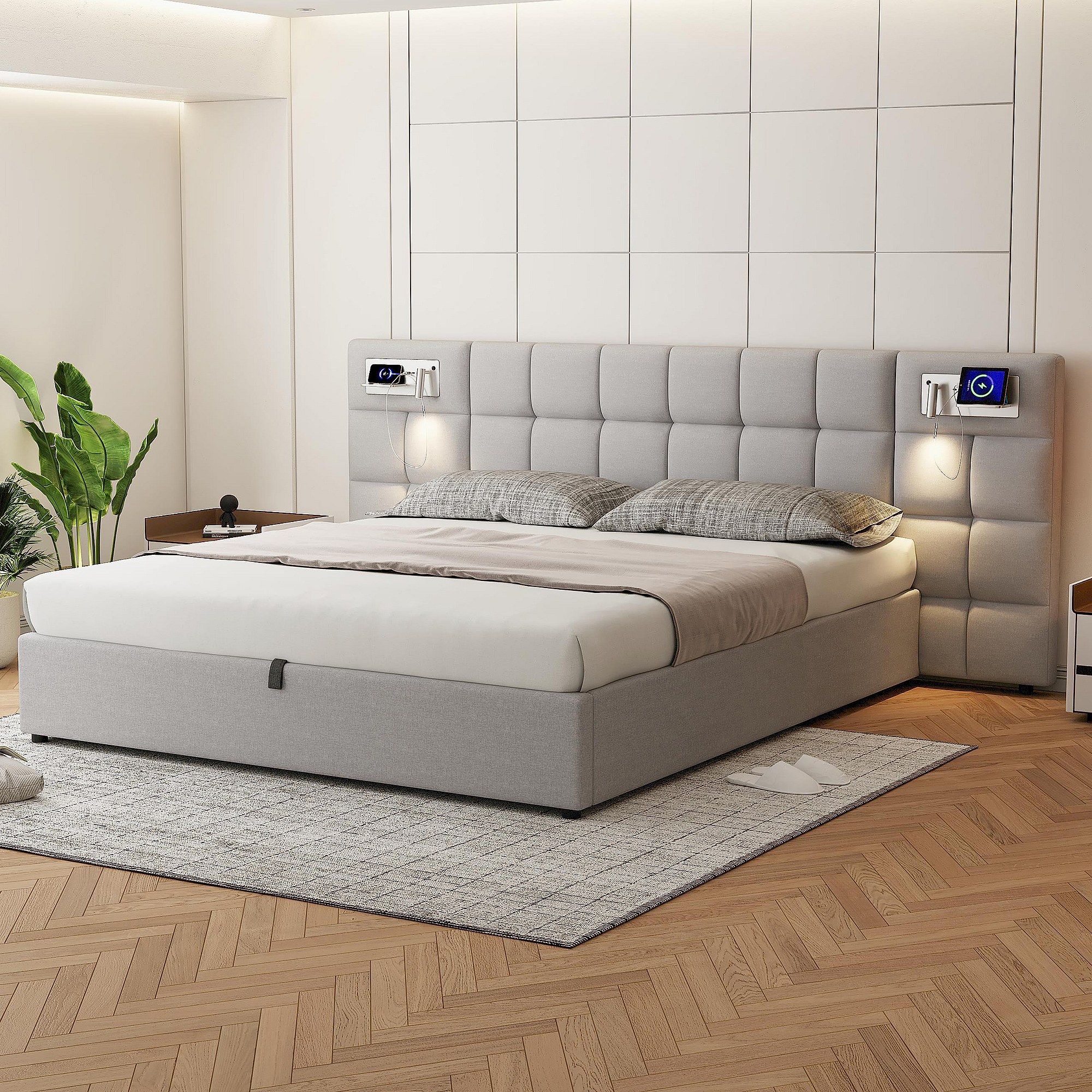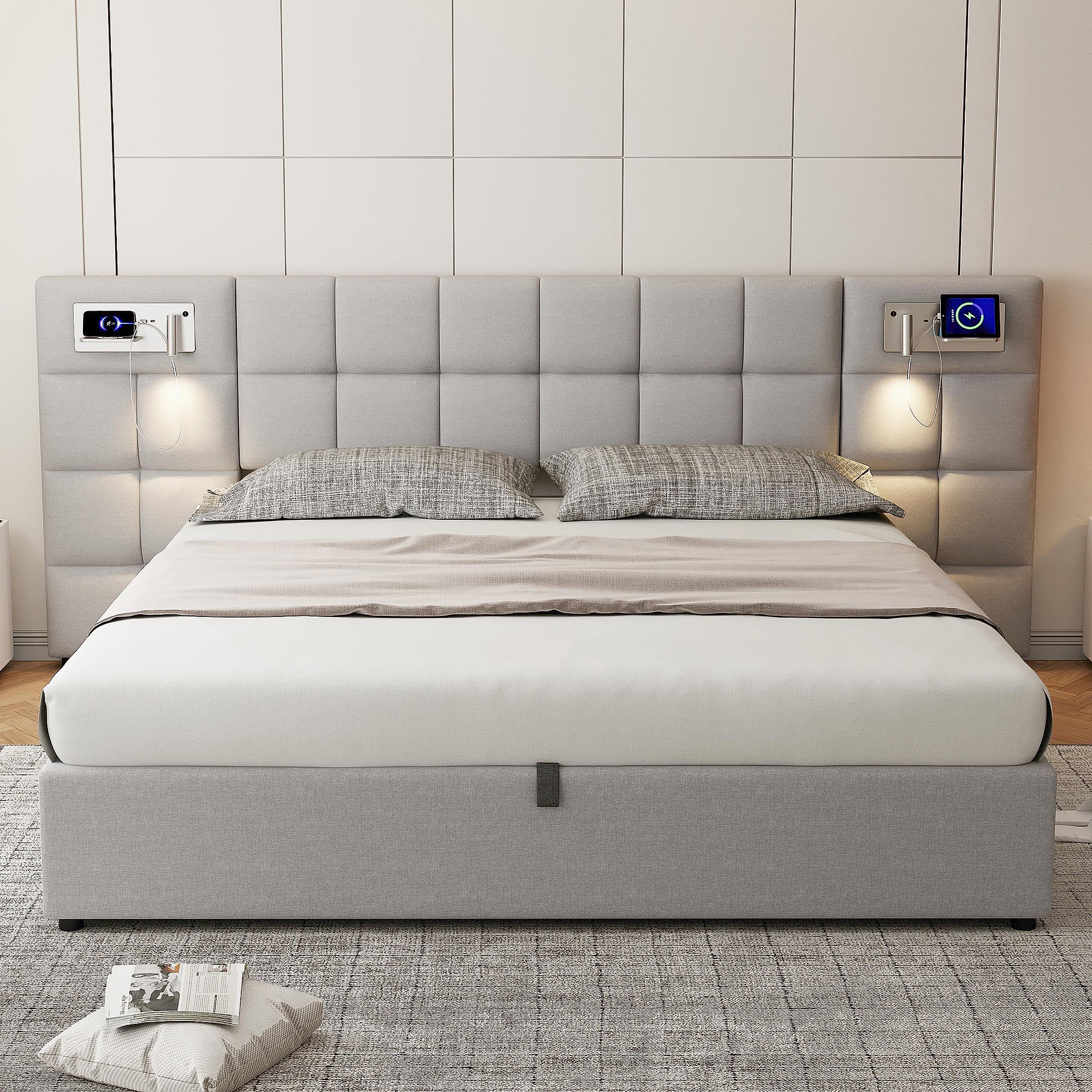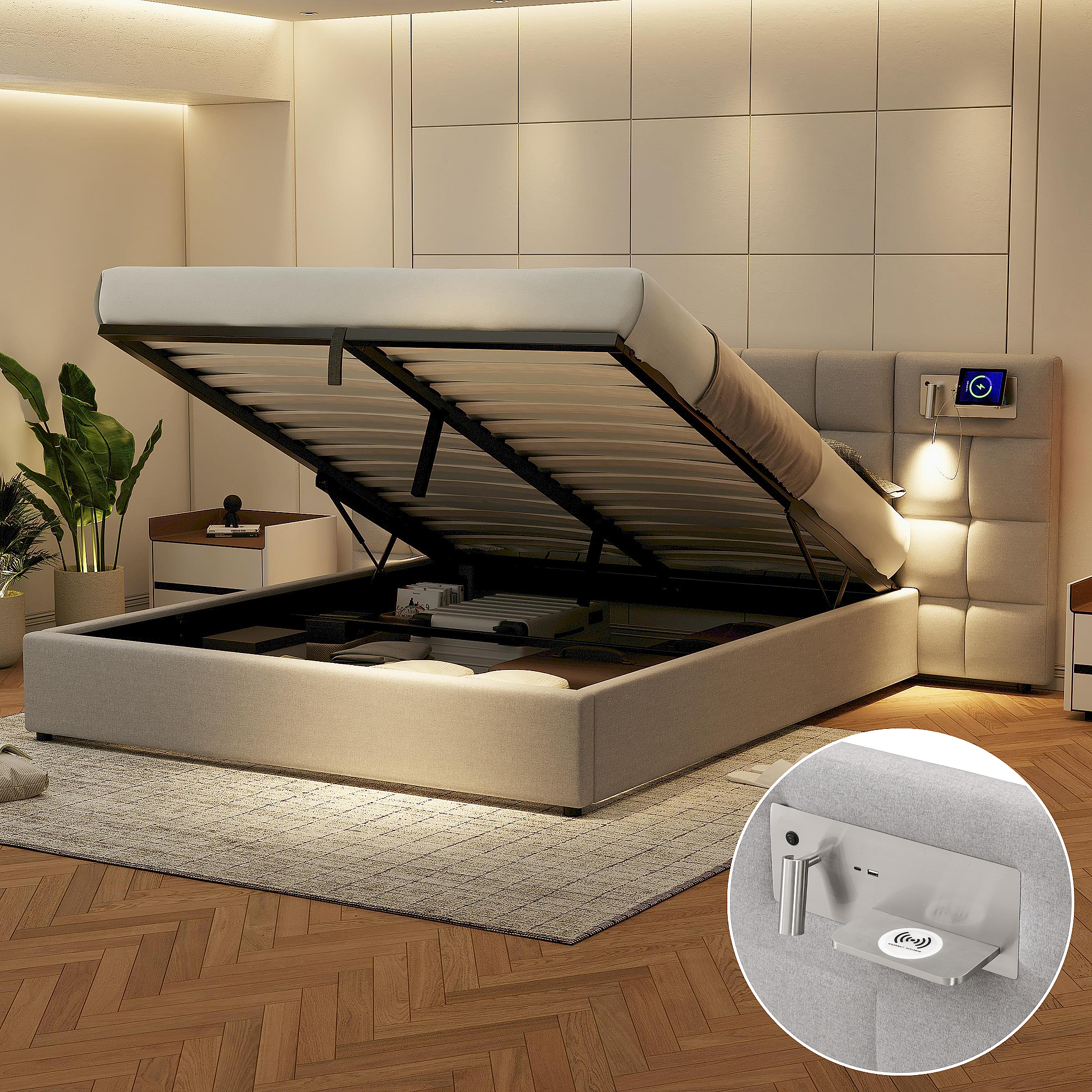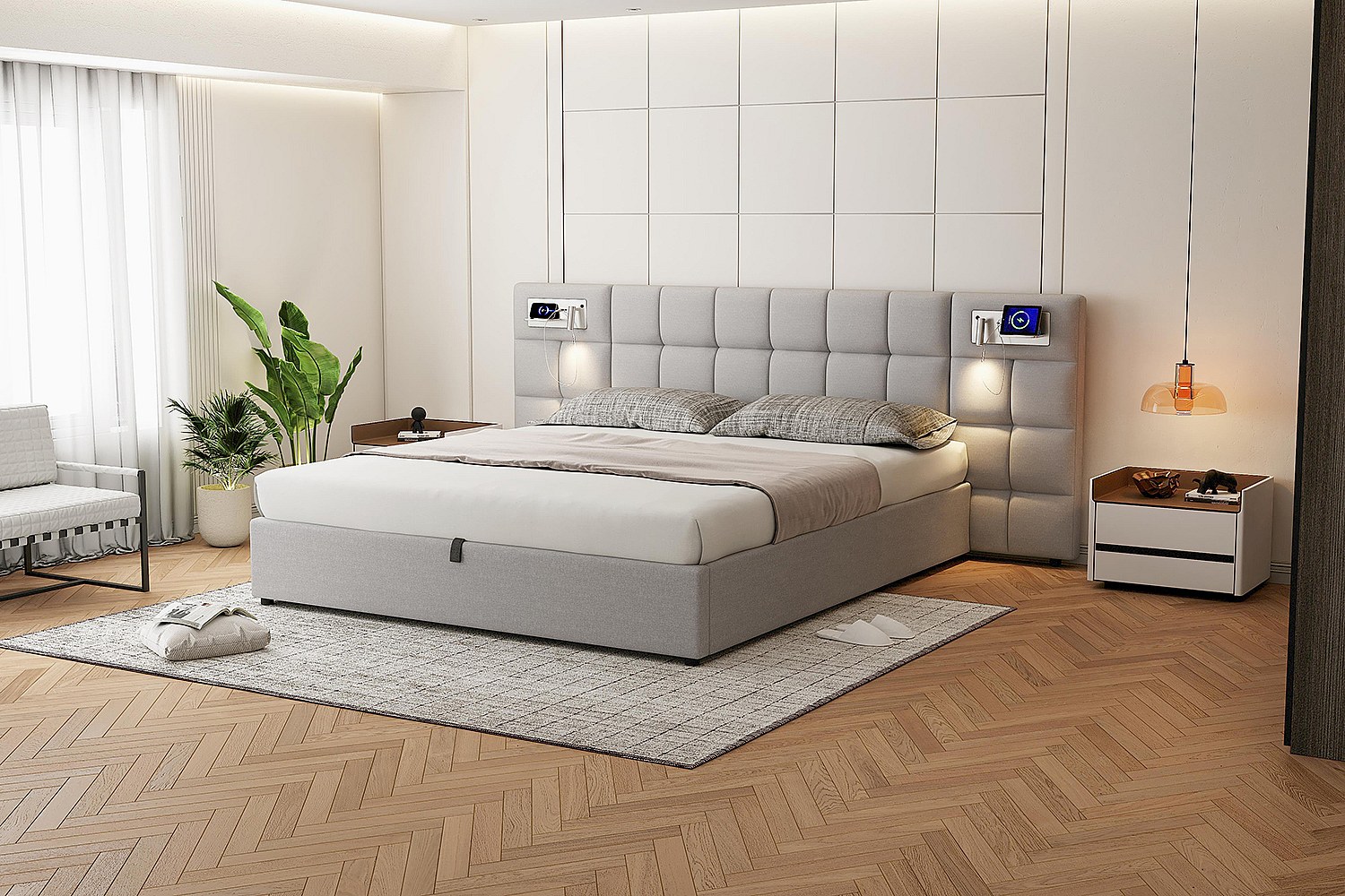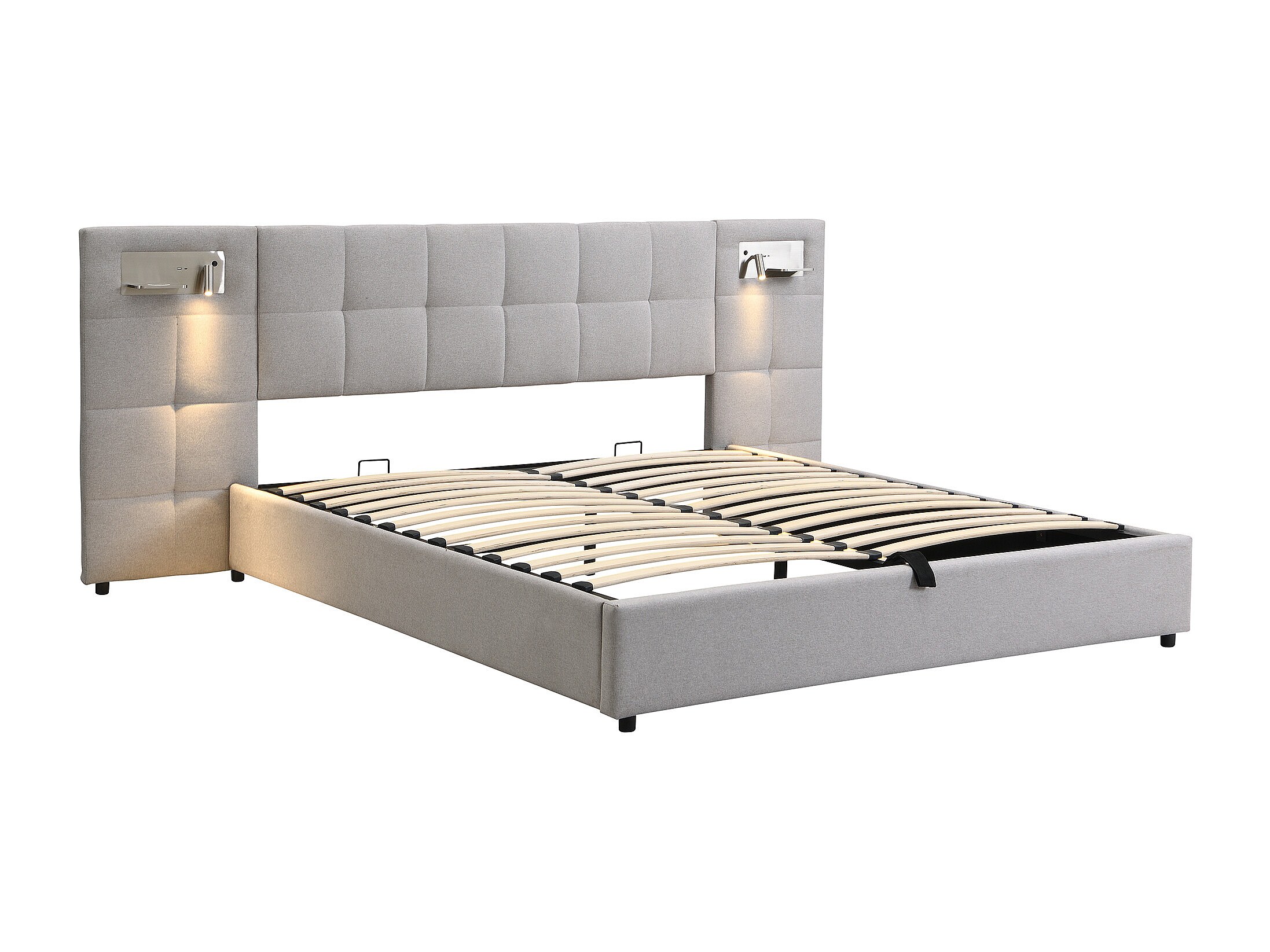 Lit rembourré 180 x 200 cm avec rangement hydraulique, port USB et charge sans fil, éclairage intégré