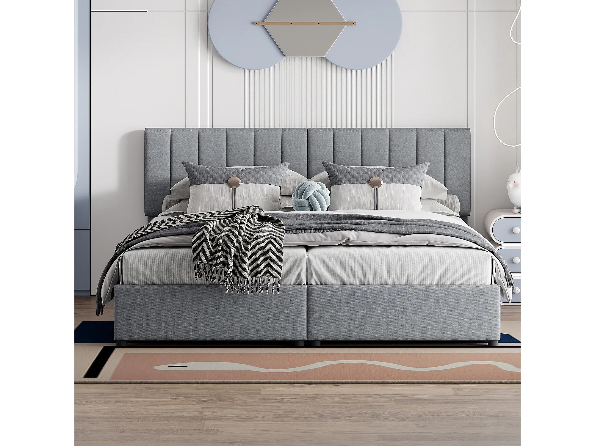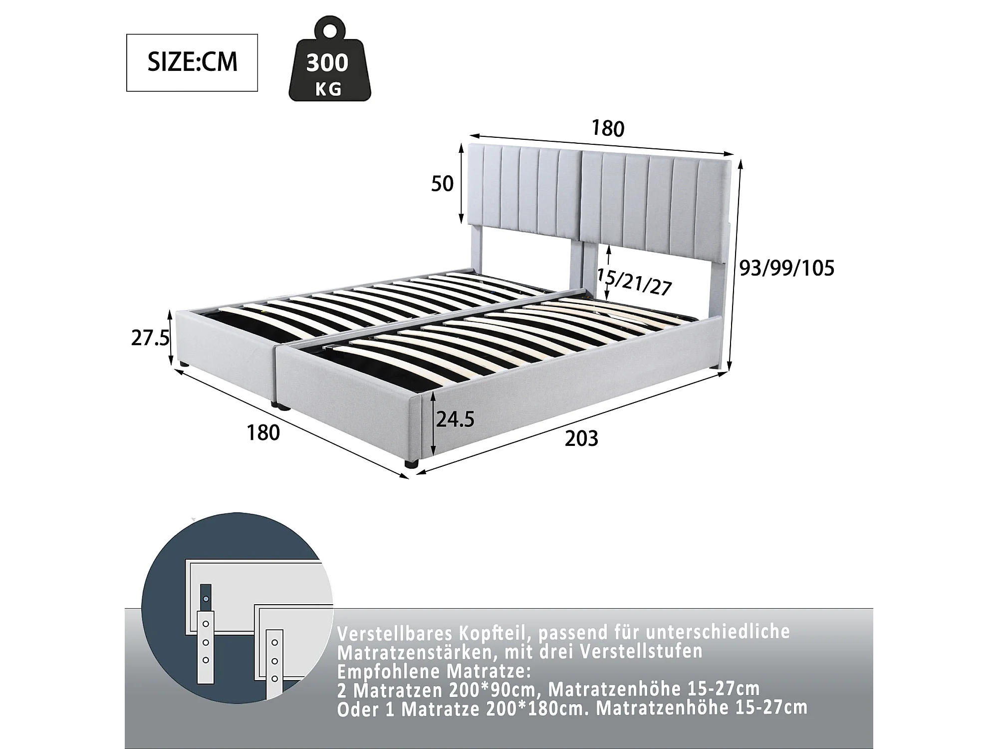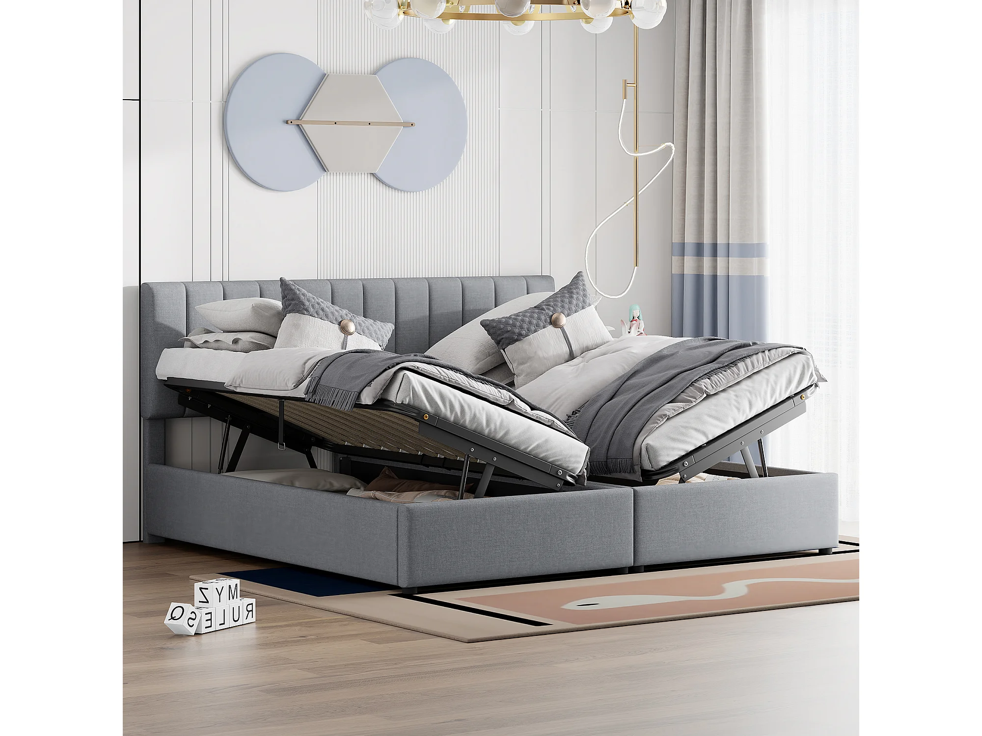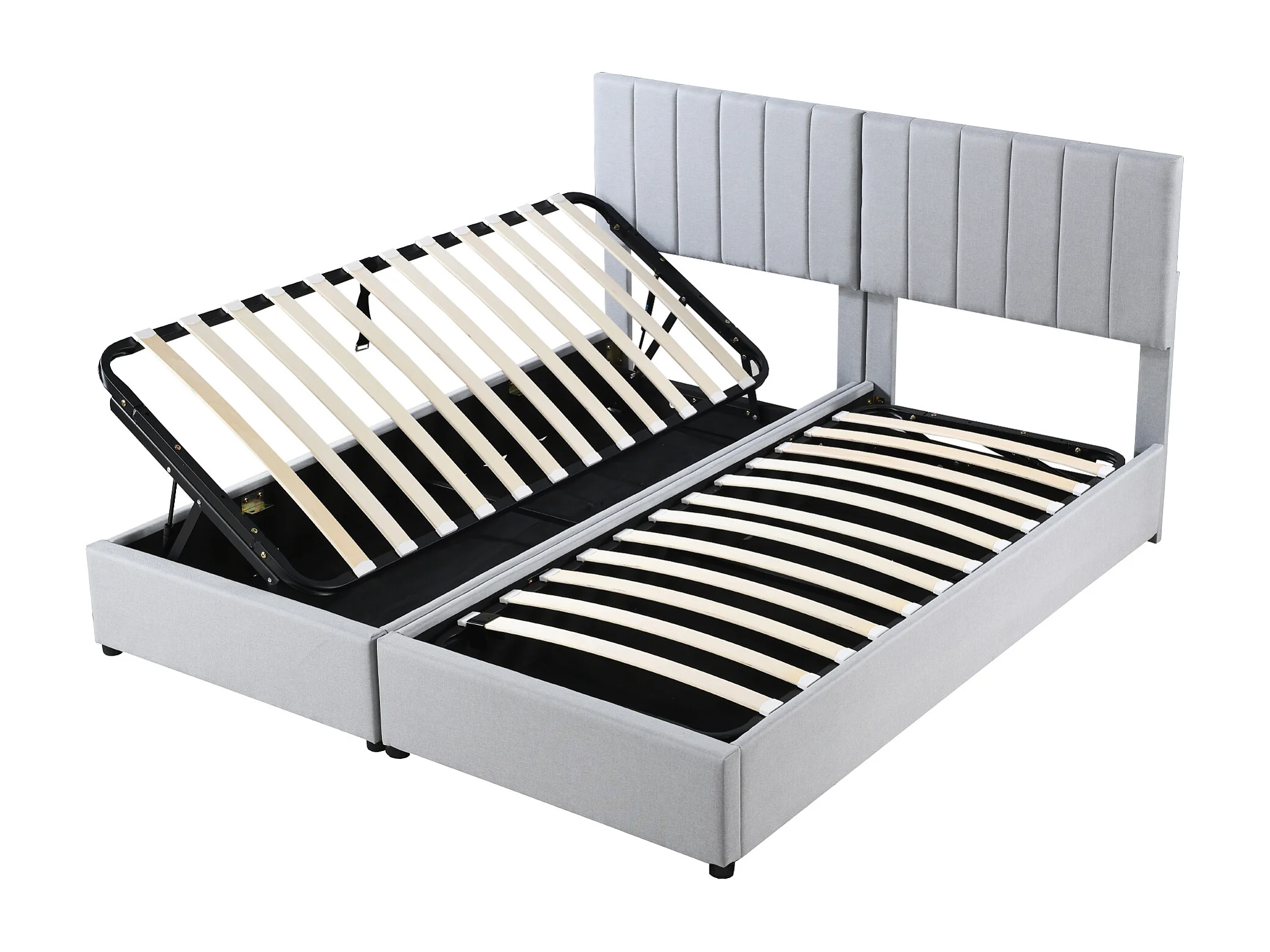 Lit rembourré 180x200 cm avec coffre hydraulique, sommier inclus, velours lin gris, lit double multifonction