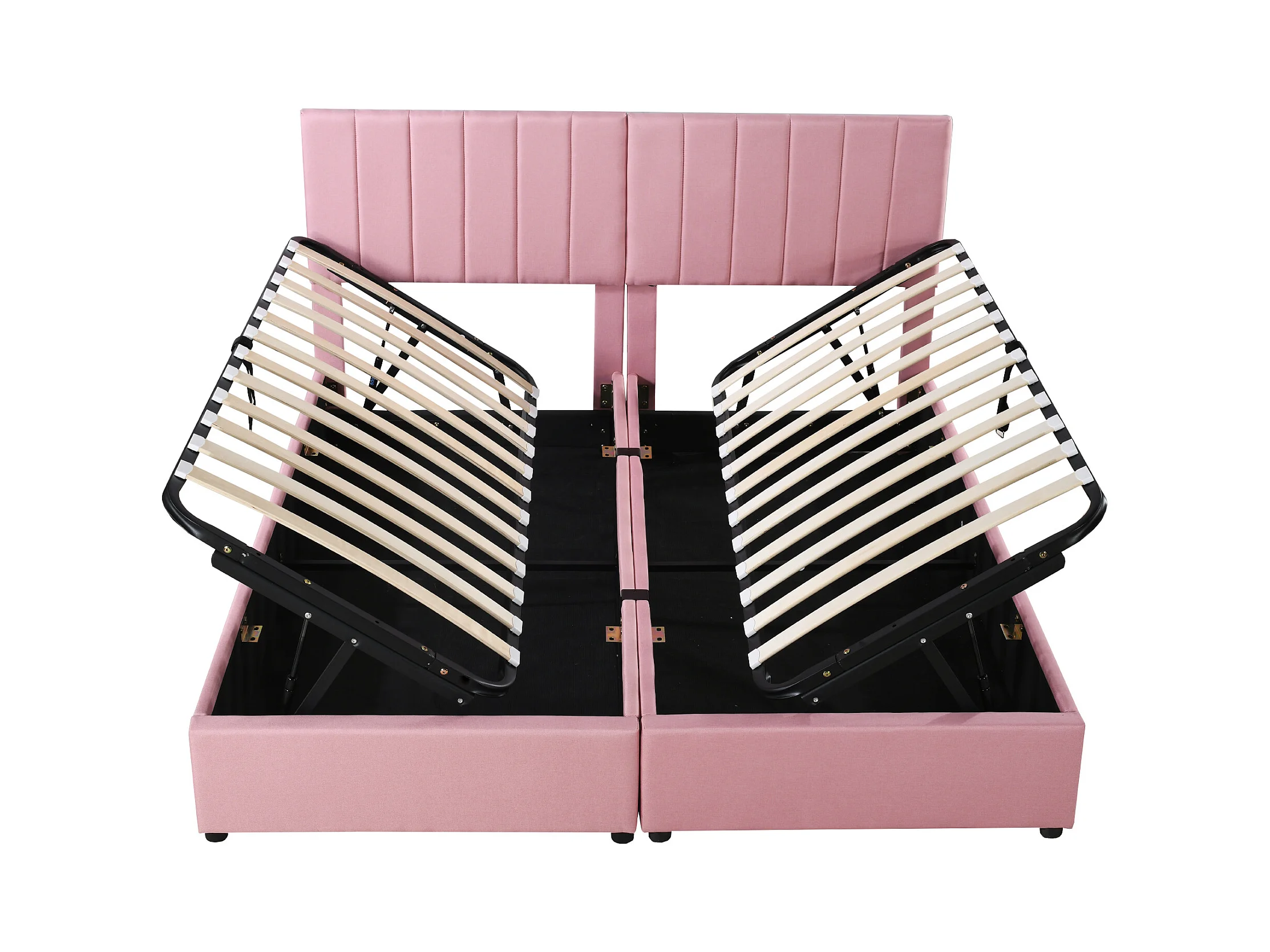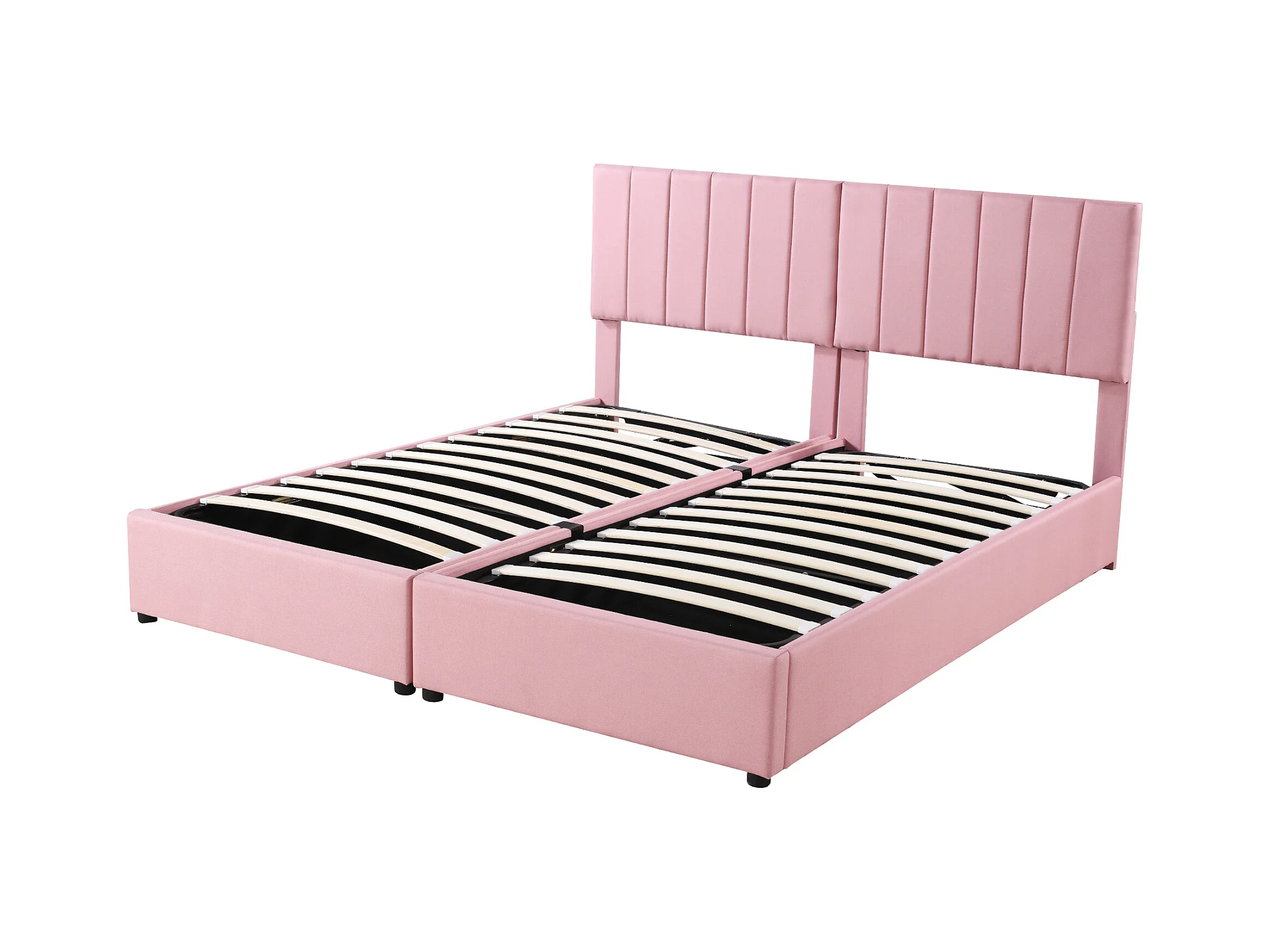 Lit rembourré 180x200 cm avec coffre hydraulique, sommier inclus, velours lin rose, lit double multifonction