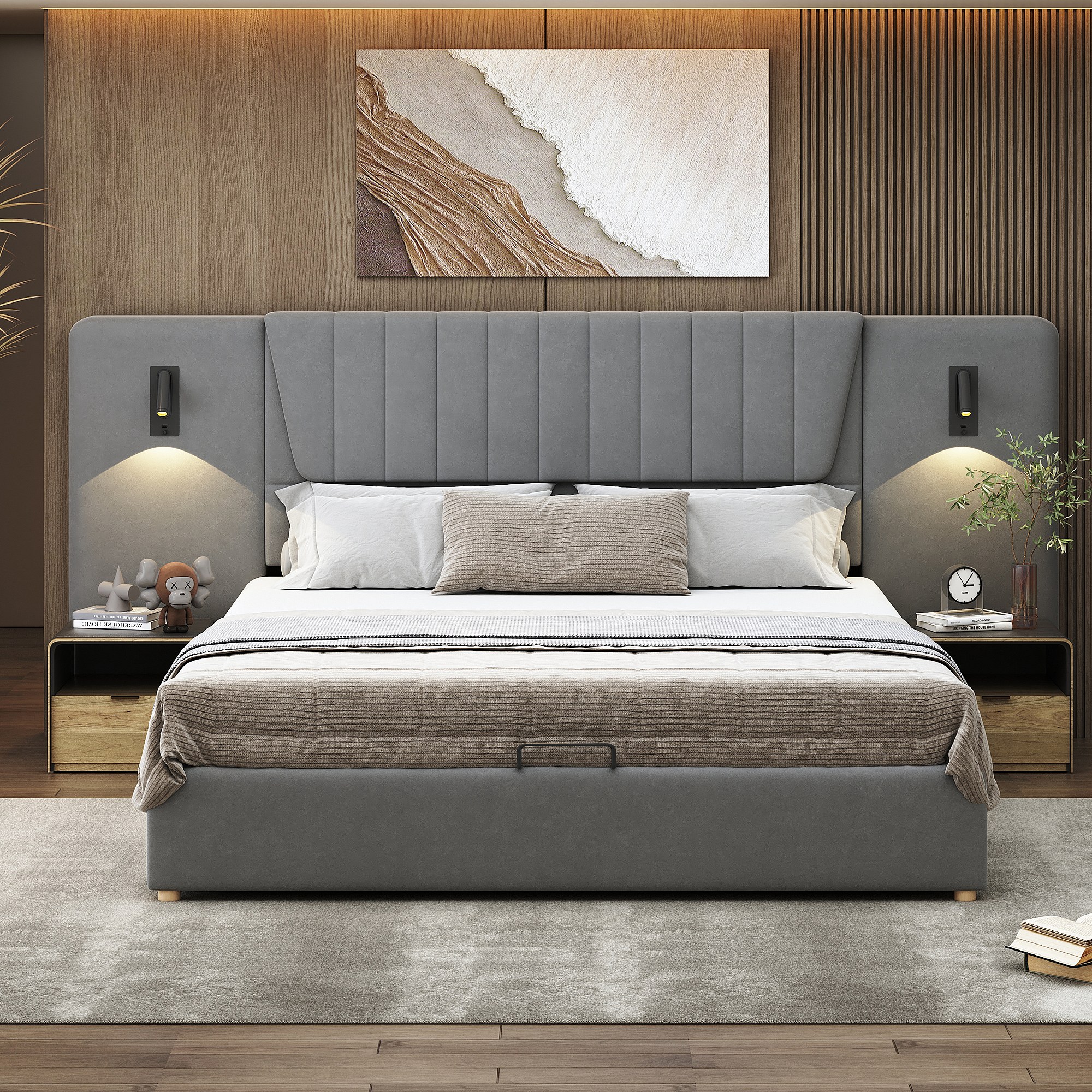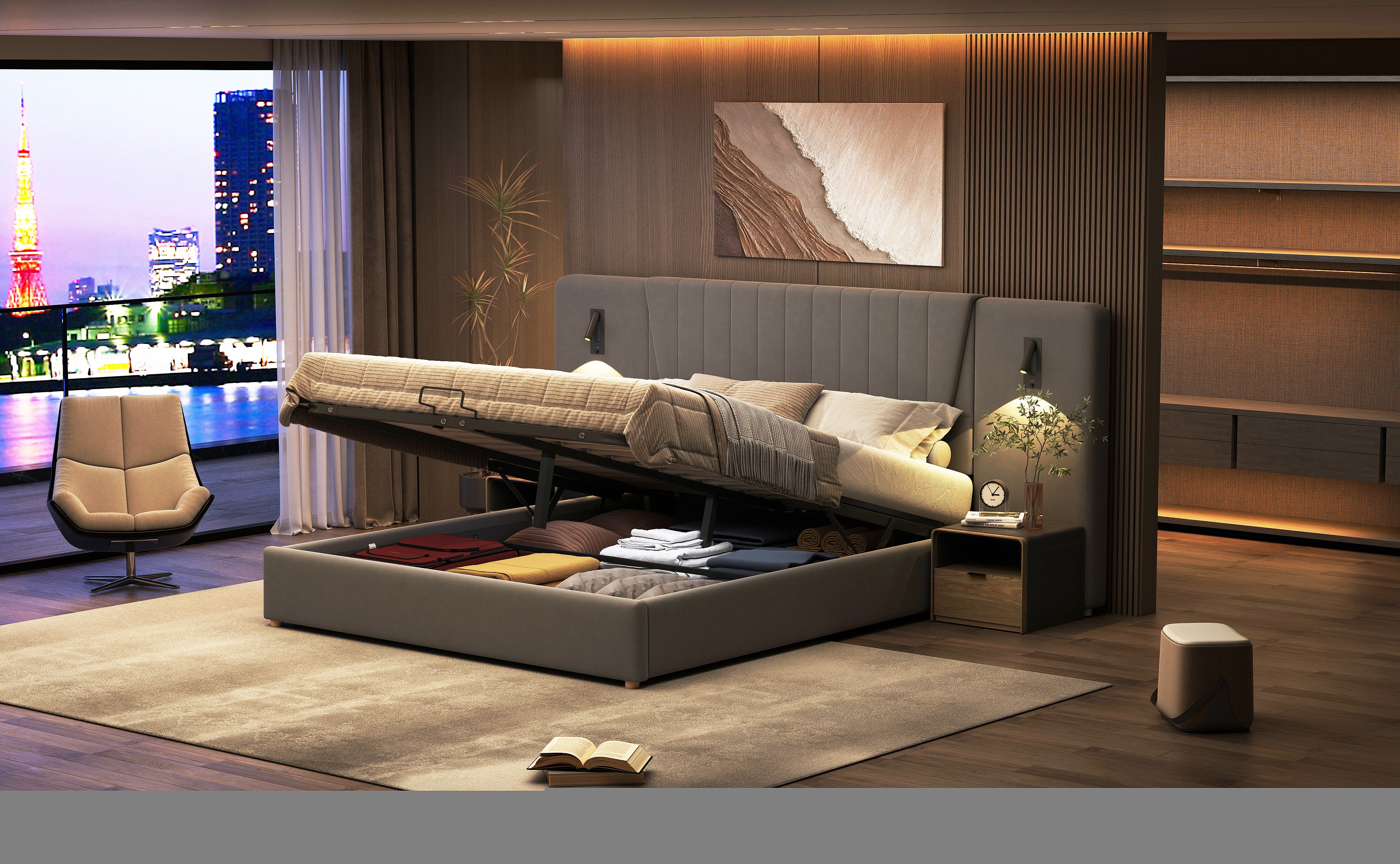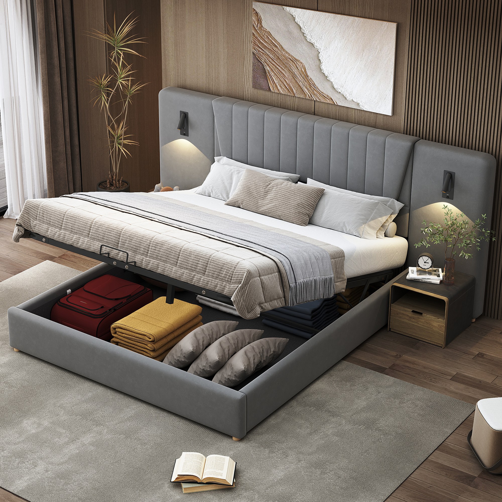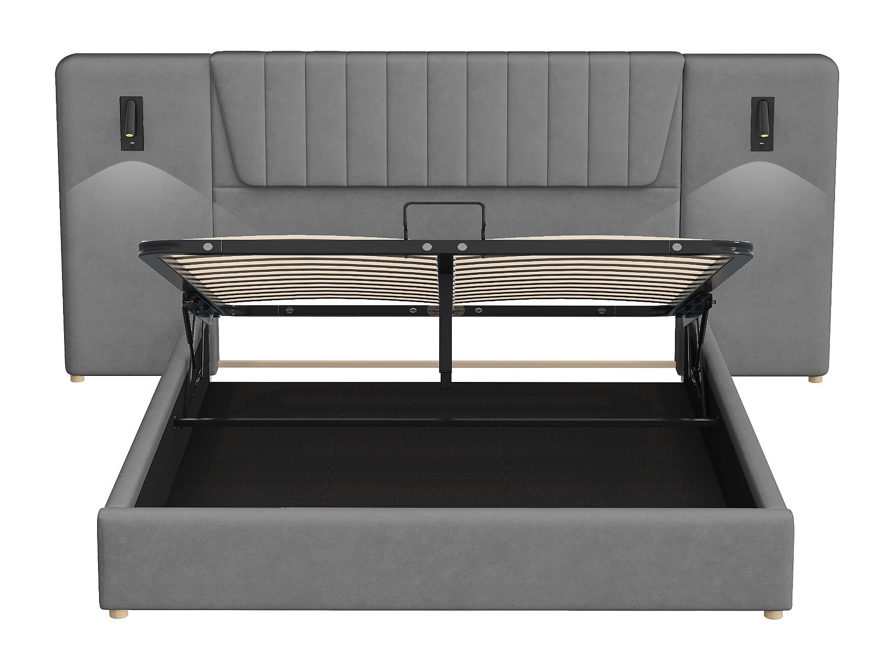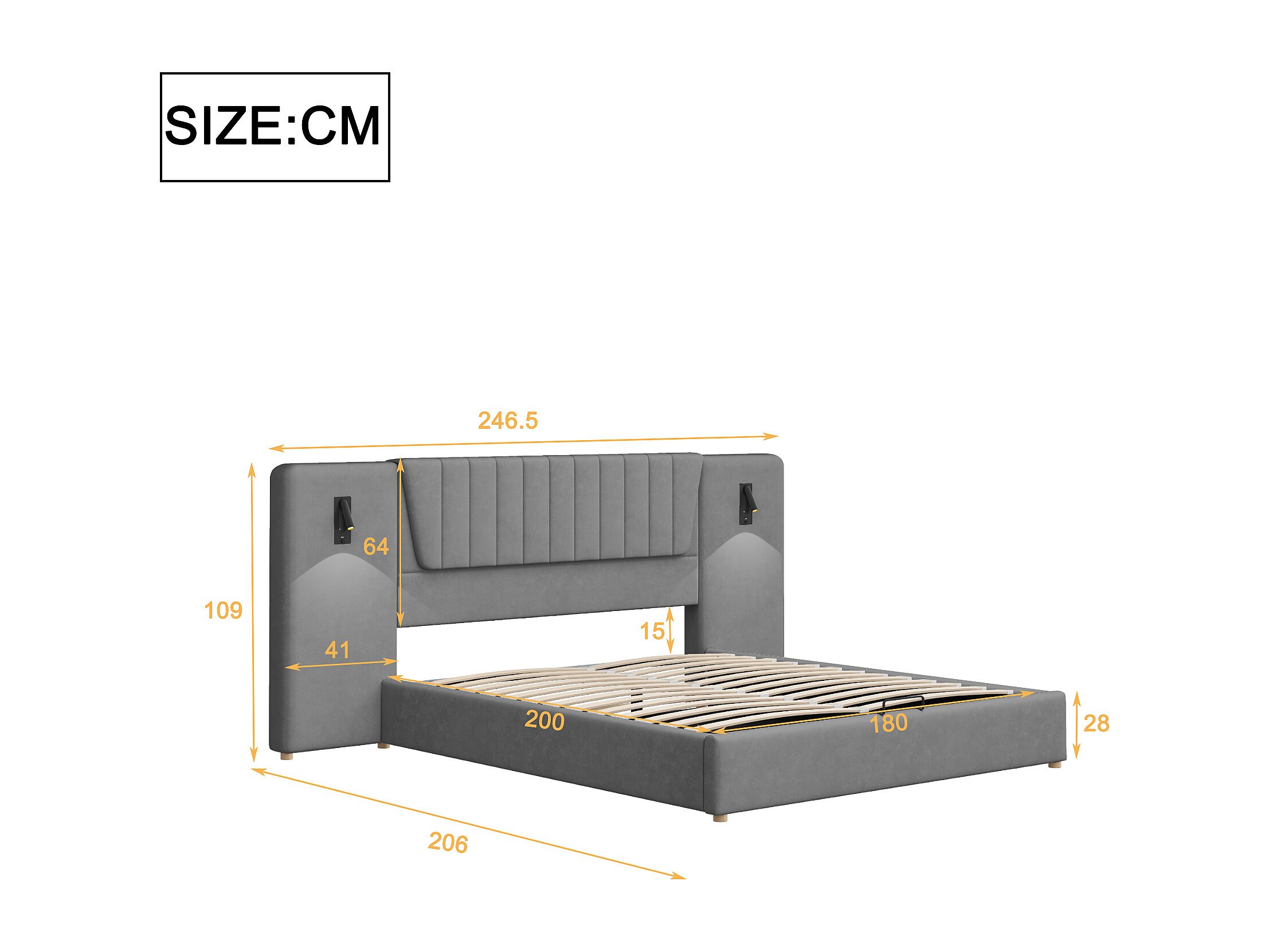 Lit rembourré 180×200 cm, avec dossier extra long, lampes de lecture pivotantes et port USB