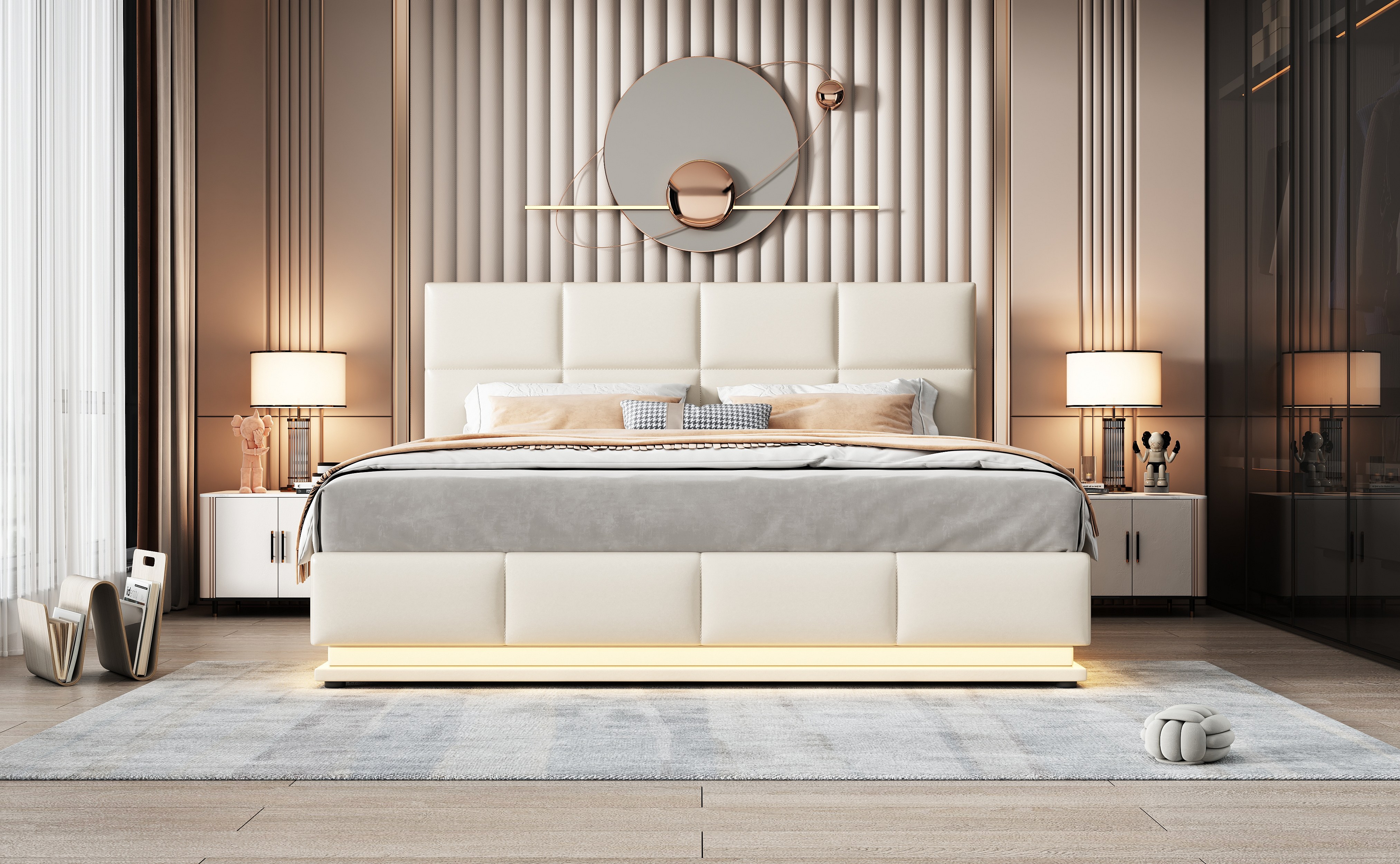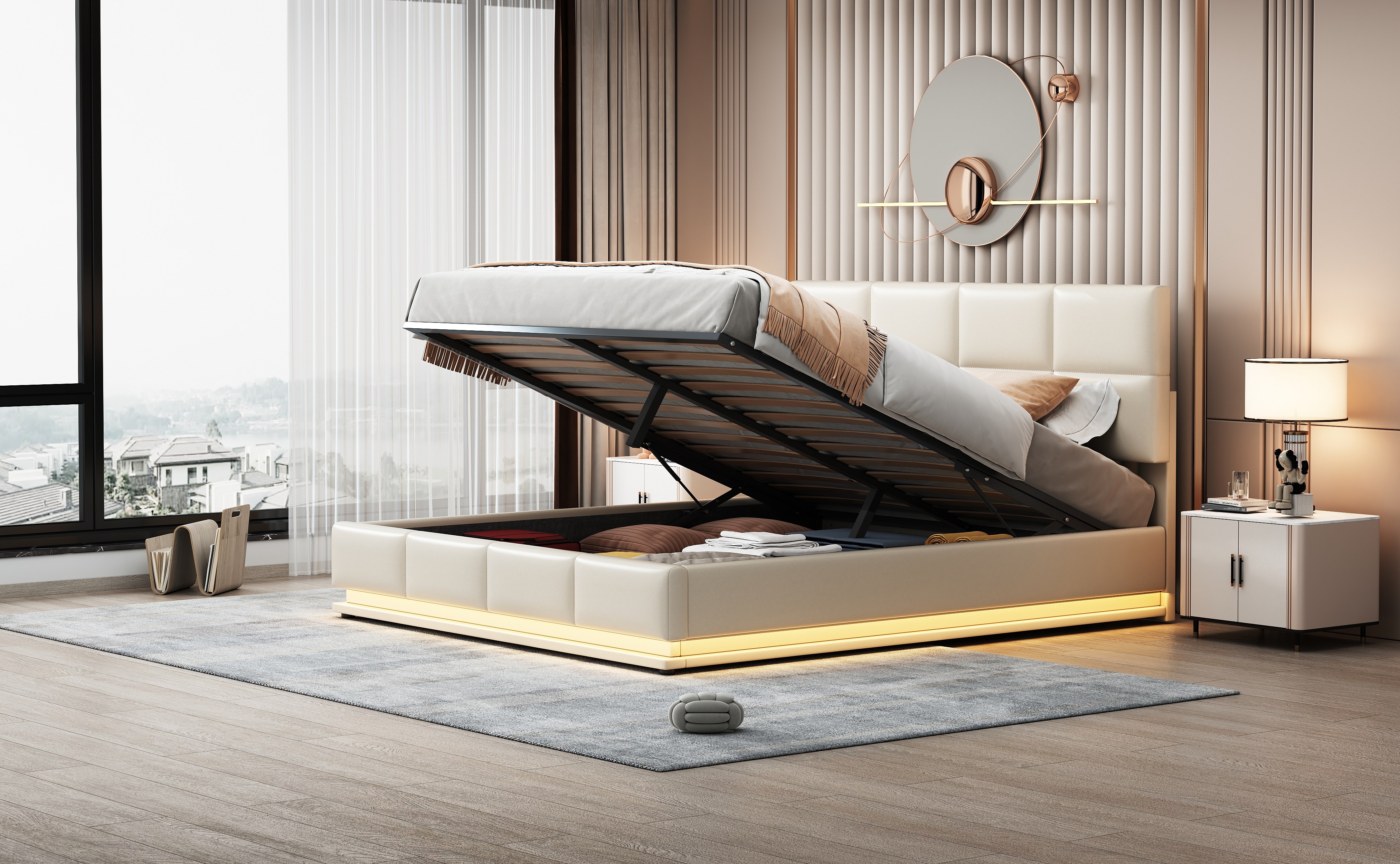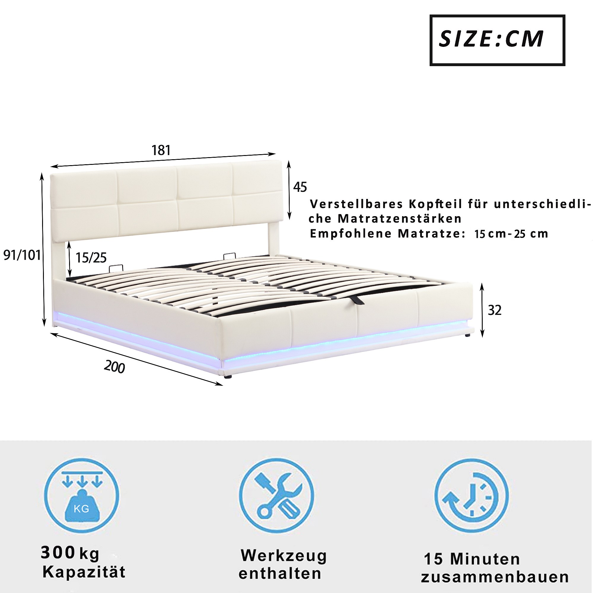 Lit rembourré 180x200 cm avec éclairage LED et espace de rangement hydraulique, beige
