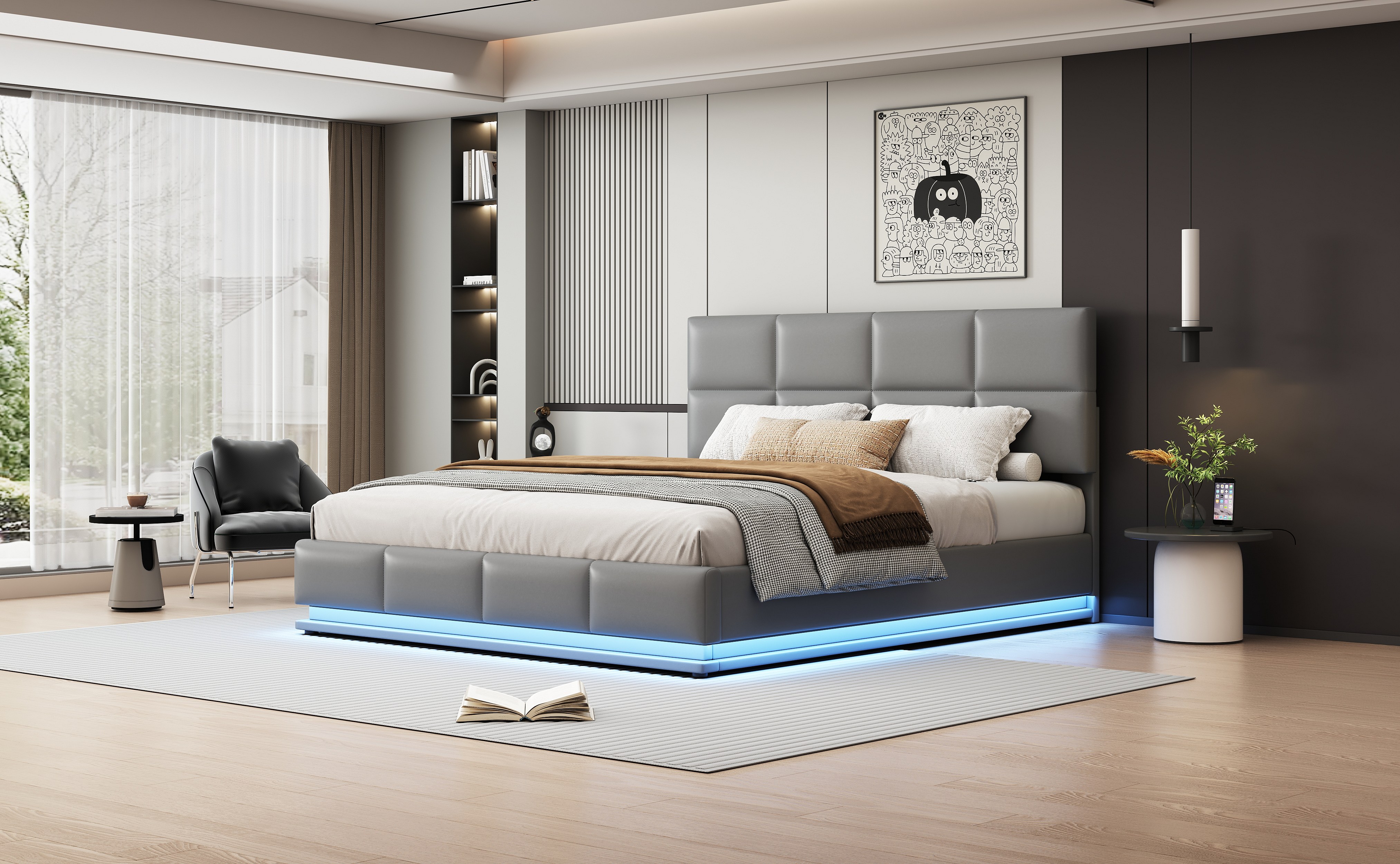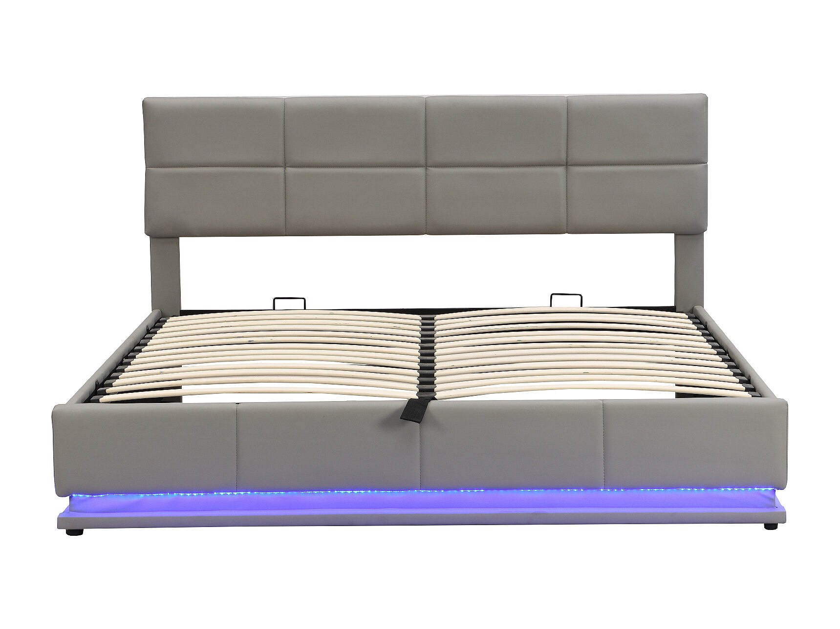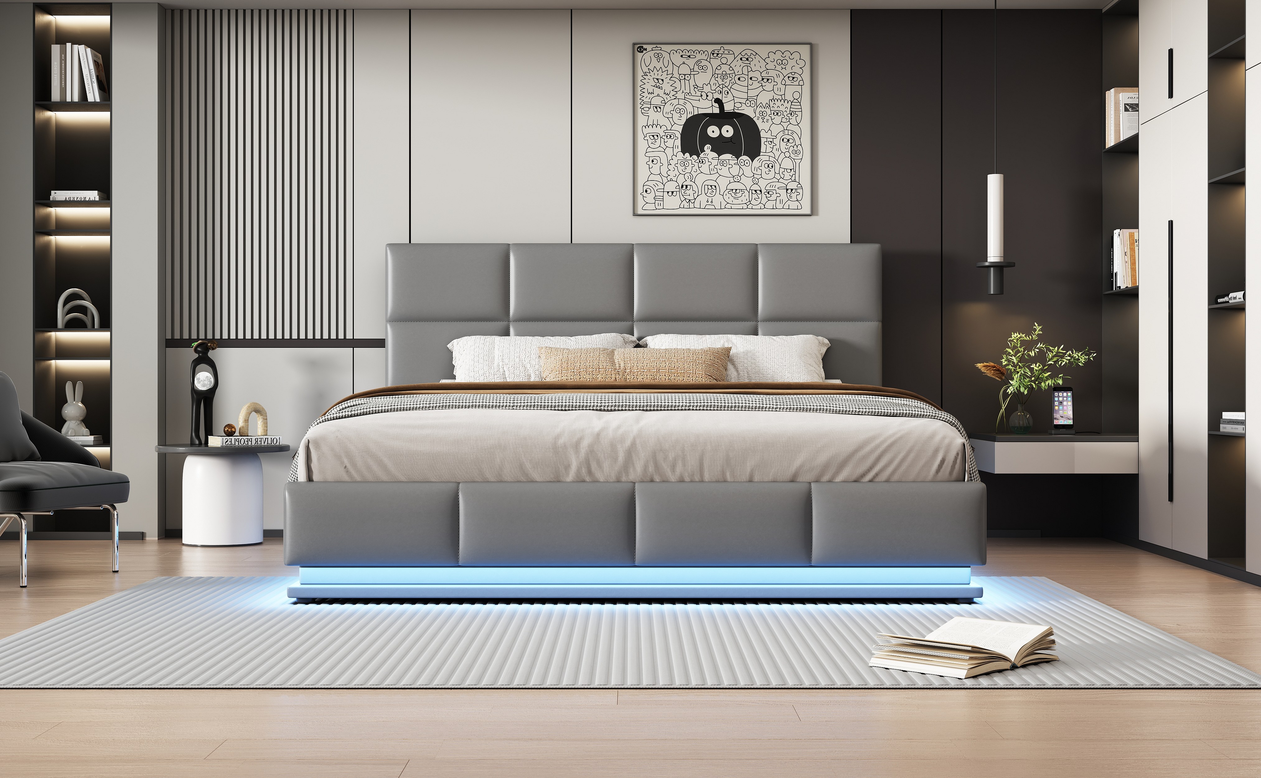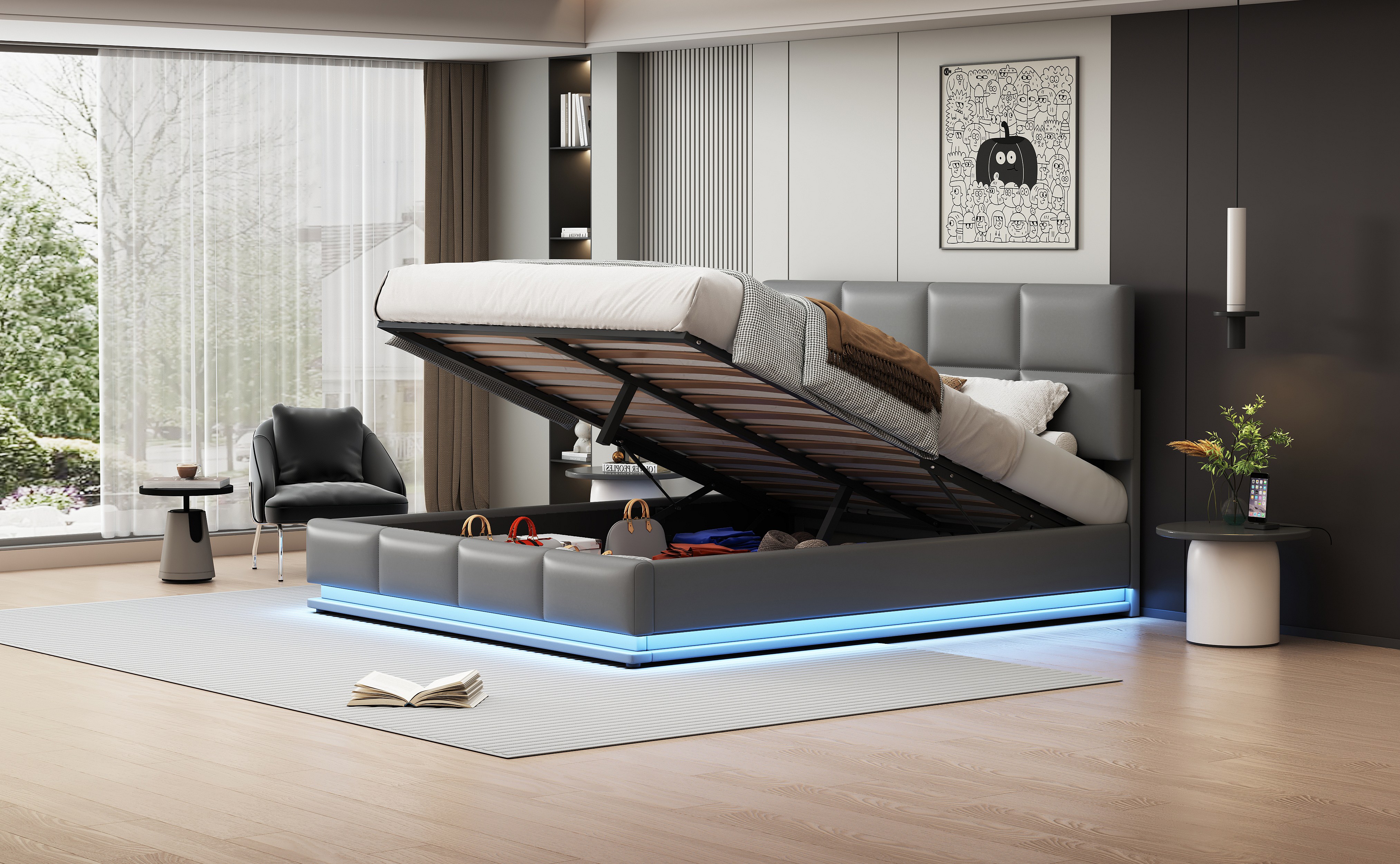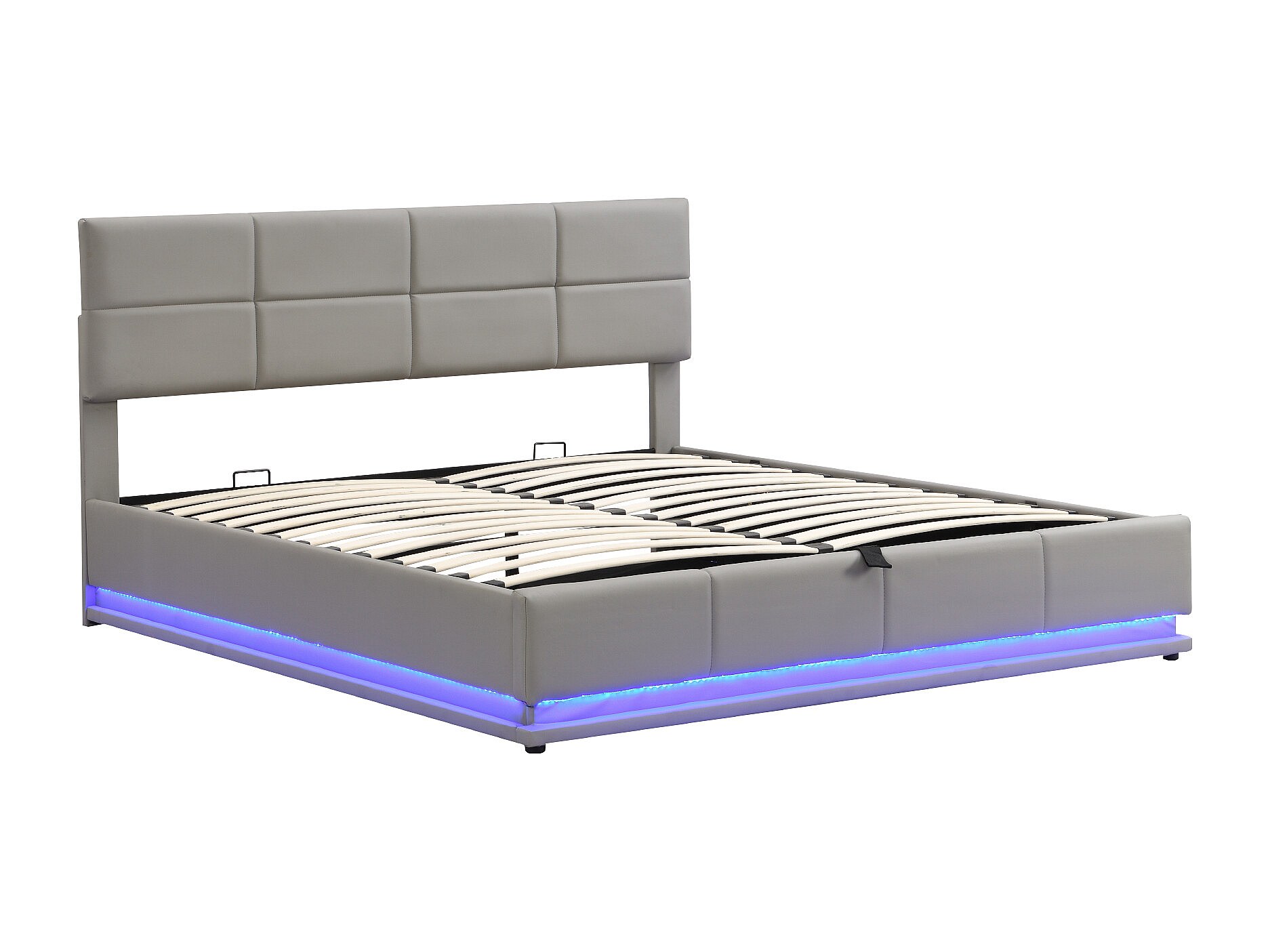Lit rembourré 180x200 cm avec éclairage LED et espace de rangement hydraulique, couleur gris ciment