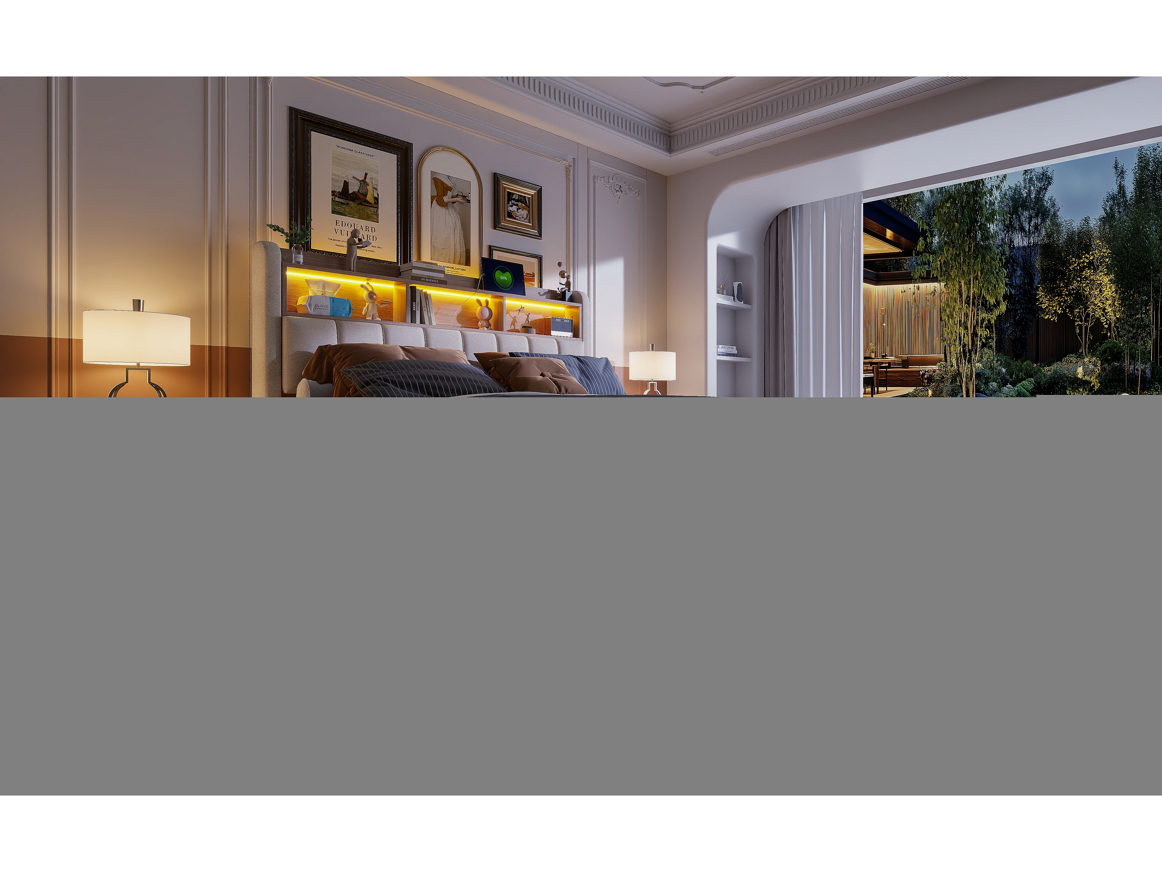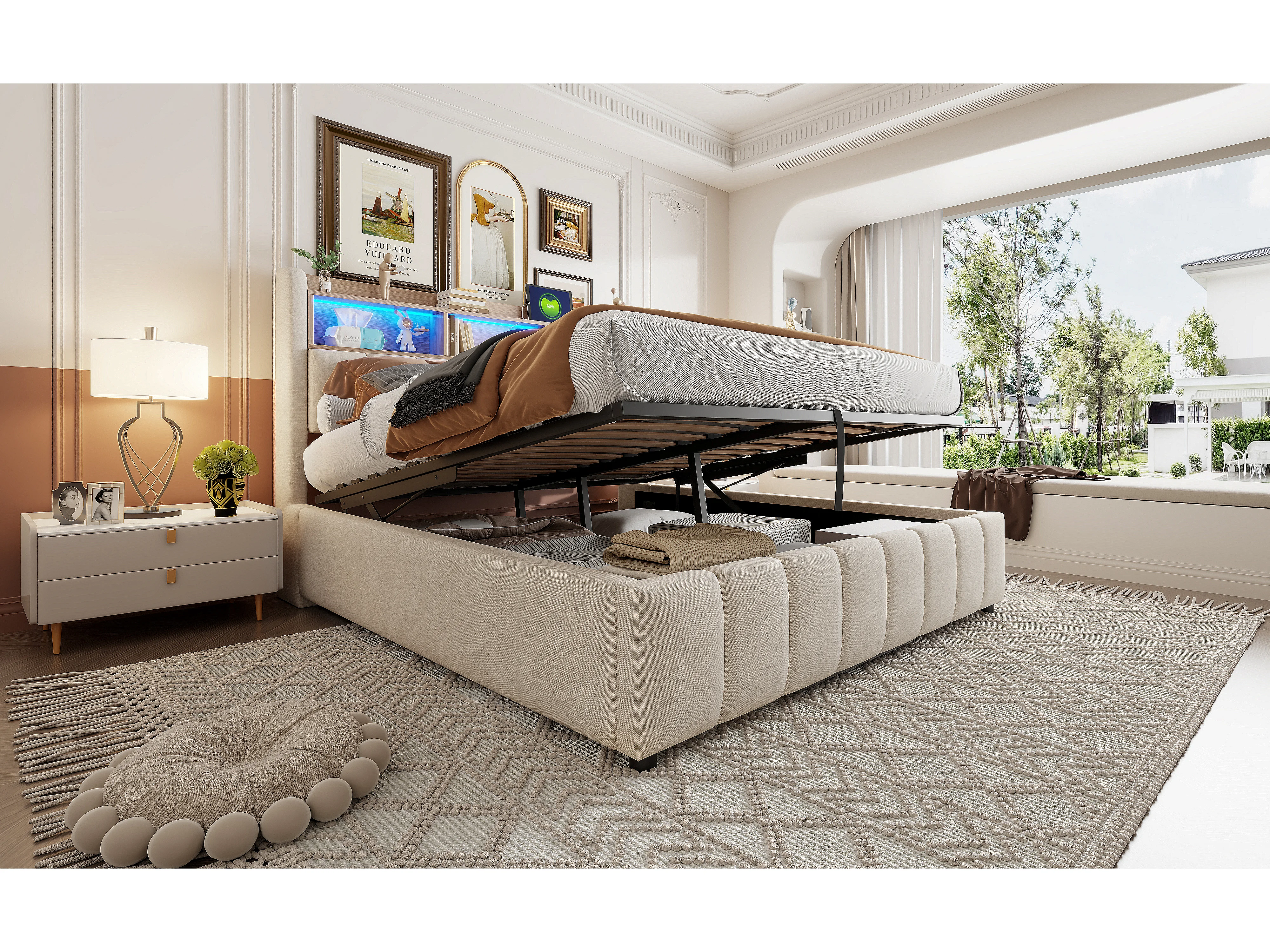 Lit rembourré 180×200 cm avec éclairage LED et prise USB, tête de lit avec étagères et rangement, hydraulique
