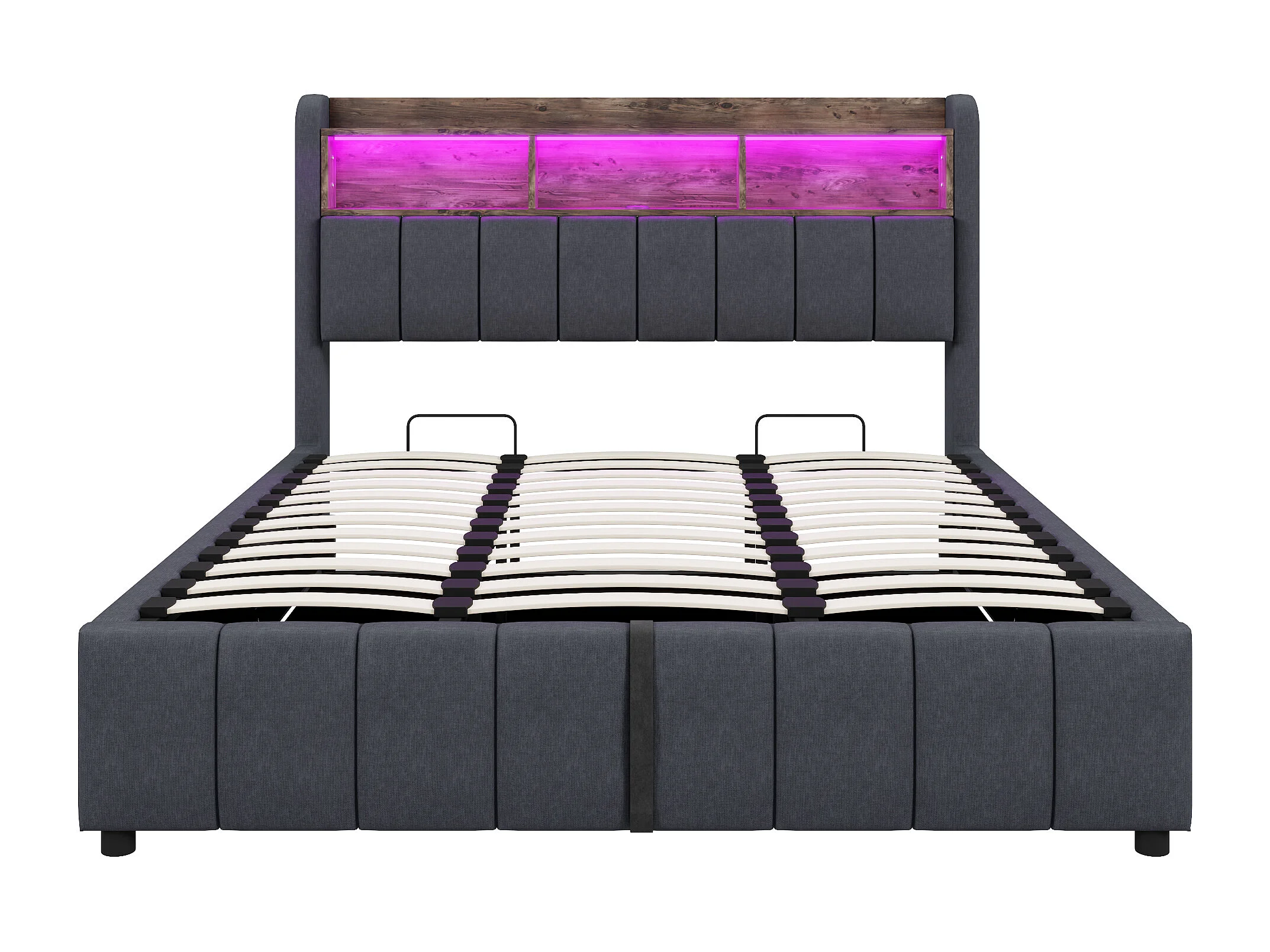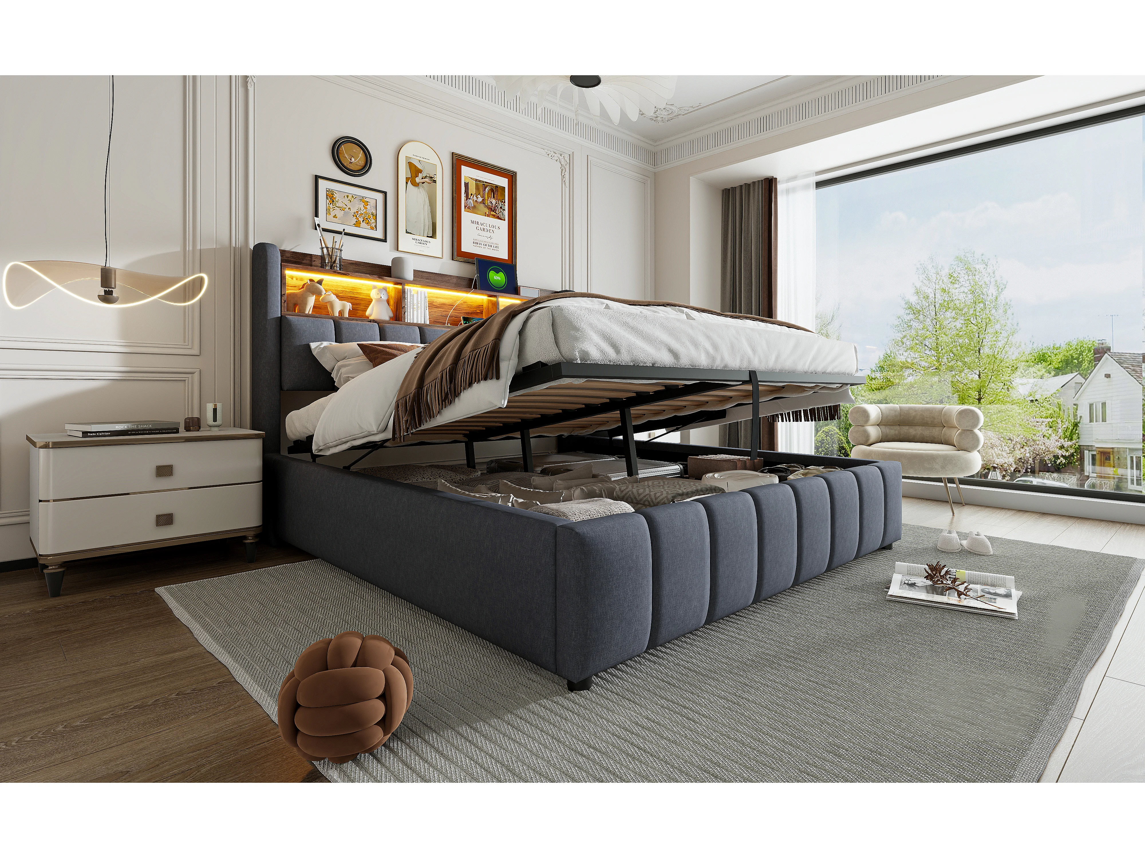Lit rembourré 180×200 cm avec éclairage LED et prise USB, tête de lit avec rangement et hydraulique