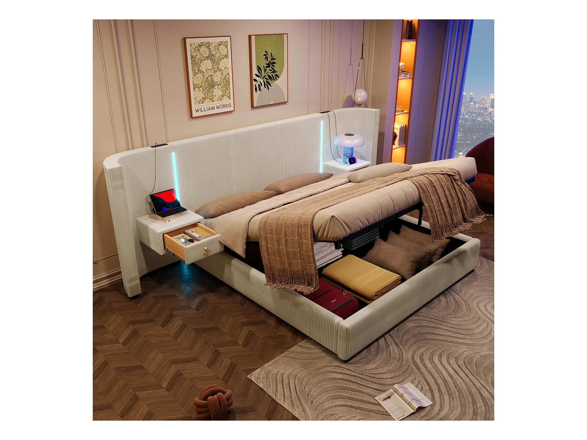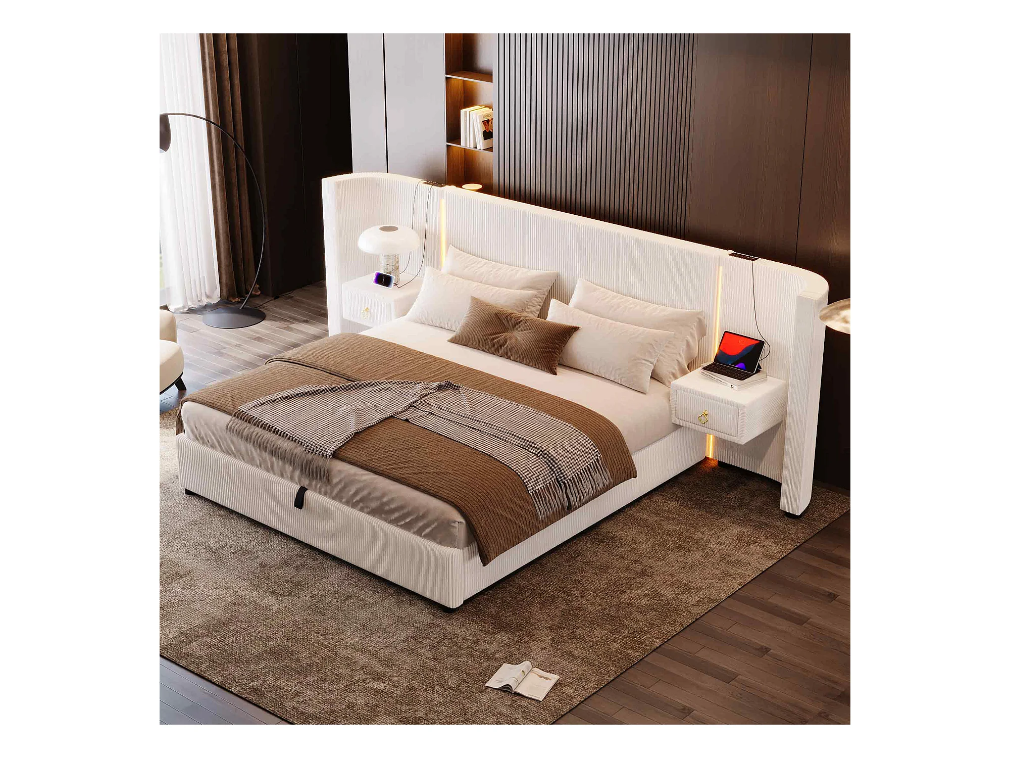 Lit rembourré 180x200 cm avec LED, rangement hydraulique, 2 tiroirs, sans matelas, USB + Type-C, velours, Beige