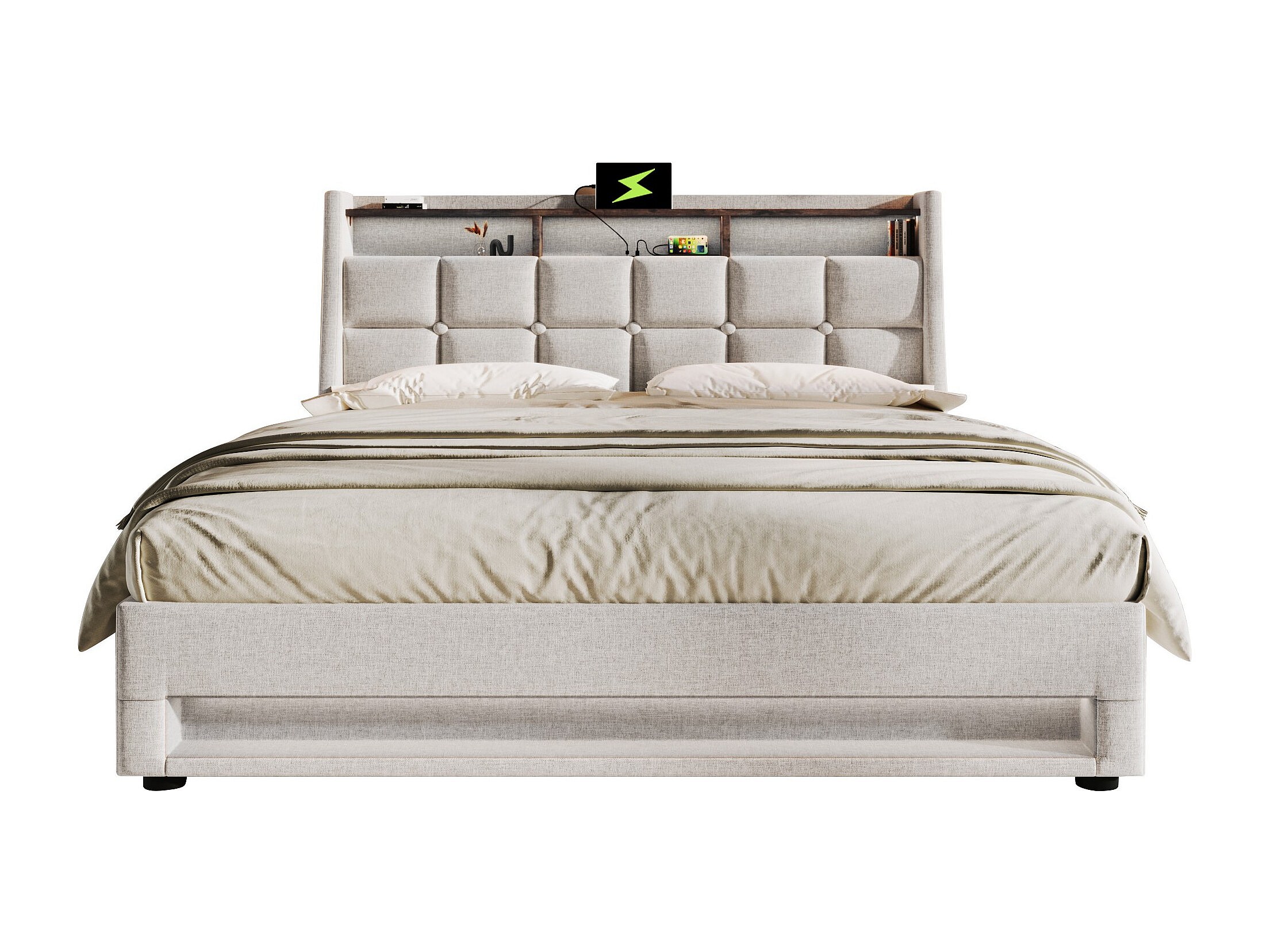Lit rembourré 180x200 cm en lin beige avec éclairage LED et USB, tête de lit confortable
