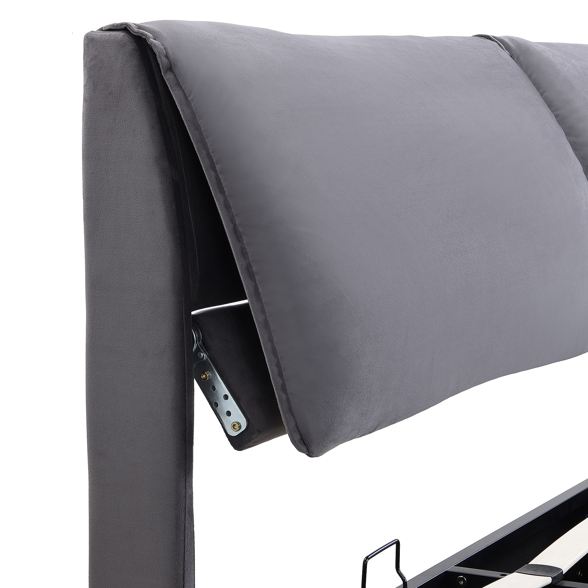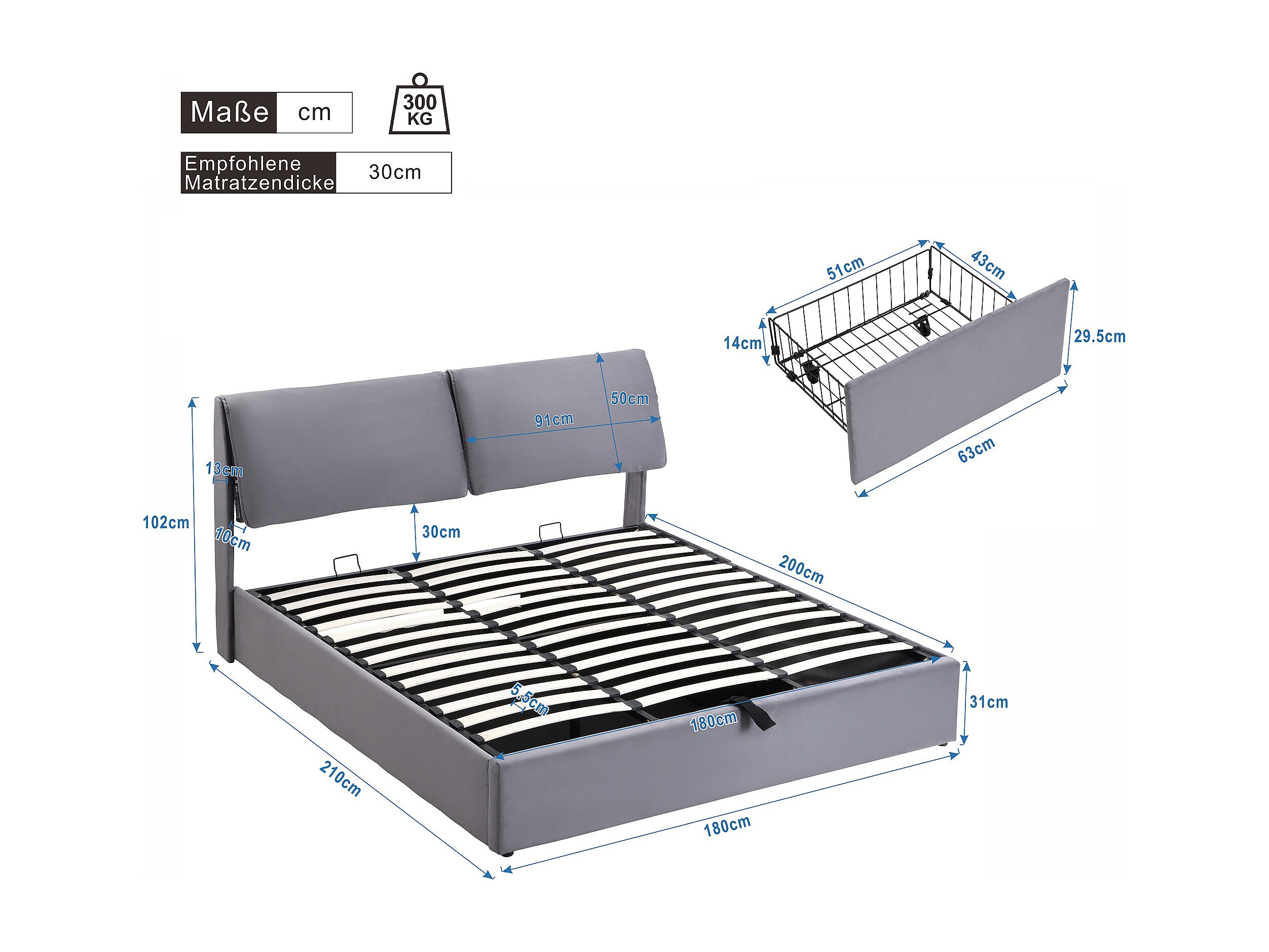 Lit rembourré 180×200 cm, gris, avec tête de lit réglable, trois tiroirs et coffre de rangement
