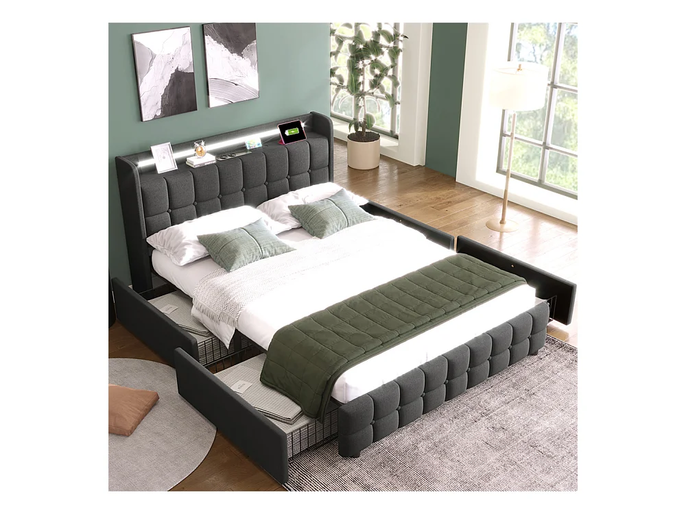 Lit rembourré 180x200 cm lit de rangement lit 4 tiroirs lit éclairage led lit sommier à lattes en bois lit double lin gris