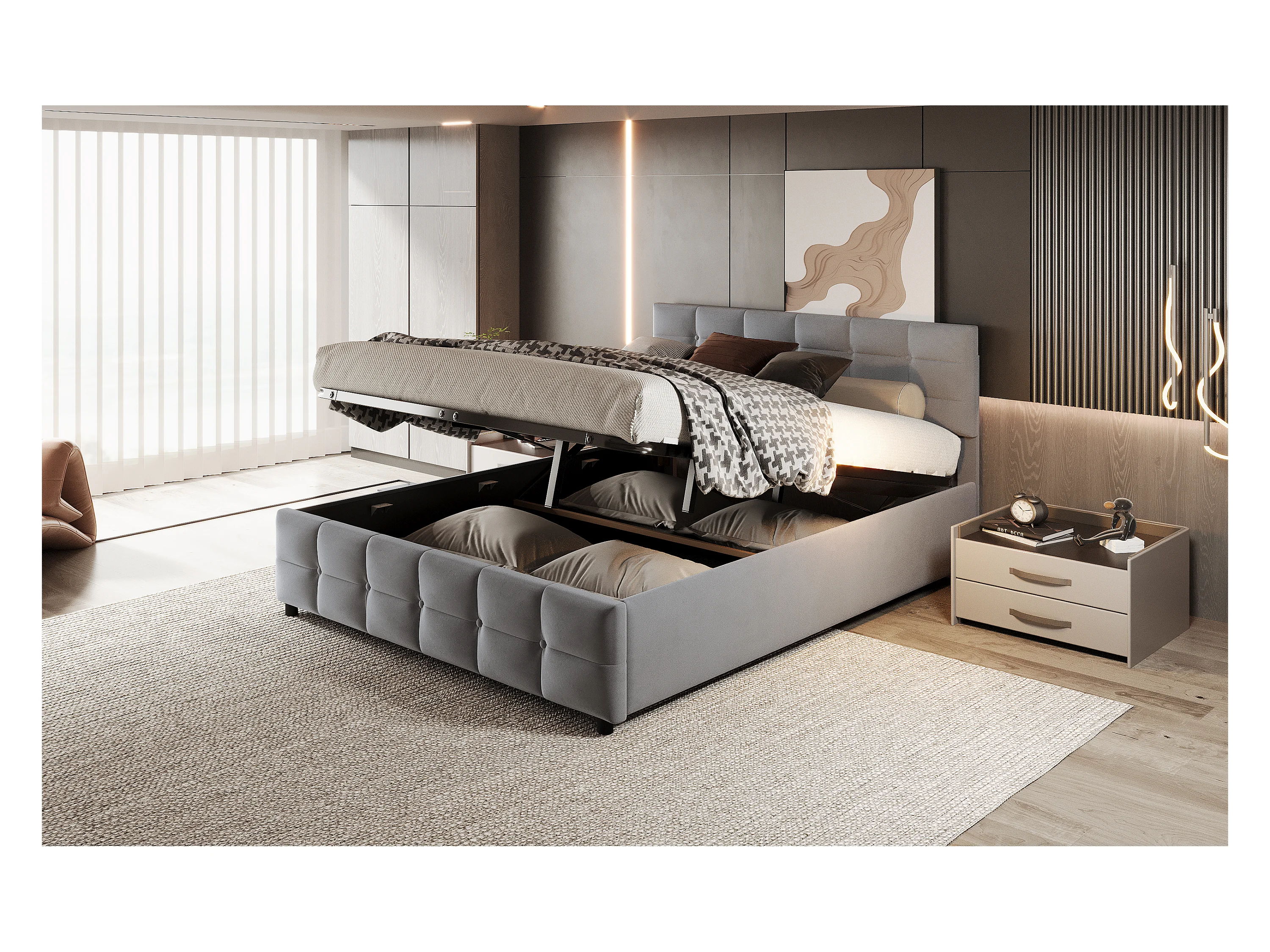 Lit rembourré 180x200 cm, sommier inclus, coffre hydraulique, velours gris, design pratique