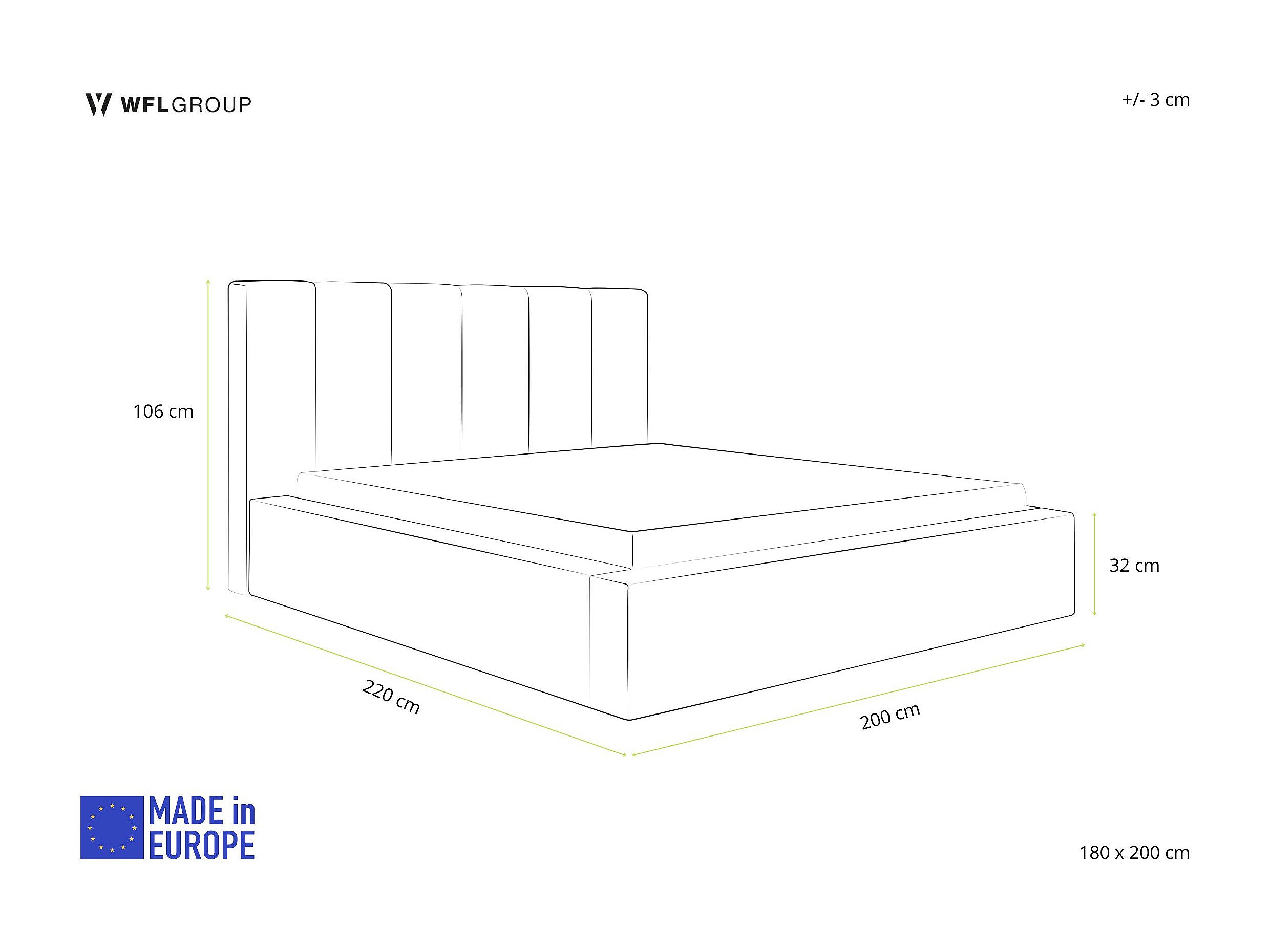 – 160x200 (longueur 220 cm, largeur 180 cm, hauteur 106 cm)