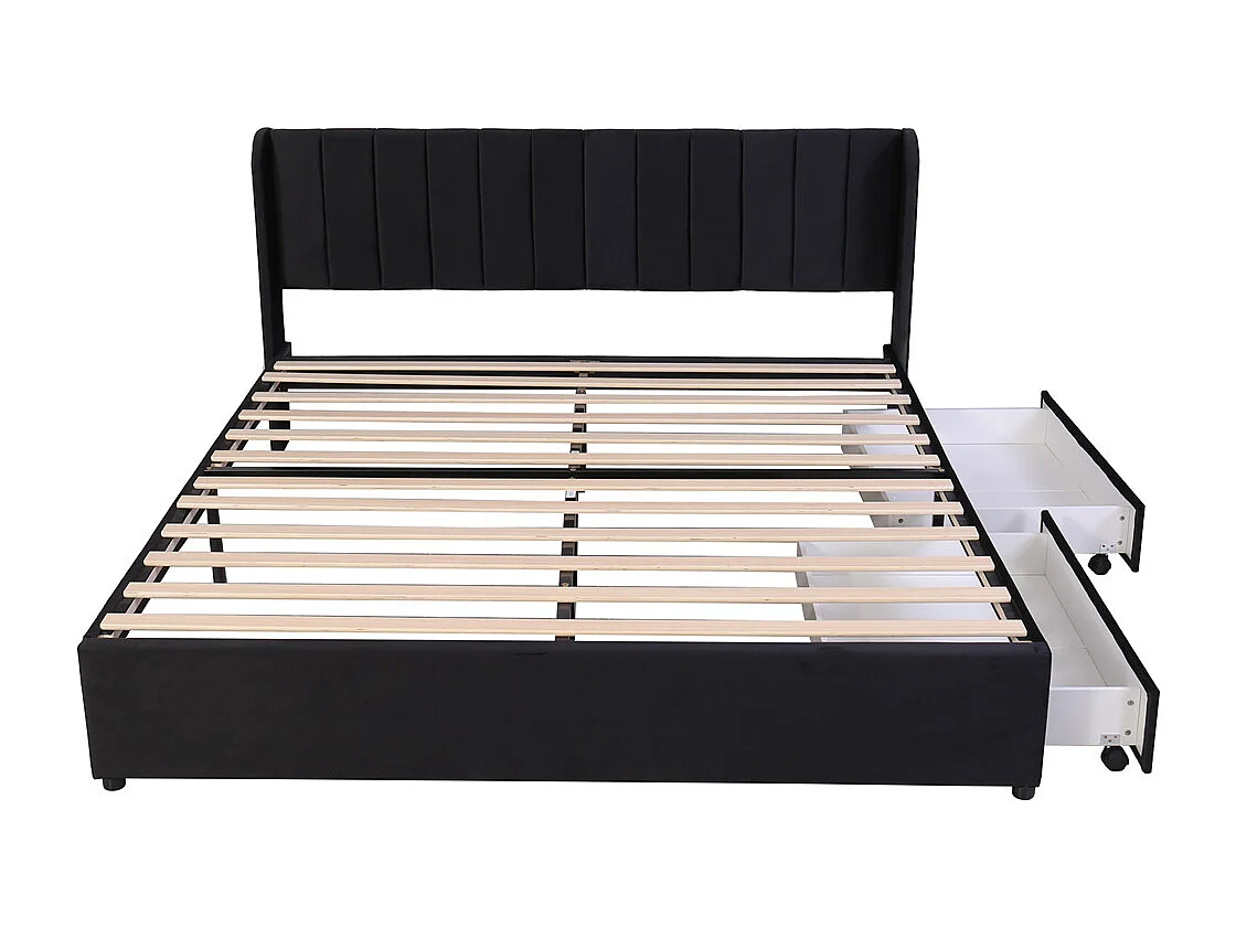 Lit rembourré 180x200cm, avec sommier à lattes, dossier et 2 tiroirs, velours, noir, sans matelas