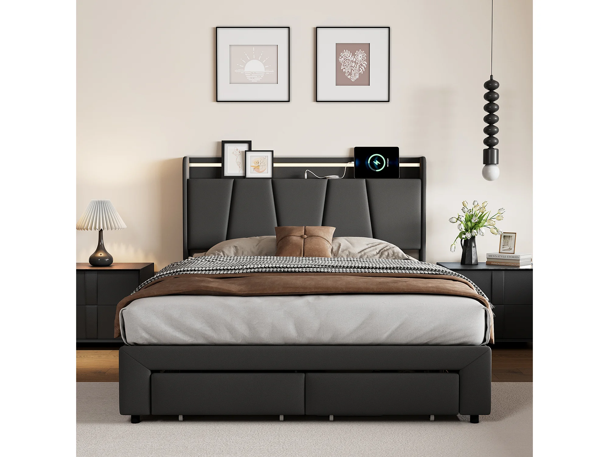 Lit rembourré 4 en 1 avec 2 tiroirs, lit de stockage hydraulique avec charge USB et éclairage LED - Gris foncé - Tissu de lin - 140 x 200 cm