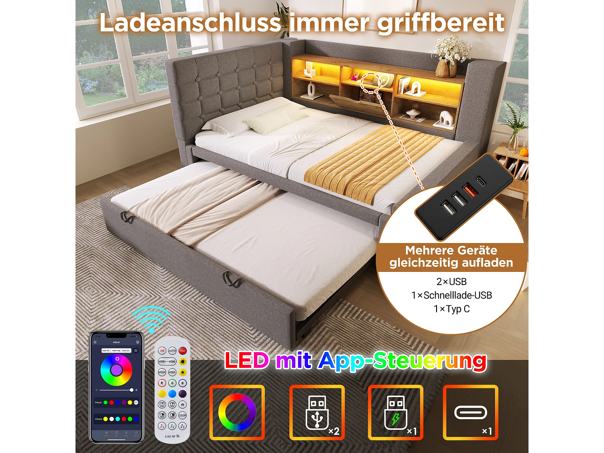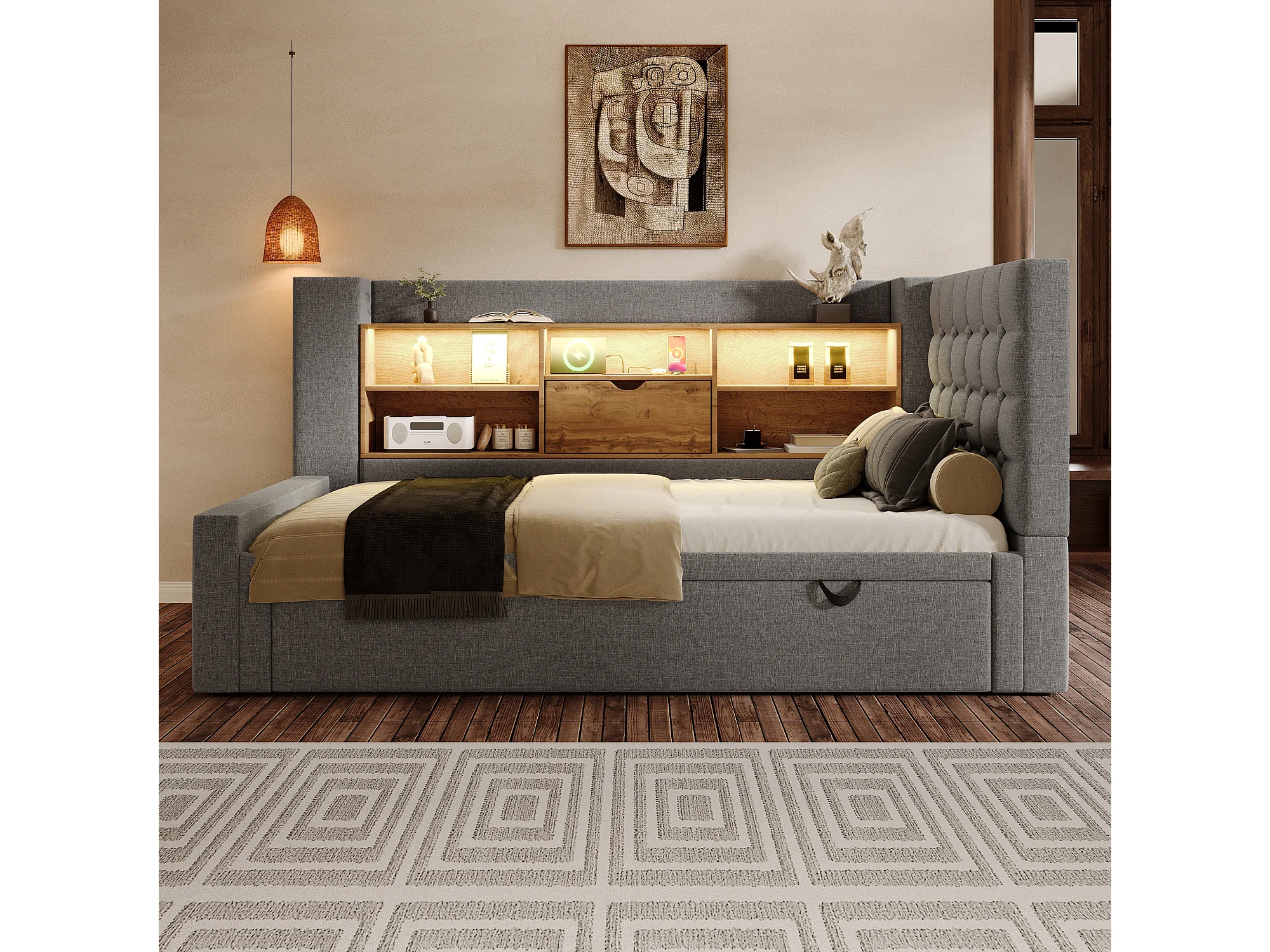 Lit rembourré 90 x 200 cm avec lit gigogne 90 x 190 cm - avec Leds + tête de lit de rangement - lin - gris