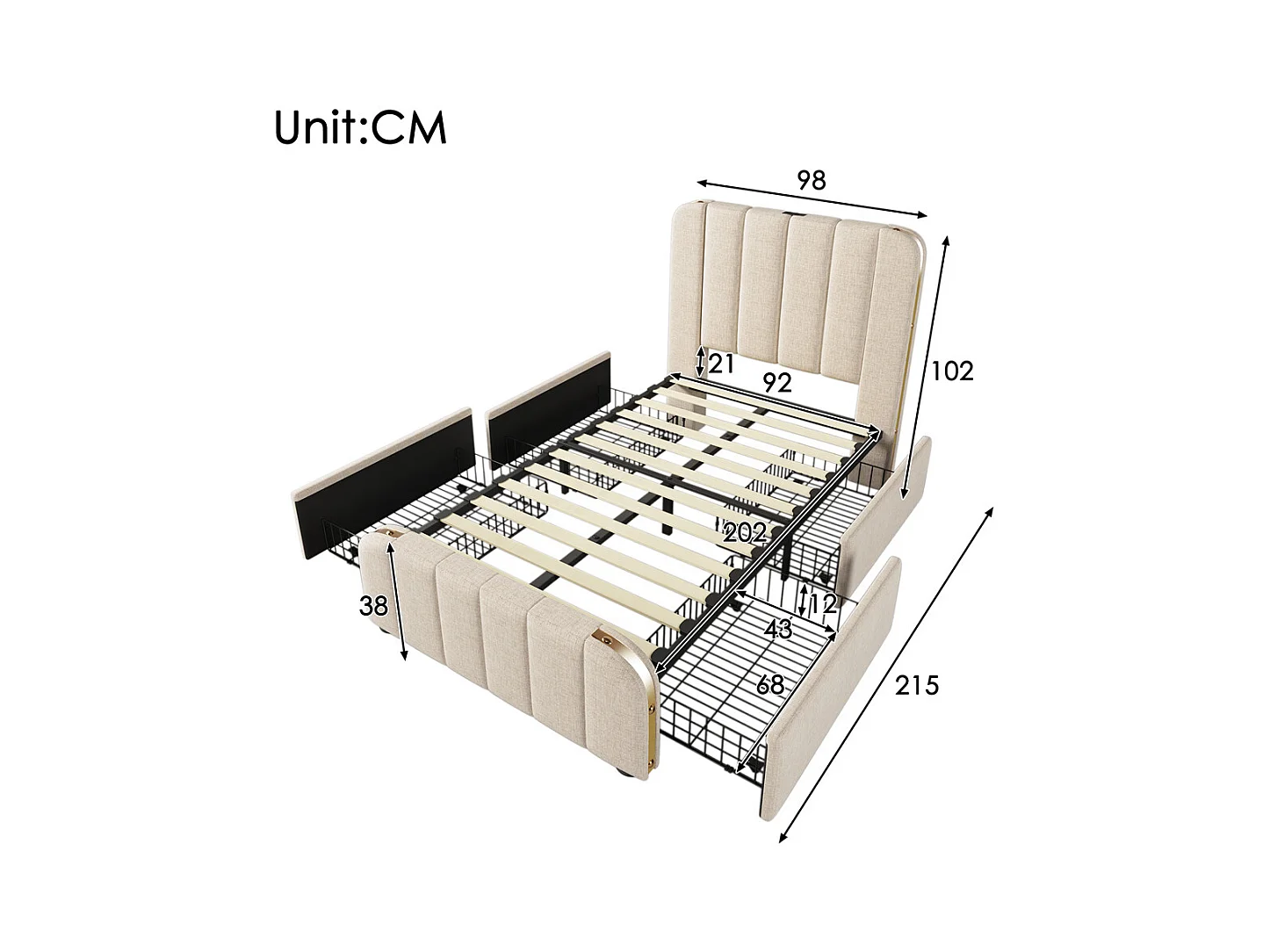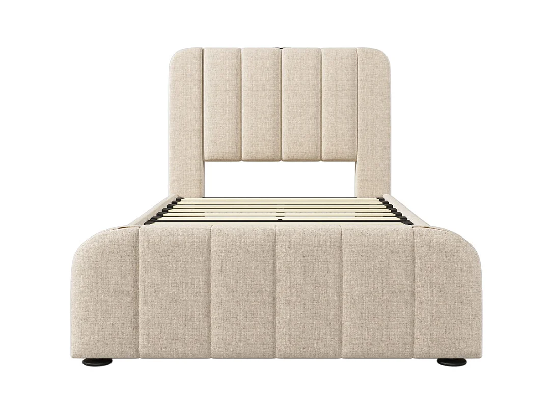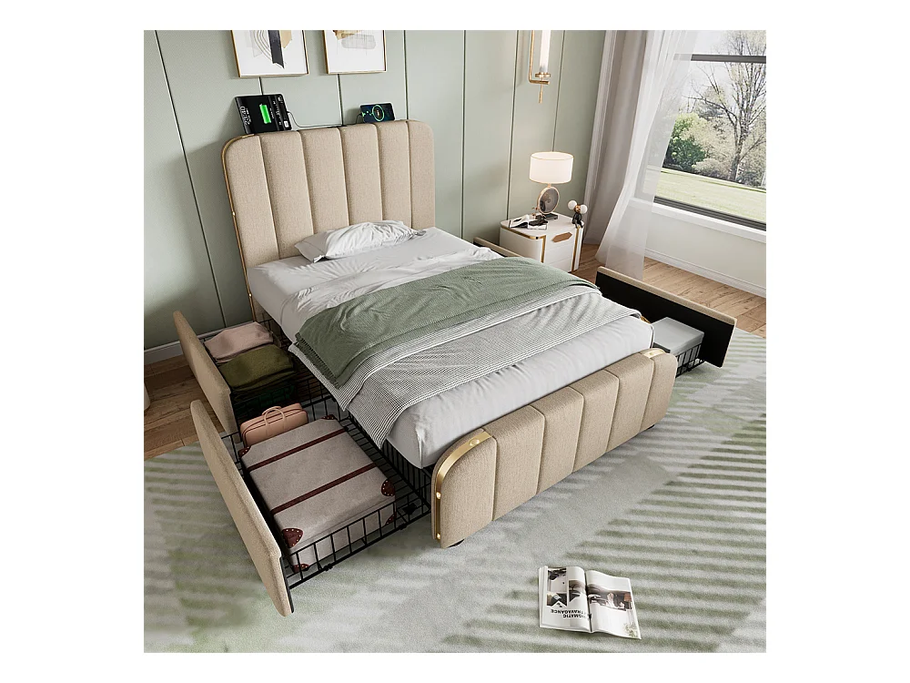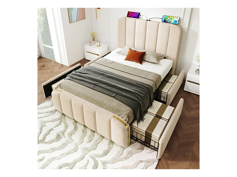 Lit rembourré 90 x 200 cm, lit simple avec 4 tiroirs, tête de lit avec fonction de recharge USB Type-C, lin, beige, sans matelas