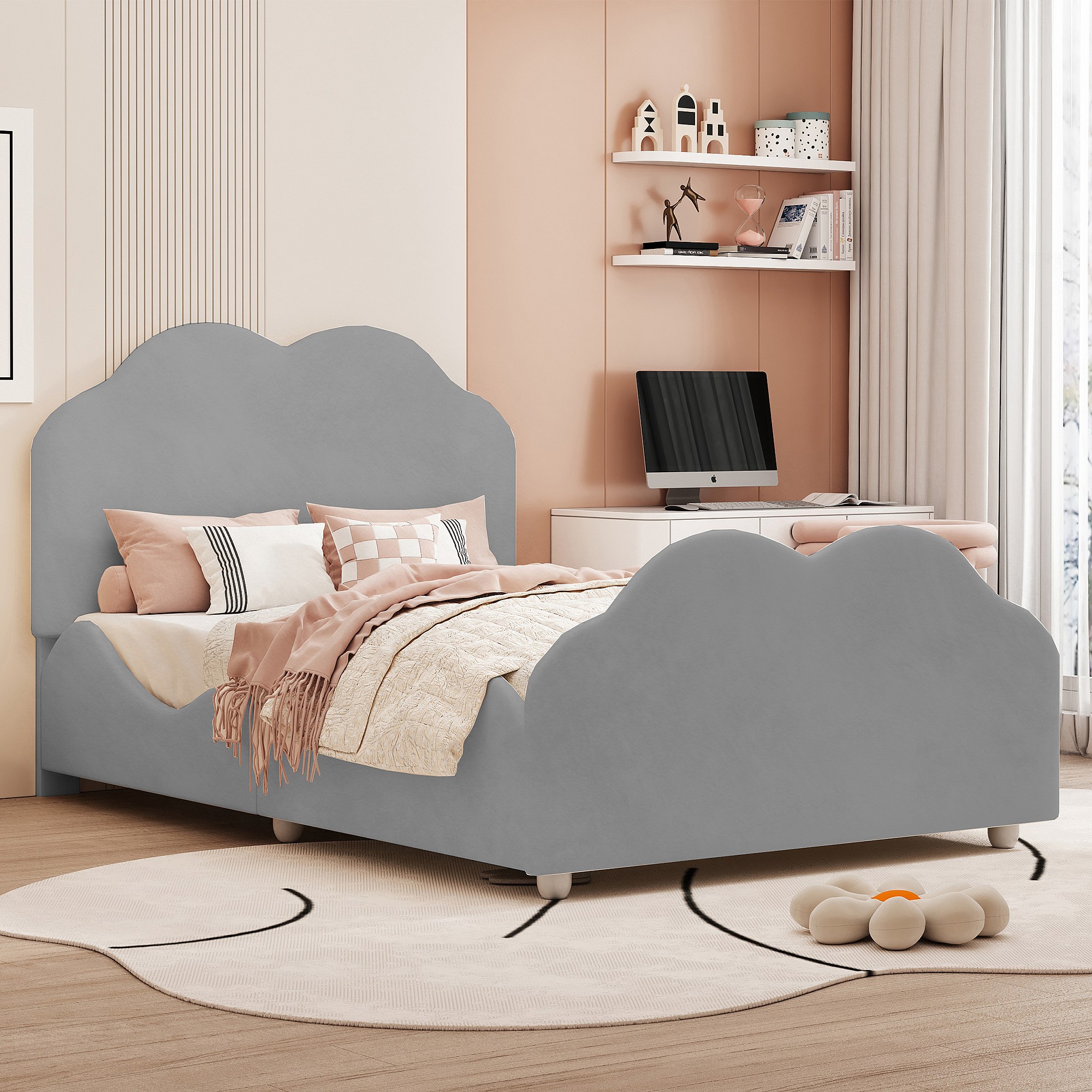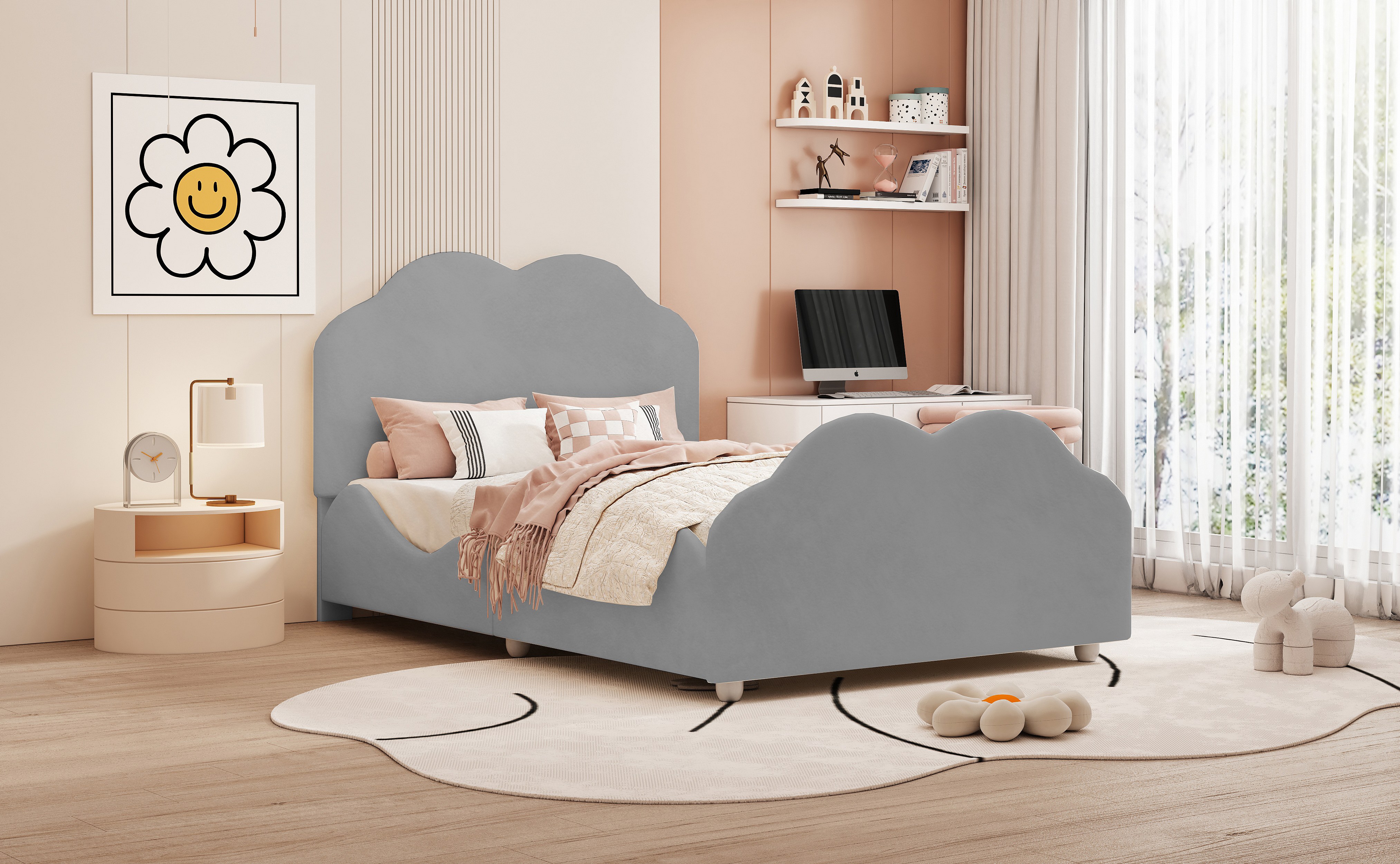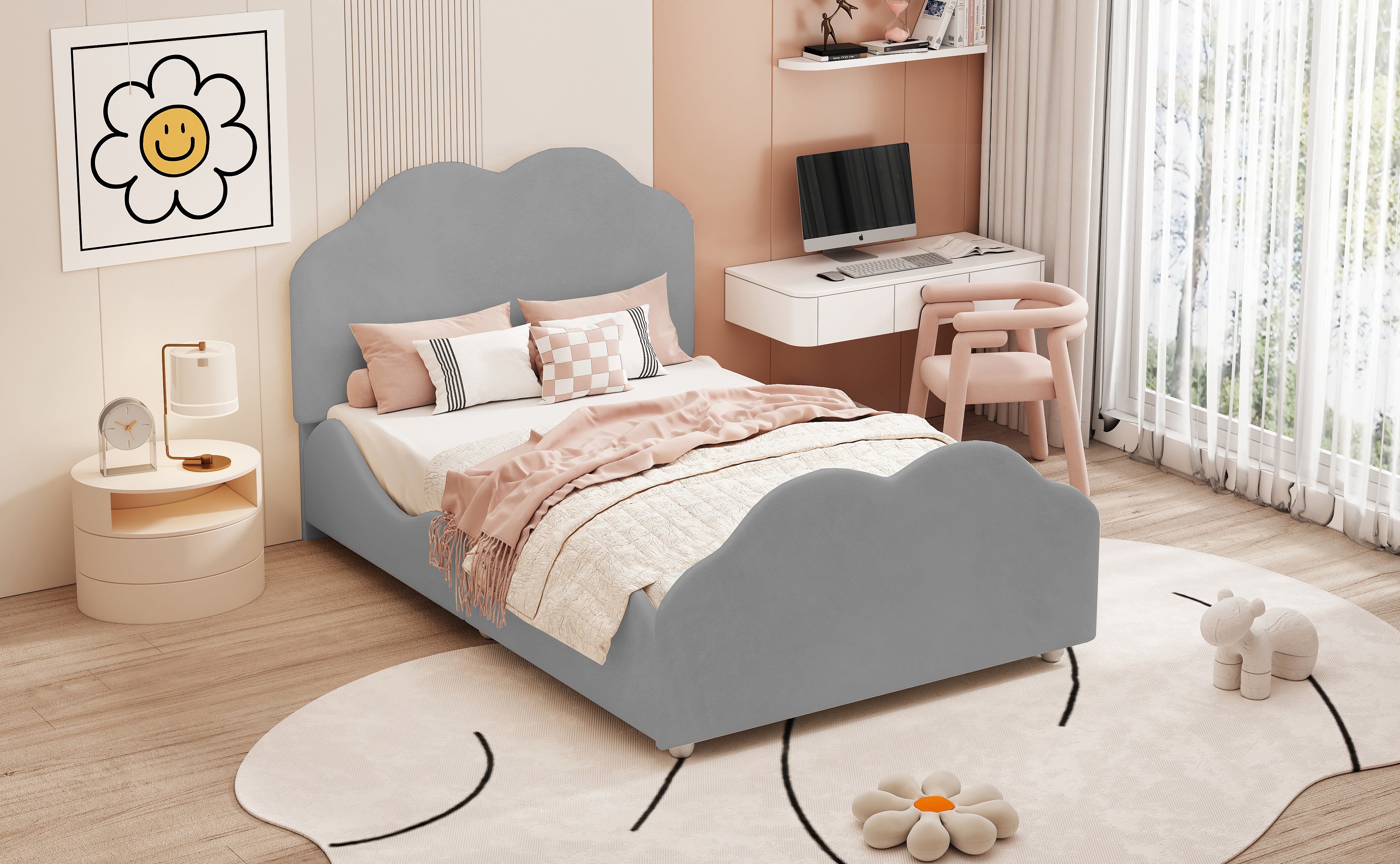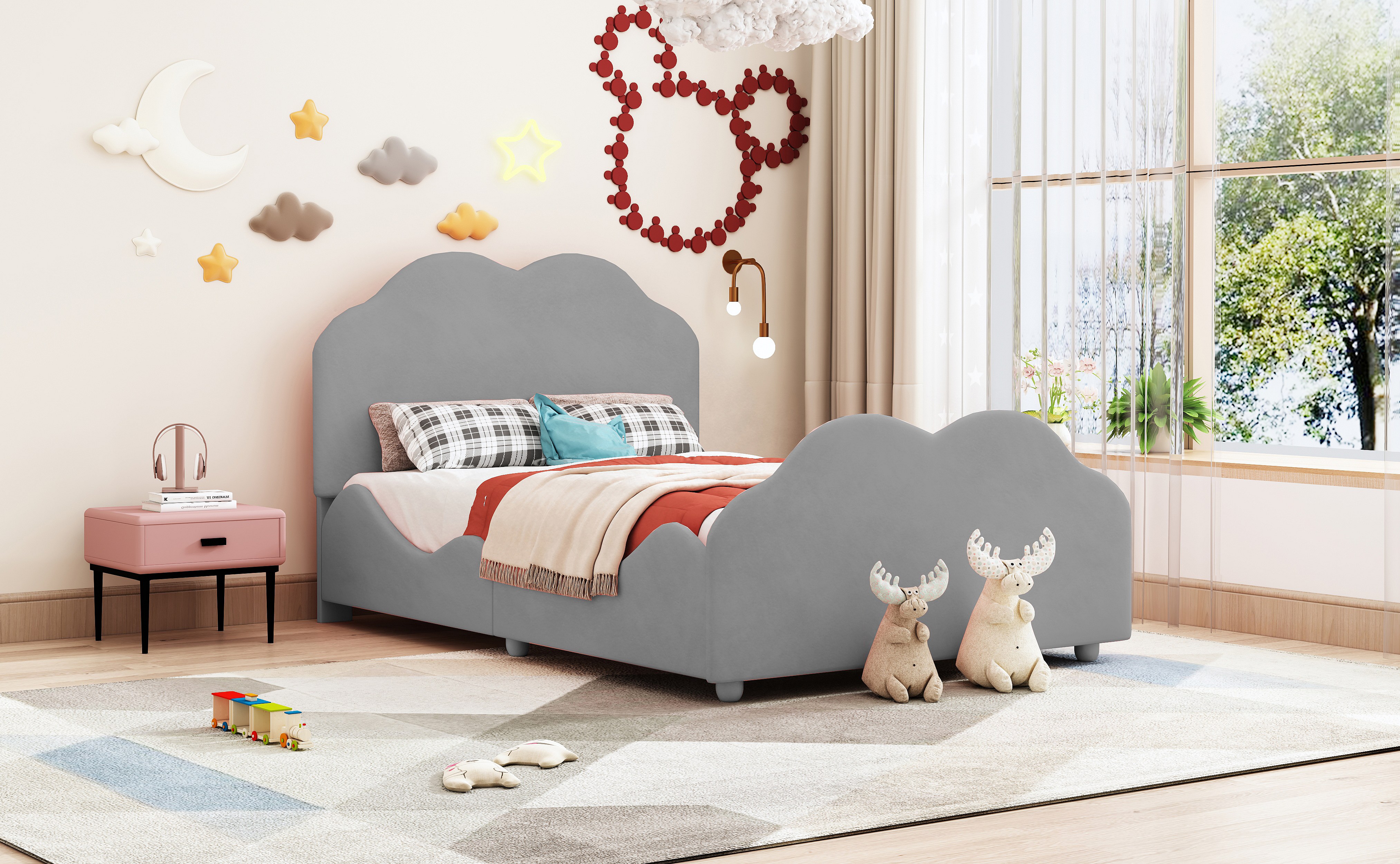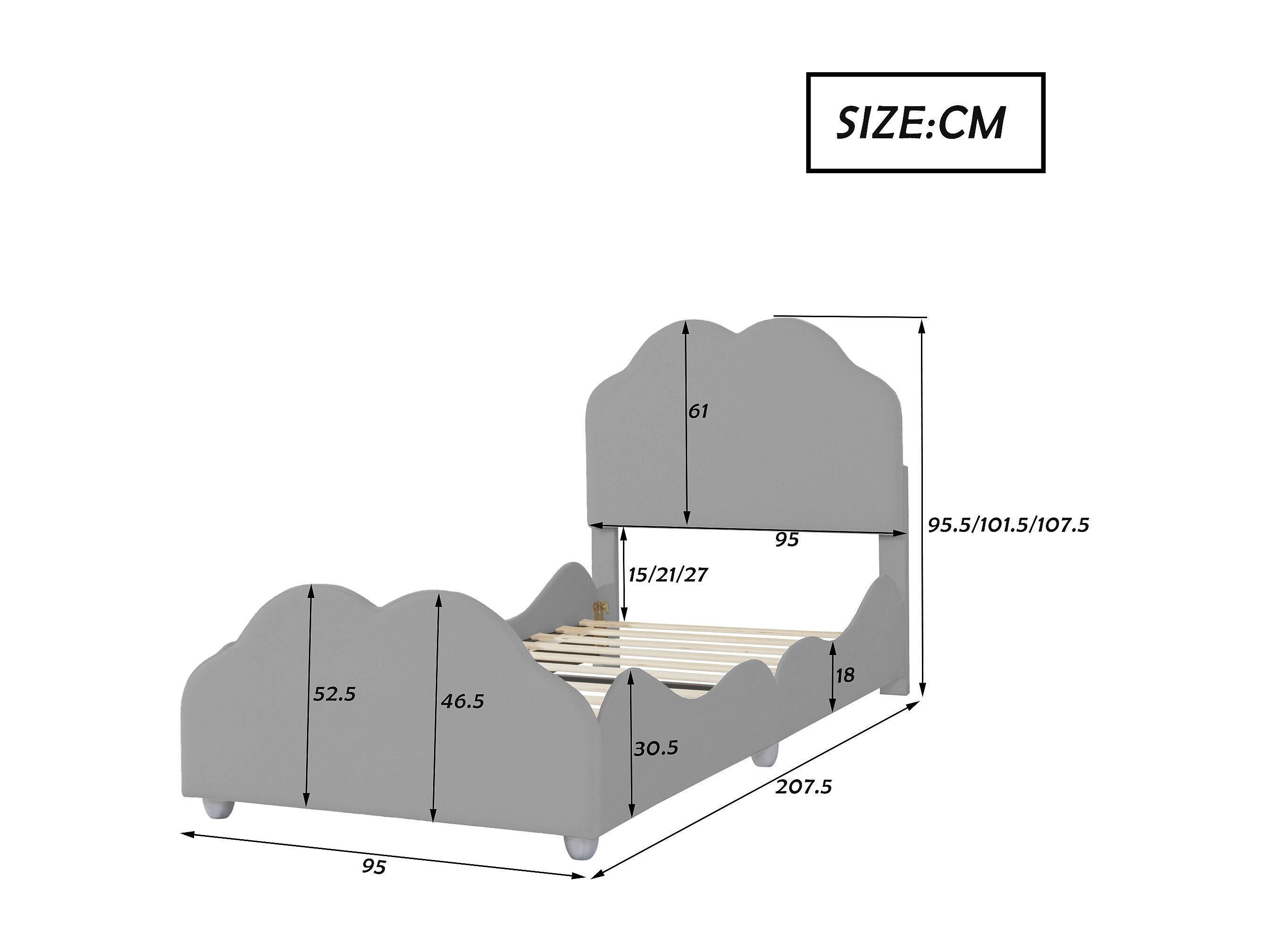 Lit rembourré 90x200 cm avec barrières hautes, tête et pied nuage, velours gris, lit enfant pratique