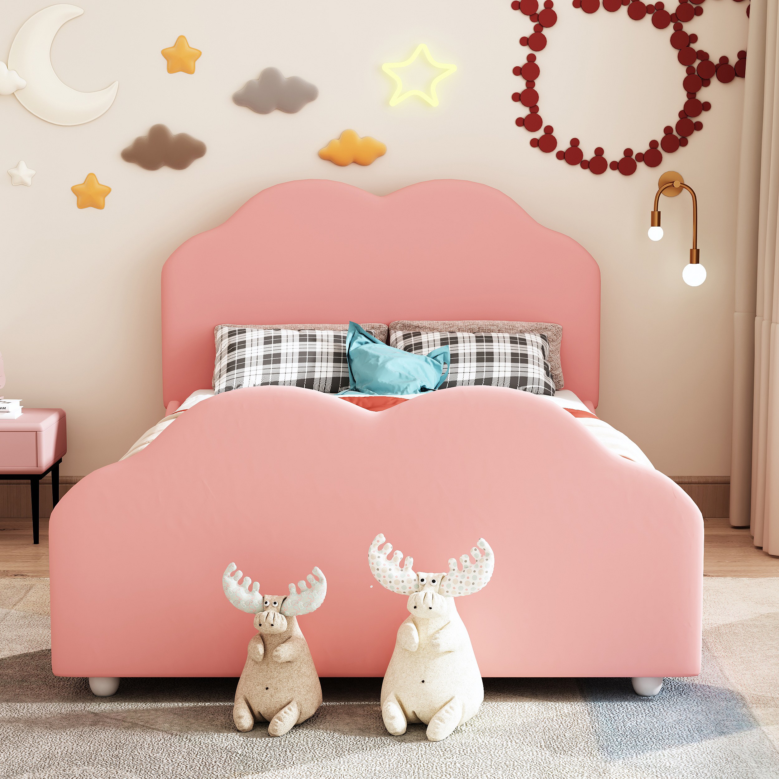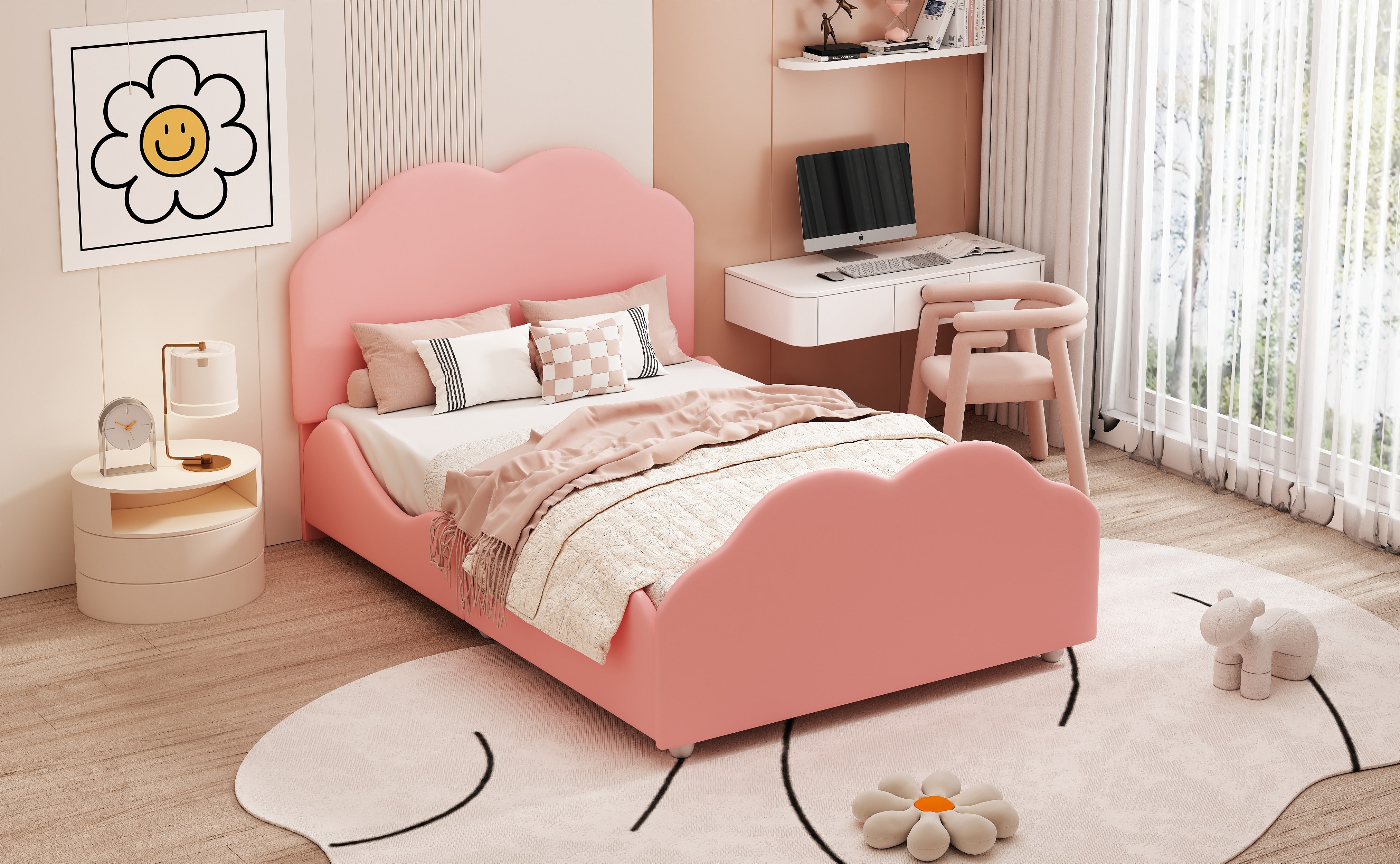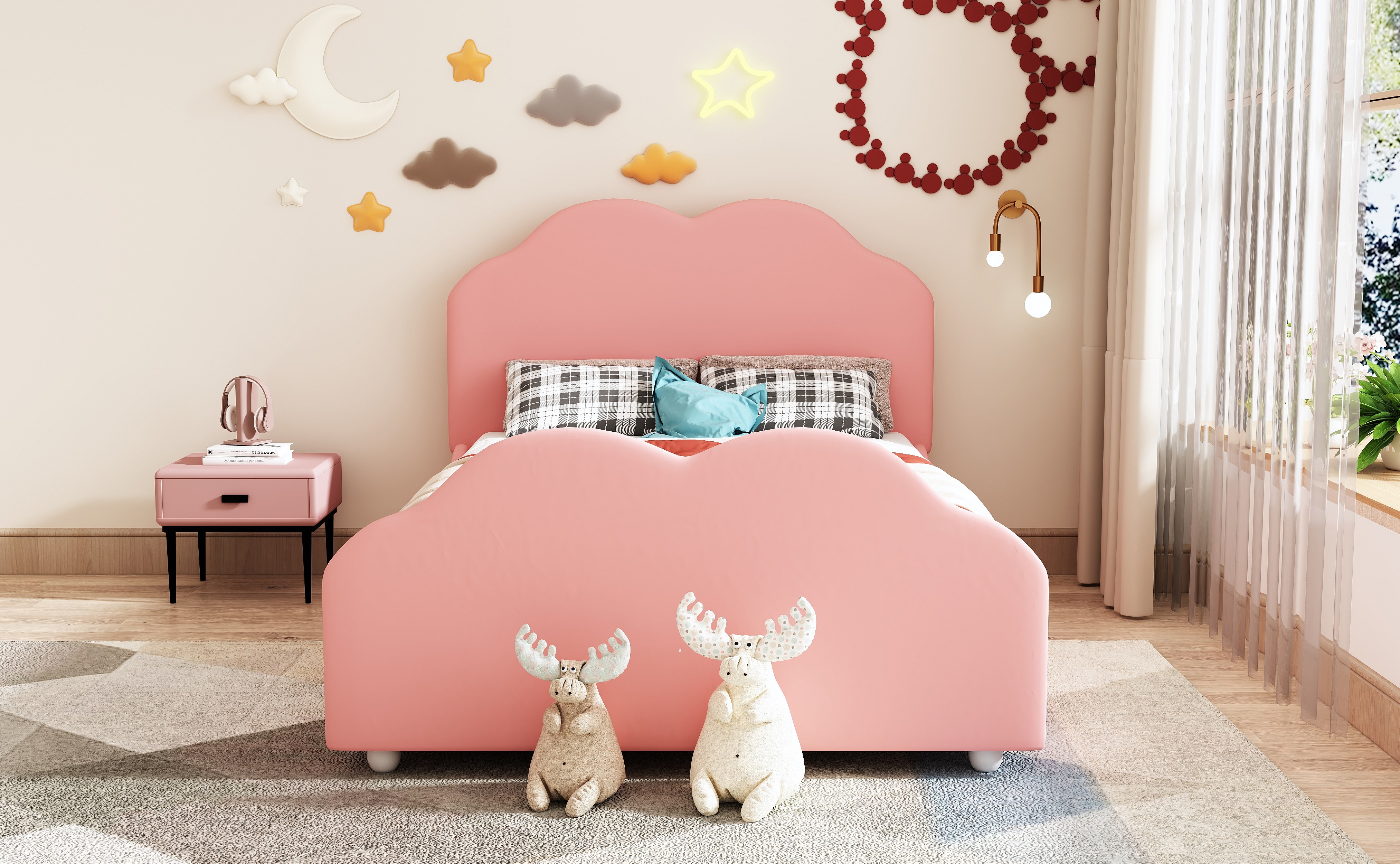 Lit rembourré 90x200 cm avec barrières hautes, tête et pied nuage, velours rose, lit enfant sécurisé