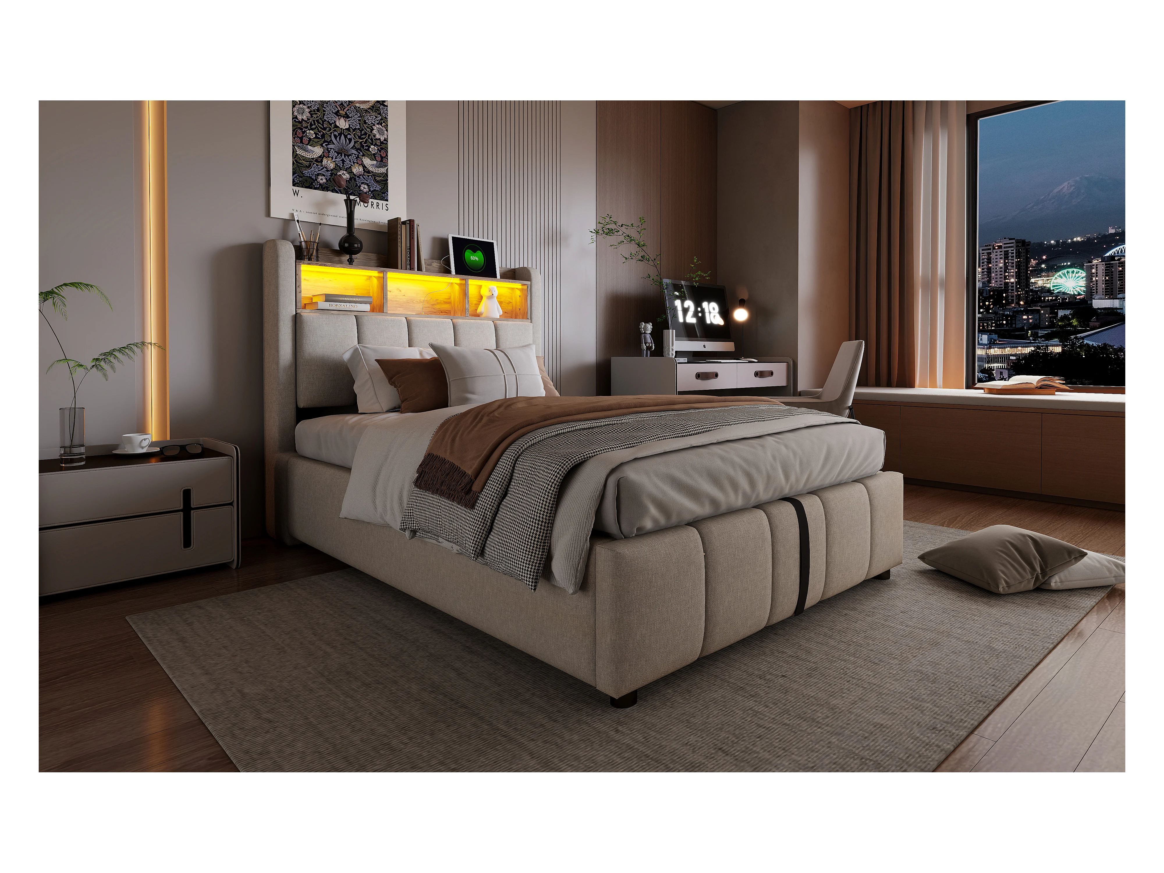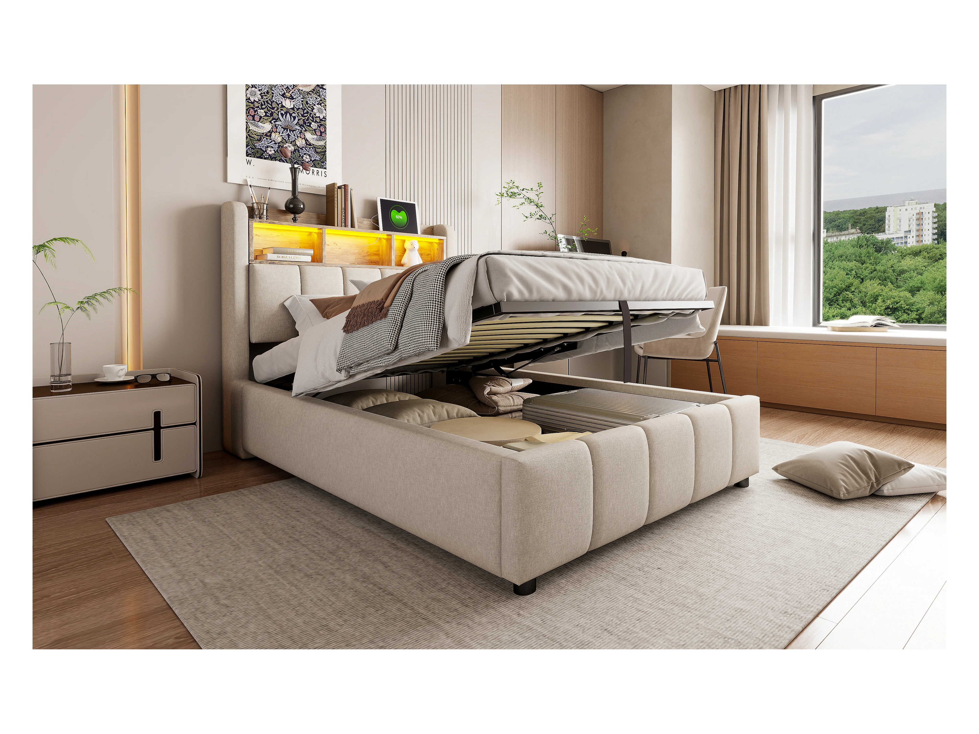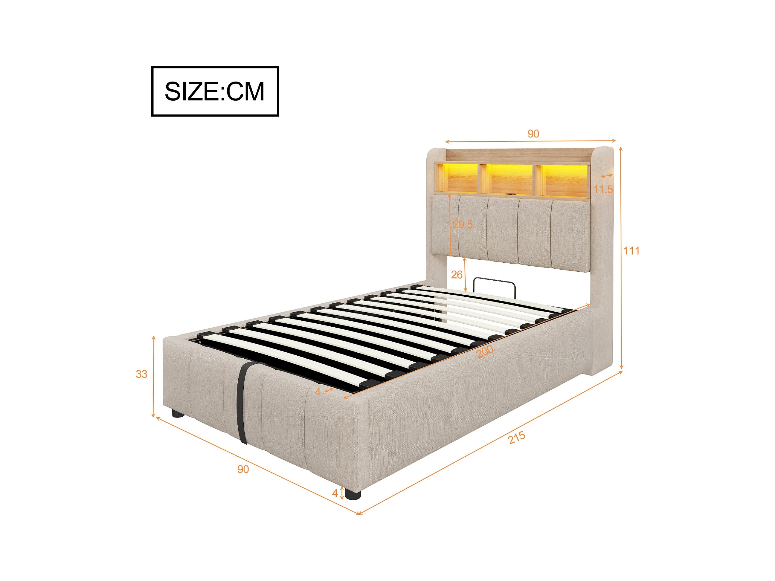 Lit rembourré 90×200 cm avec éclairage LED et port USB, tête de lit avec rangement et espace de stockage, lit enfant
