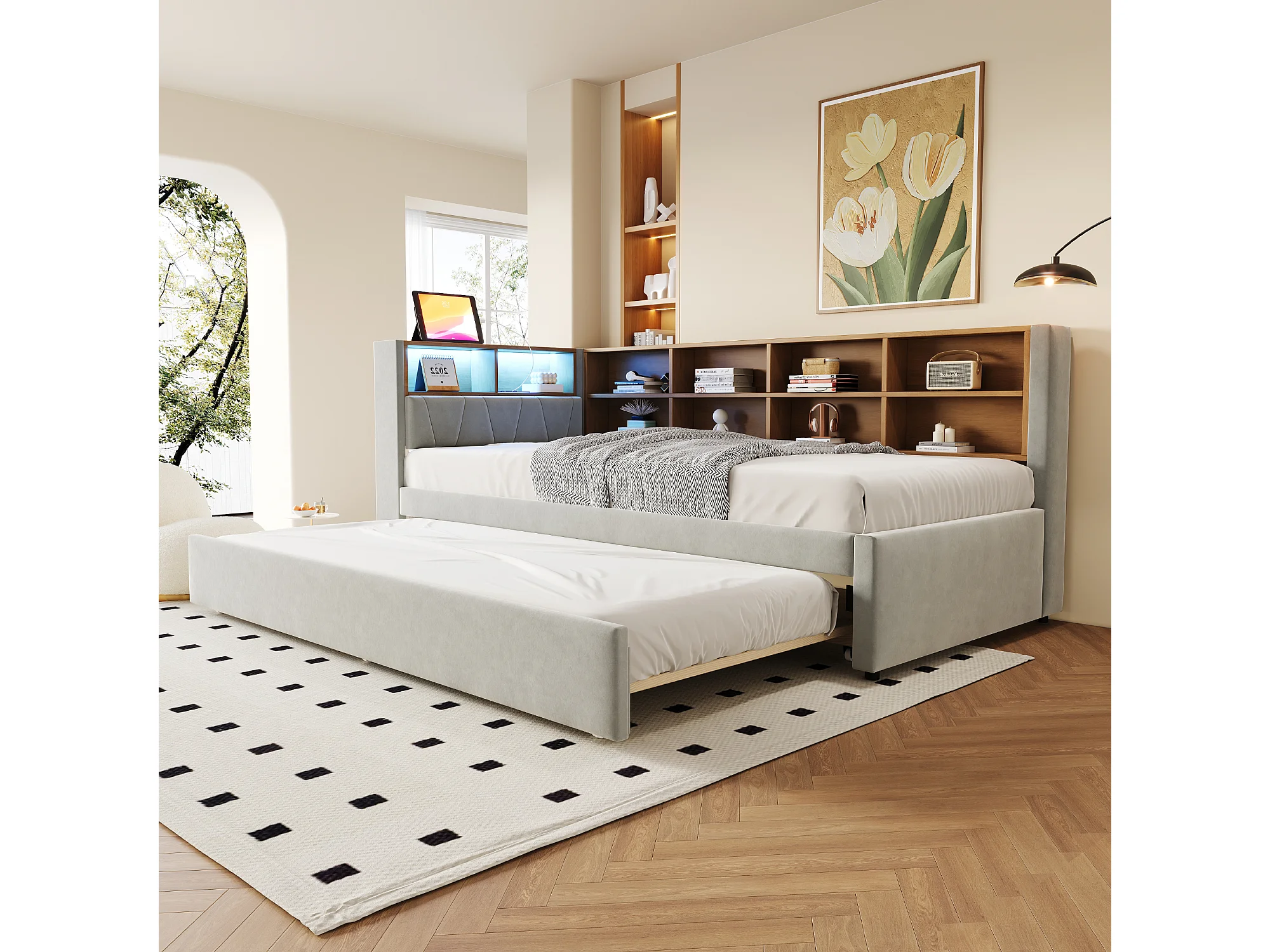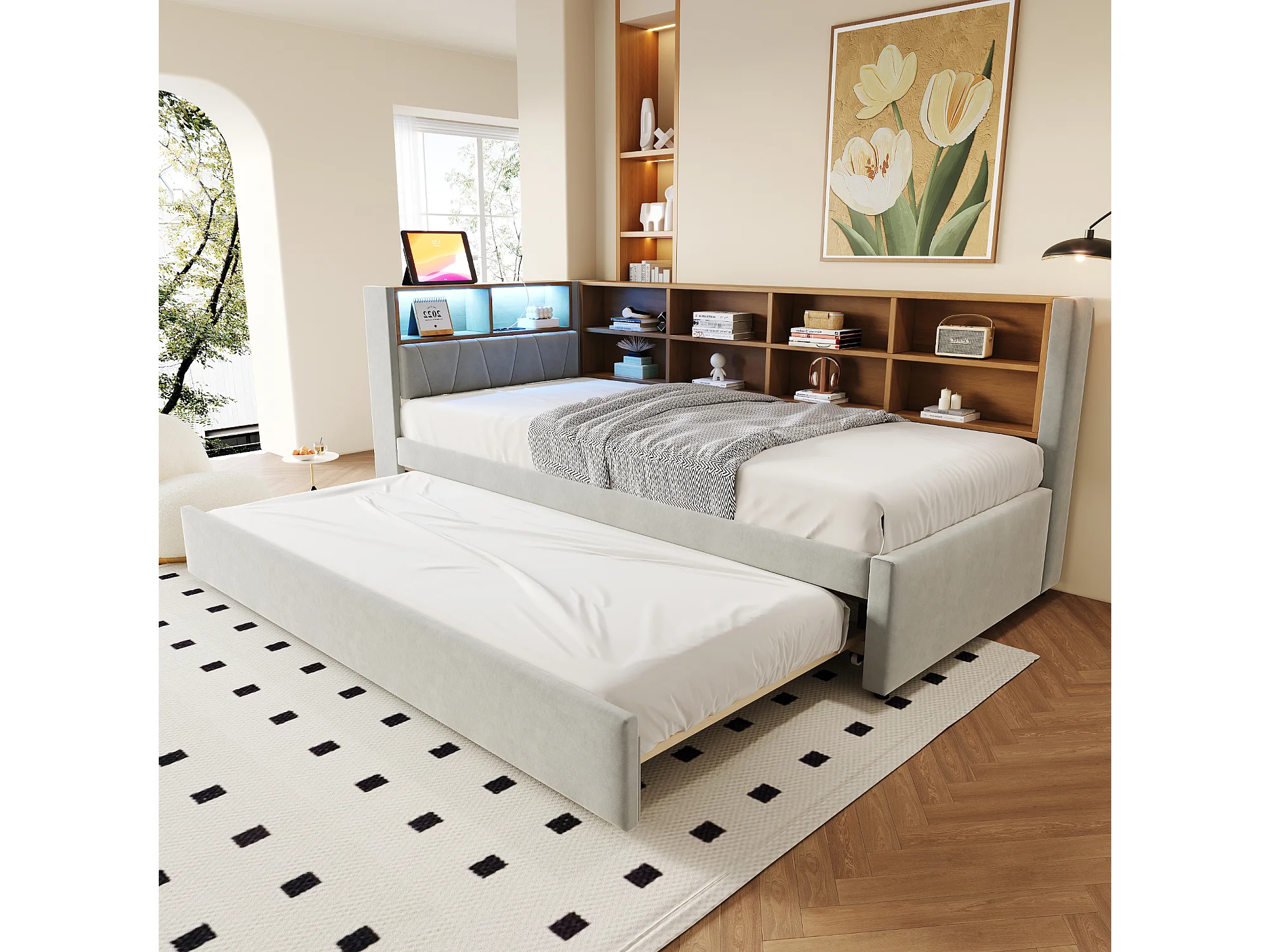 Lit rembourré 90x200 cm avec lit tiroir 90x190 cm, LED, ports USB et rangement intégré, flanelle gris clair