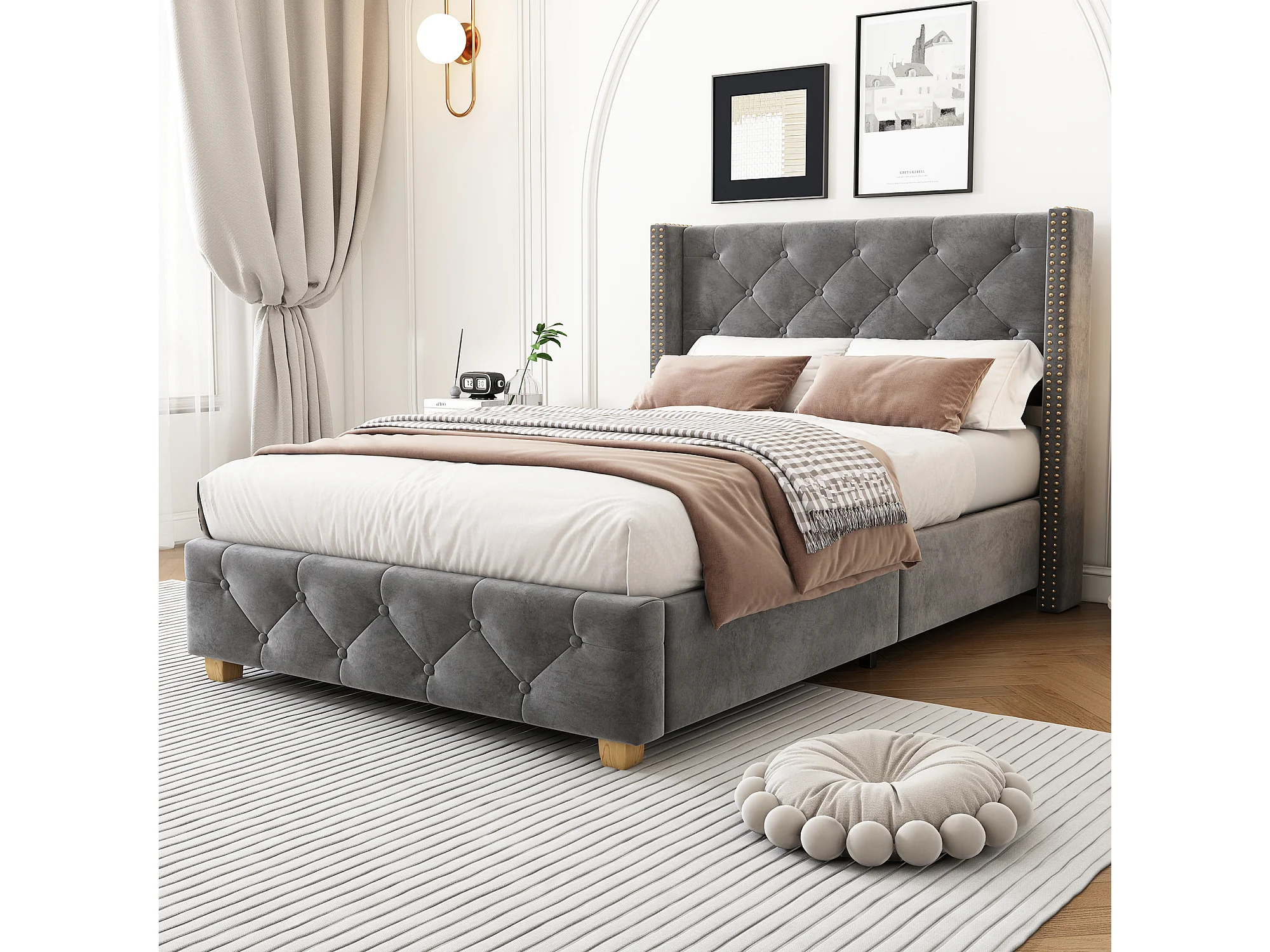 Lit rembourré 90×200 cm avec sommier à lattes et tête de lit, capitonnage, clous, pieds en bois, velours, gris