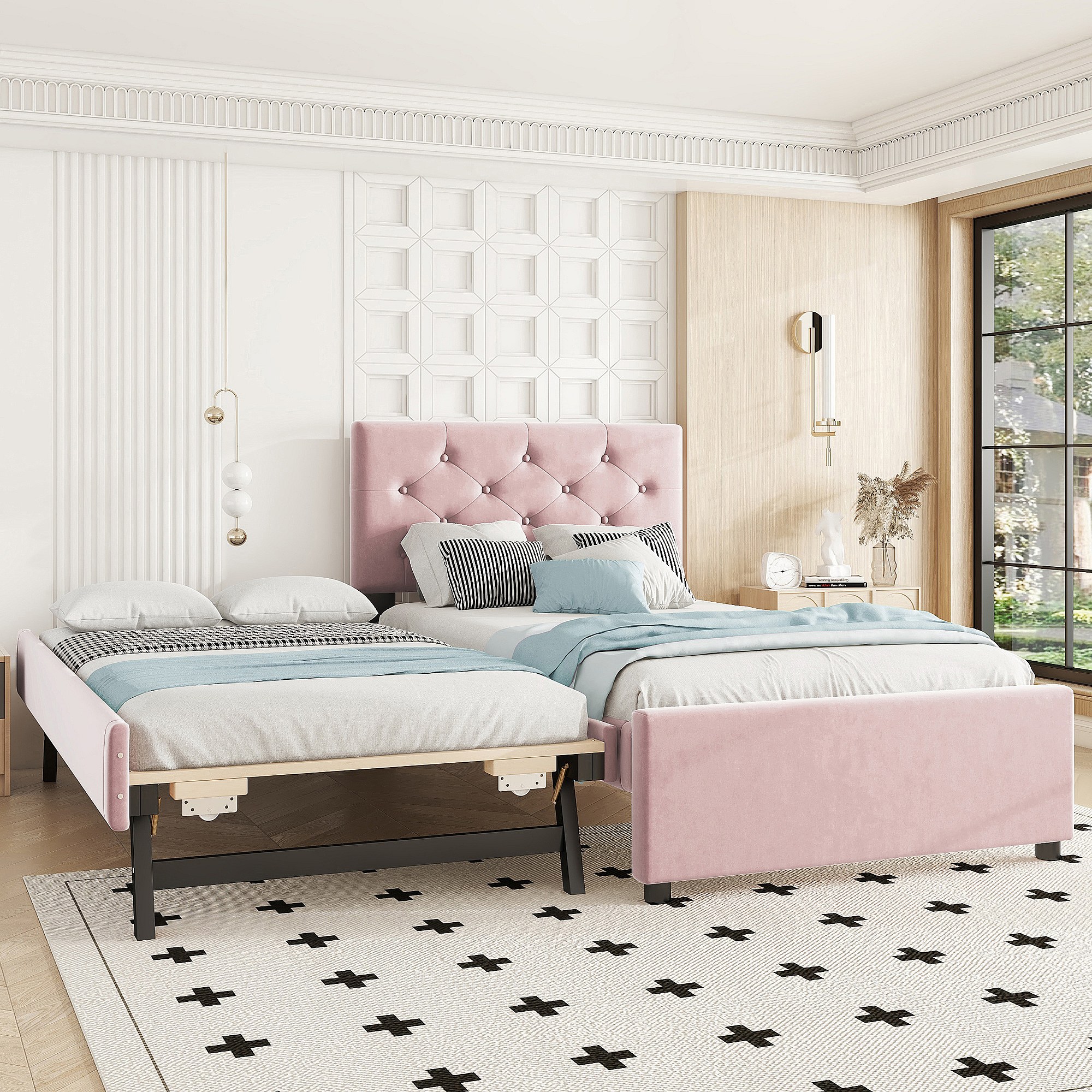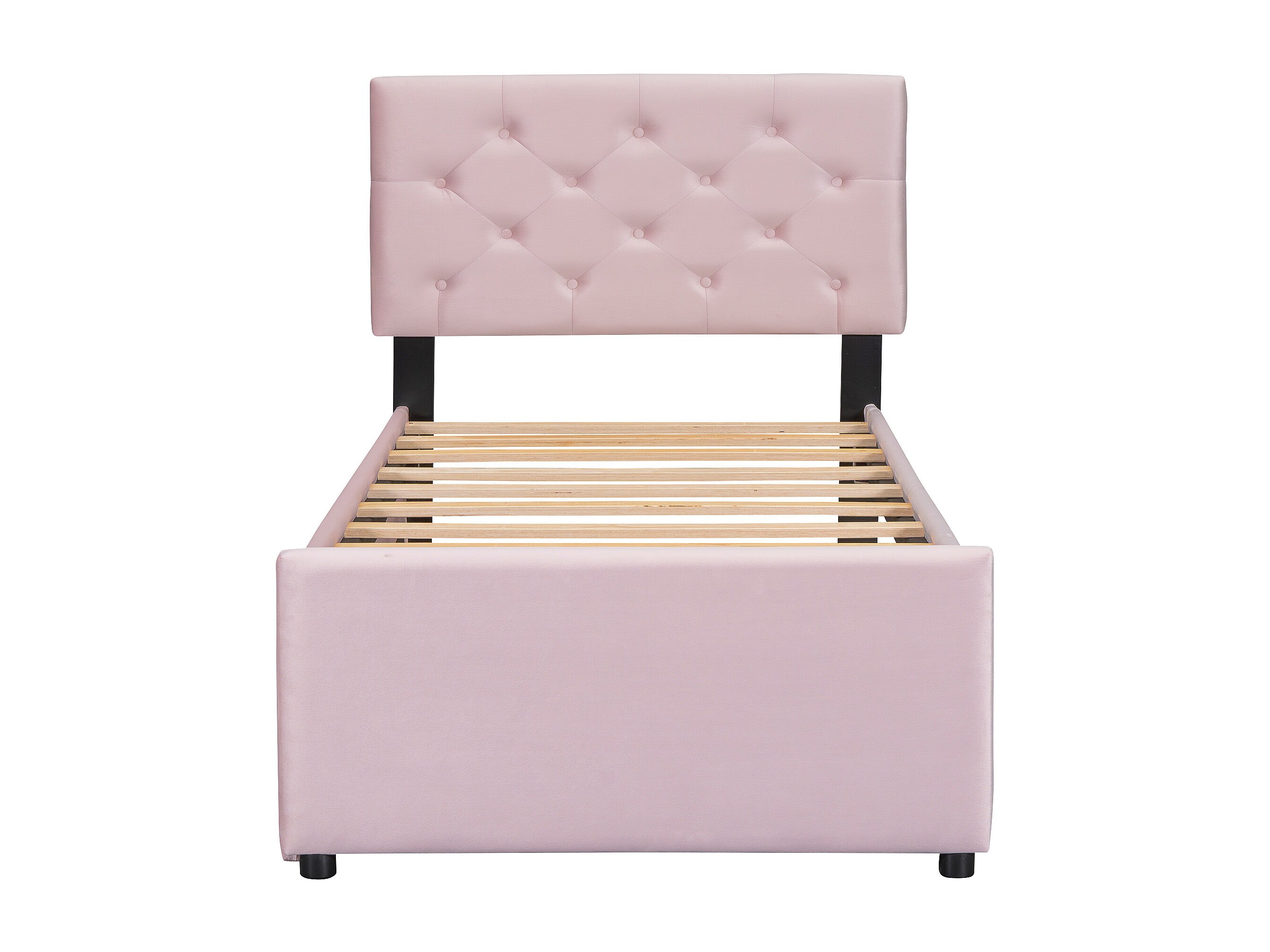 Lit rembourré 90x200 cm avec sommier à lattes (matelas non inclus), avec tiroir roulant, tissu en velours, design minimaliste, rose