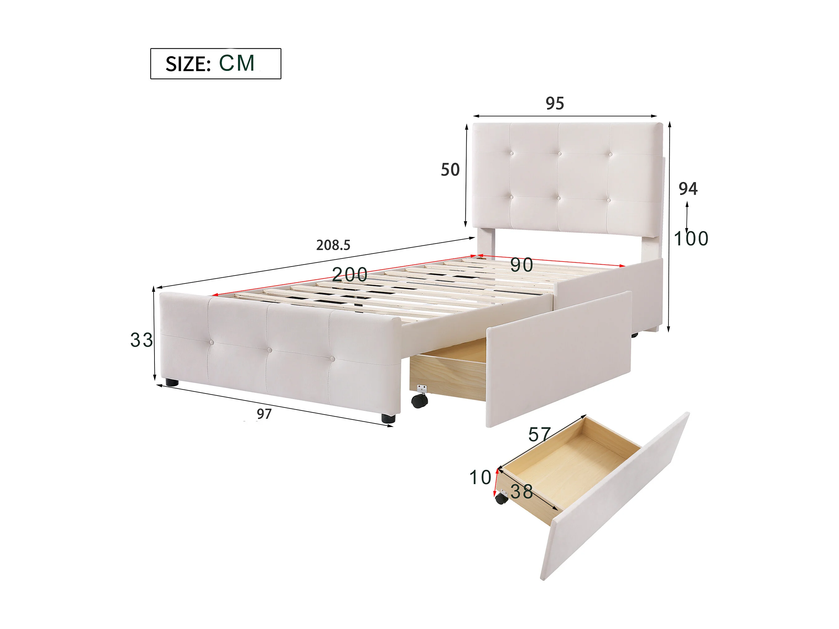 Lit rembourré 90x200 cm avec tiroirs et sommier, tête rembourrée, velours beige, lit enfant