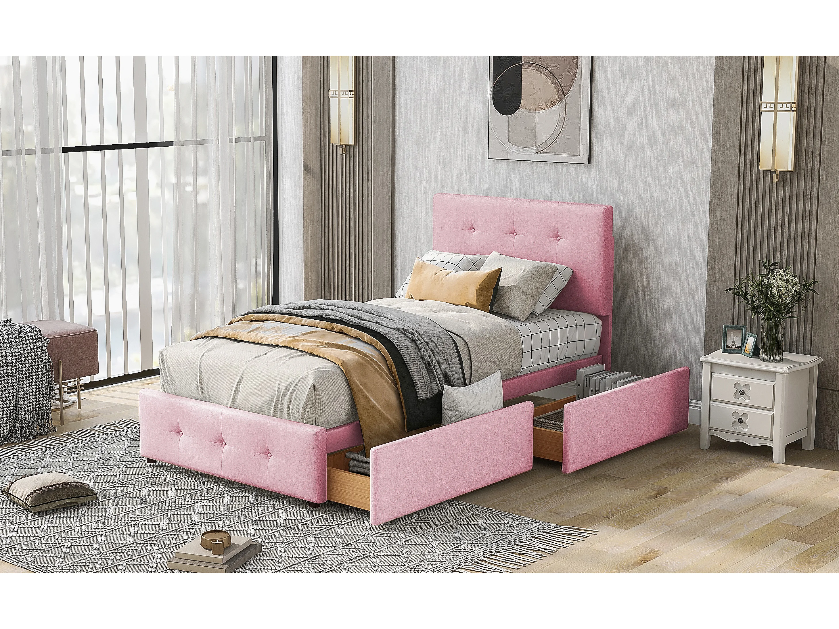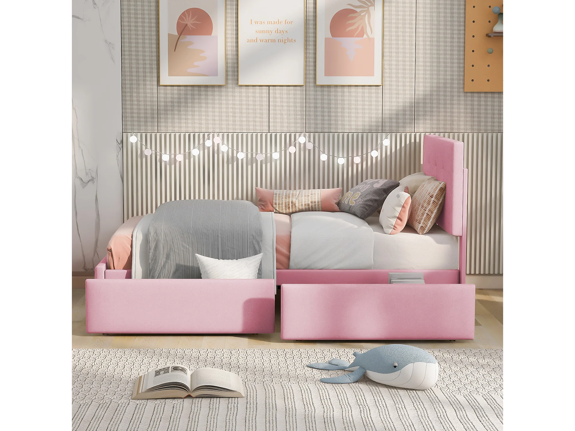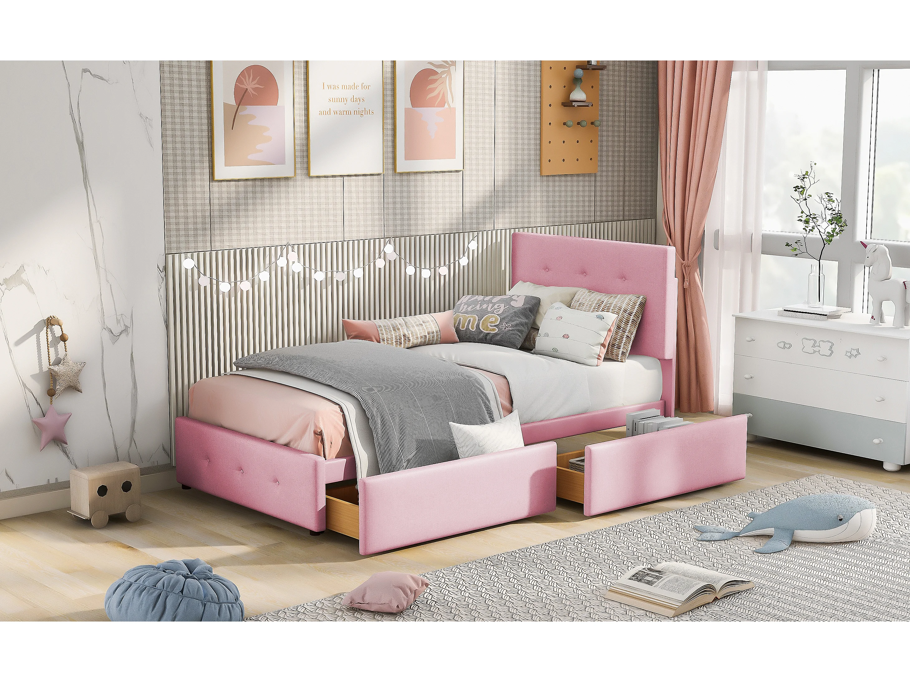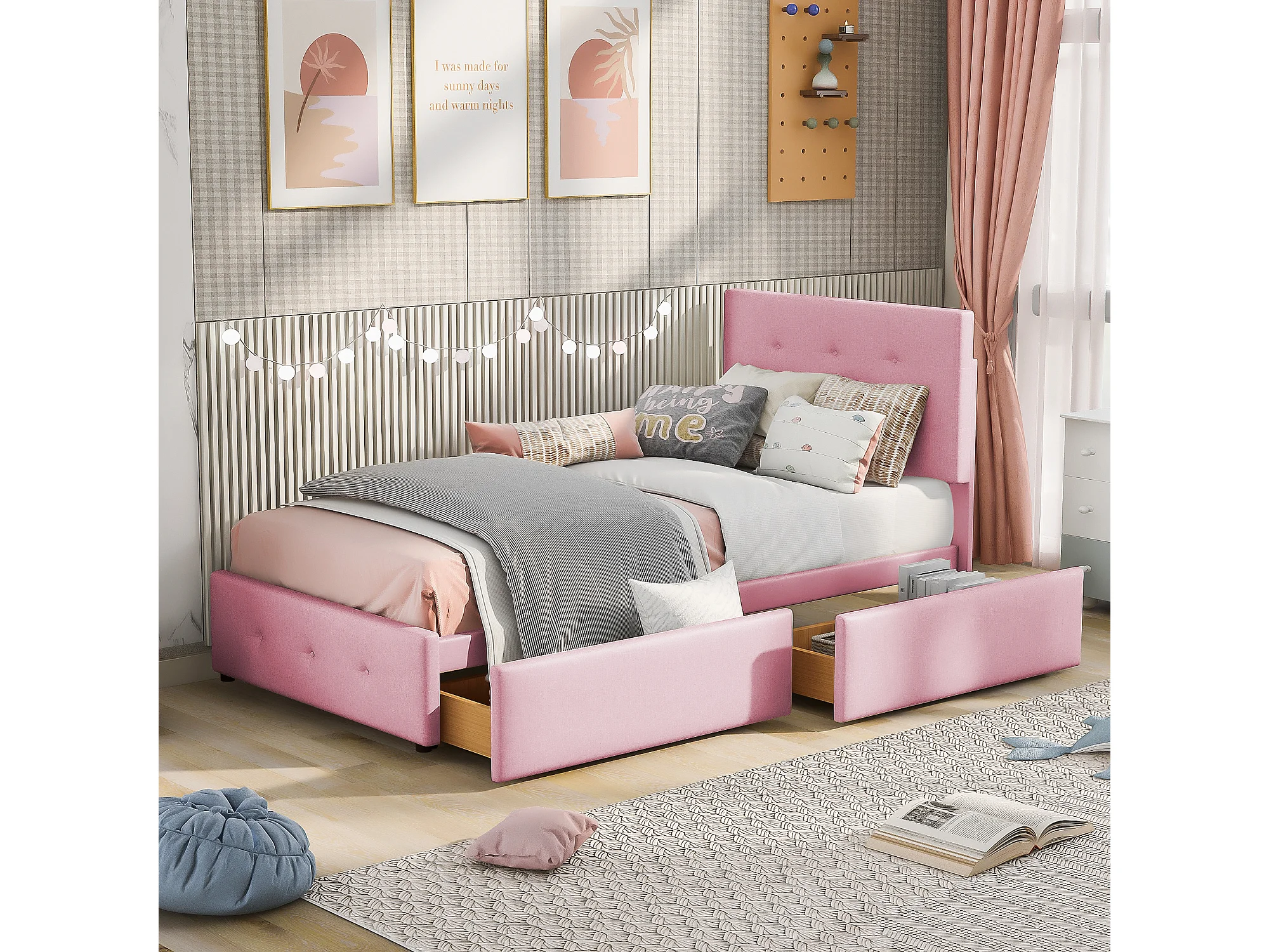 Lit rembourré 90x200 cm avec tiroirs, sommier, tête réglable, velours gris, lit enfant fonctionne