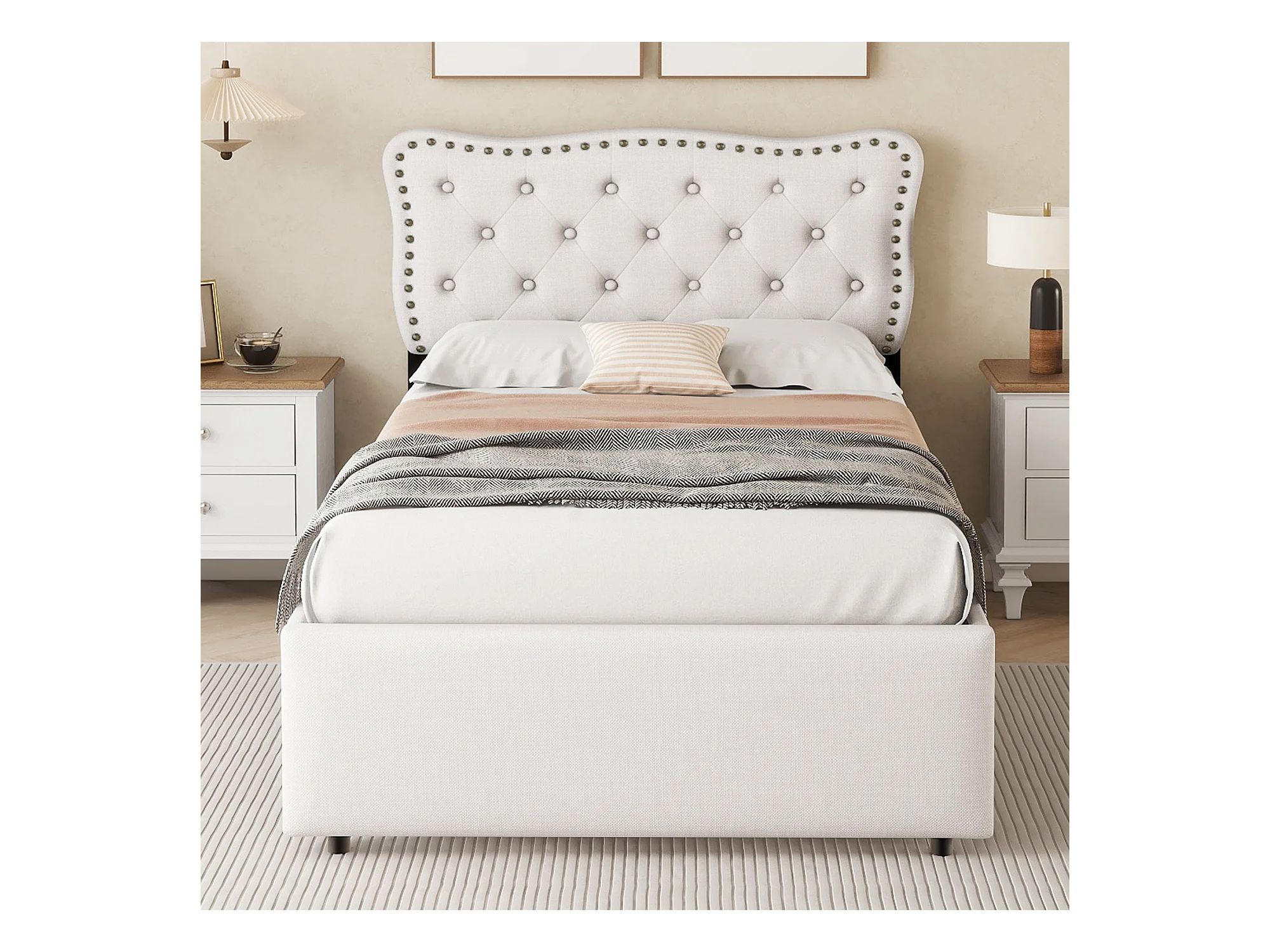 Lit rembourré 90x200 cm beige clair avec tête de lit cloutée, deux tiroirs, structure stable et design épuré
