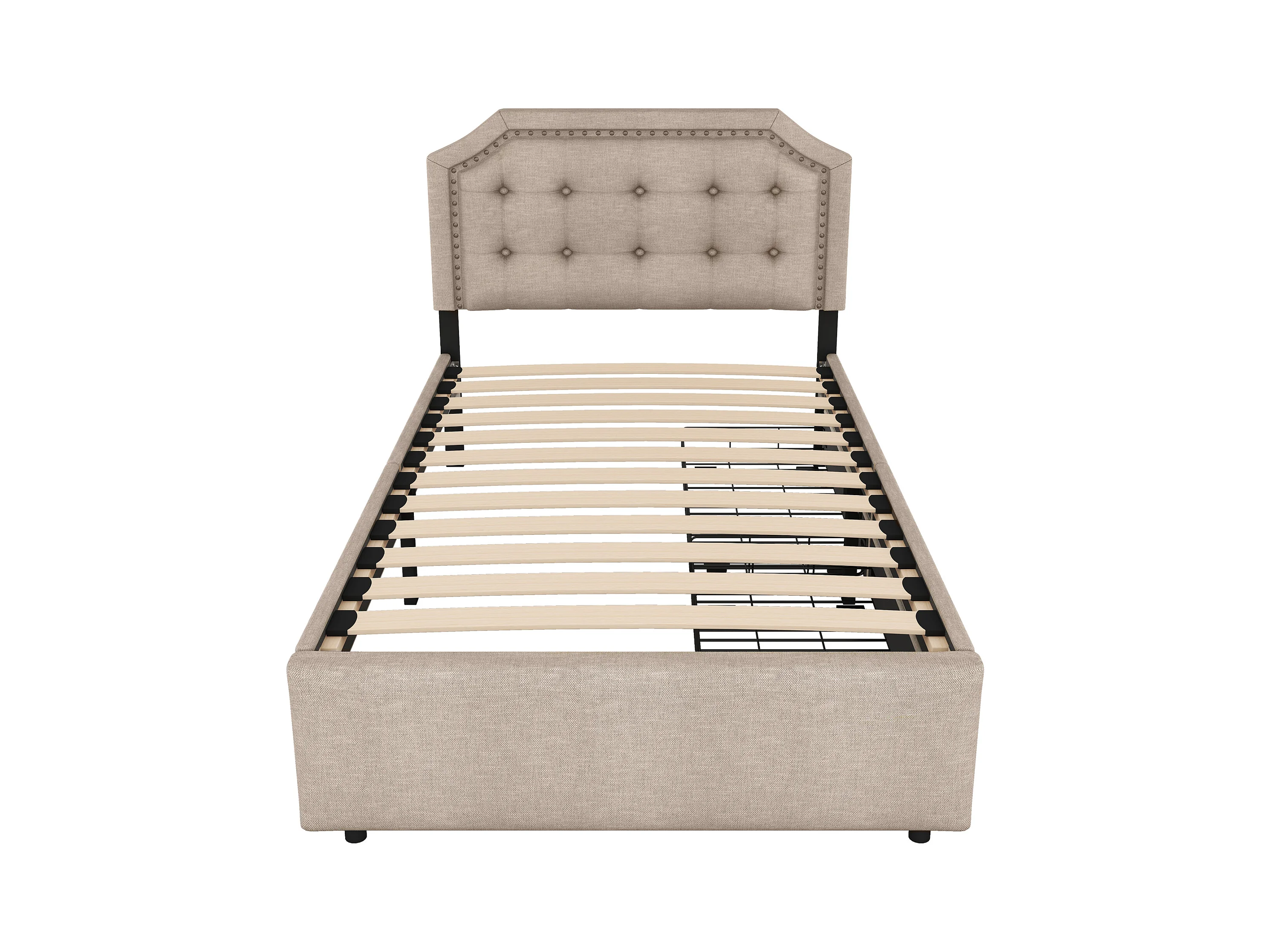 Lit rembourré 90x200 cm beige foncé avec tête de lit décorative à clous, deux tiroirs, look élégant et pratique