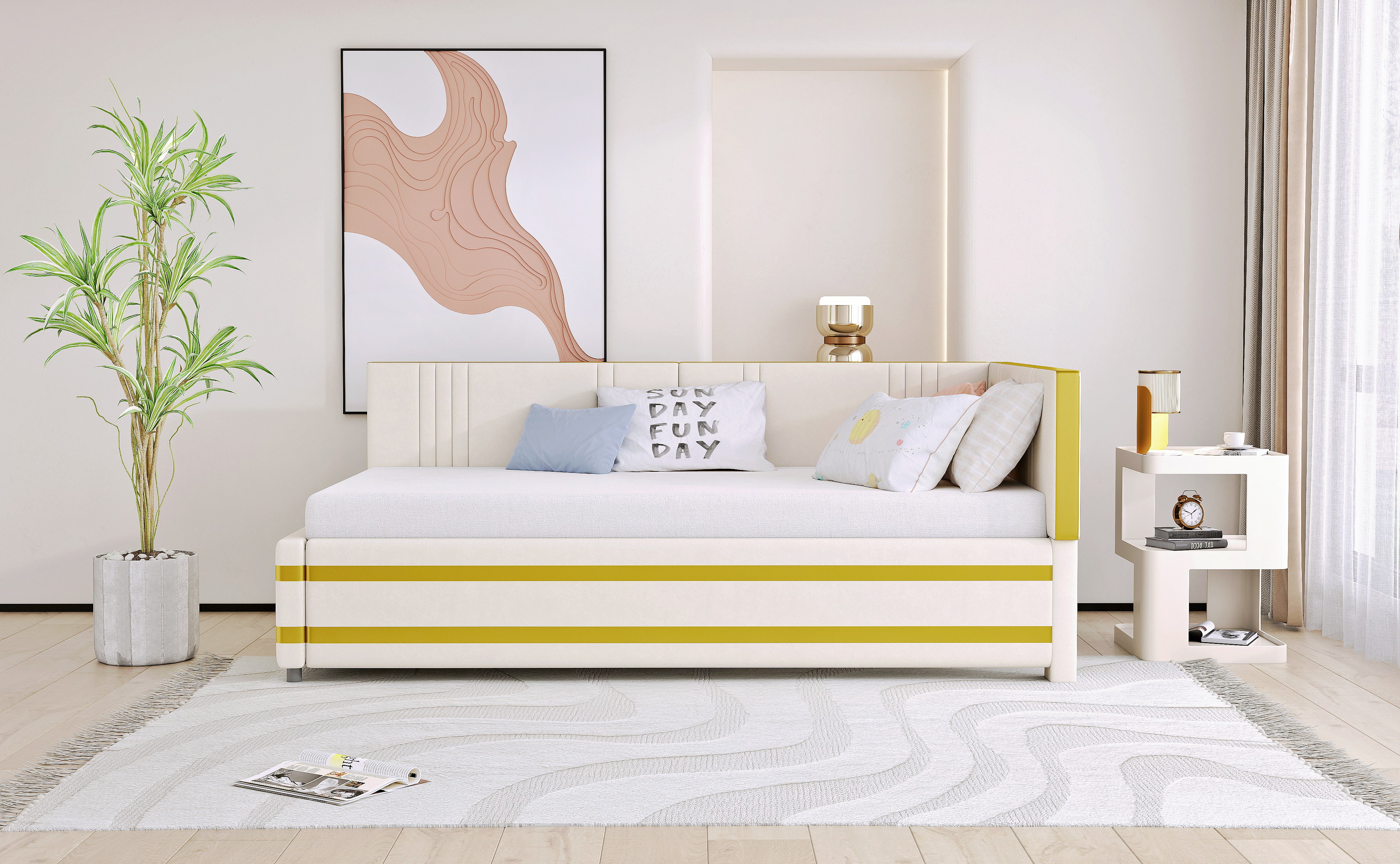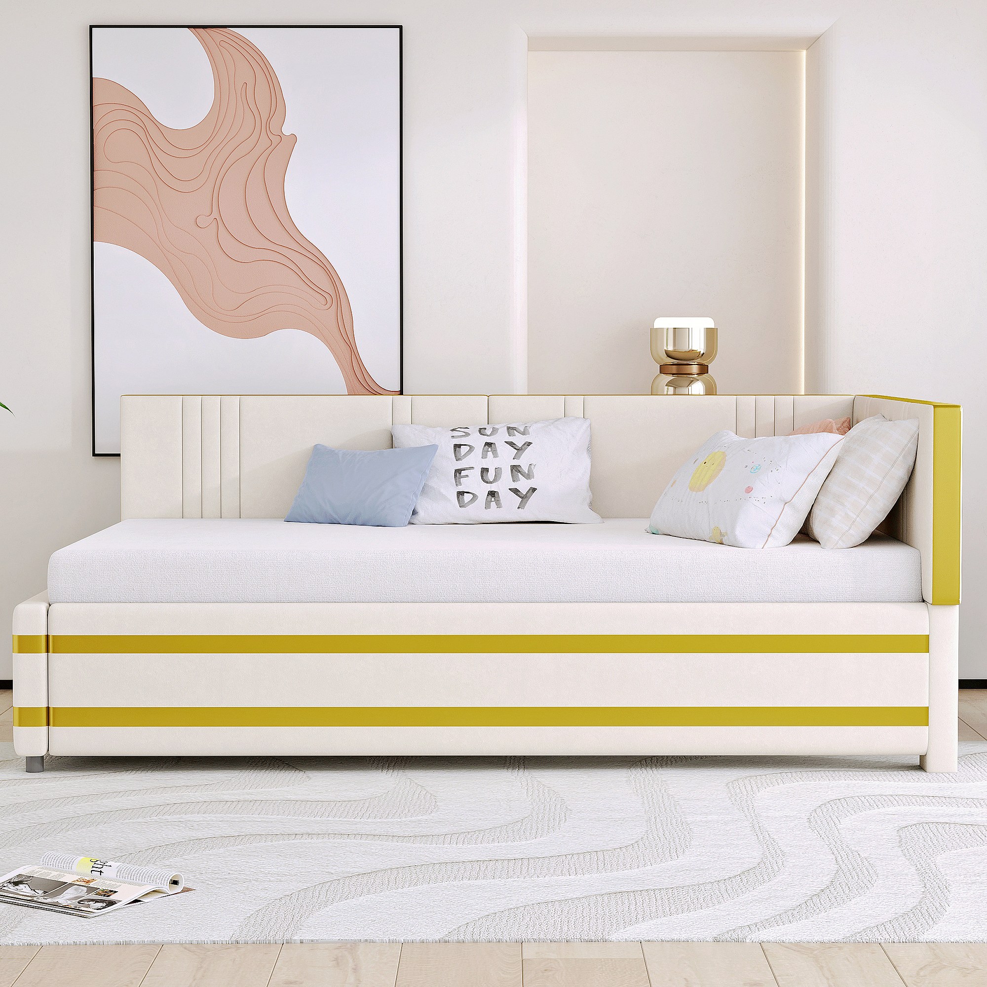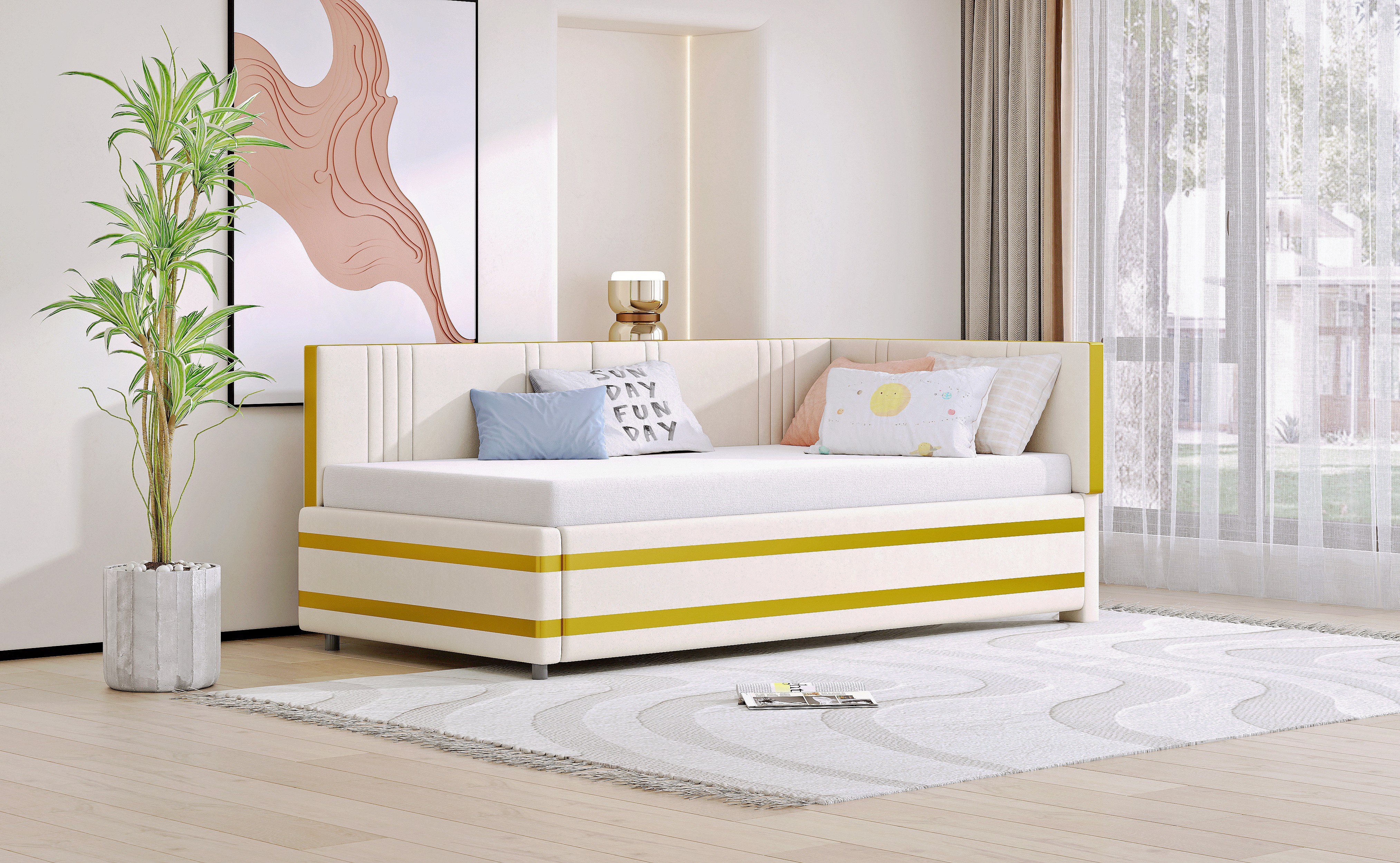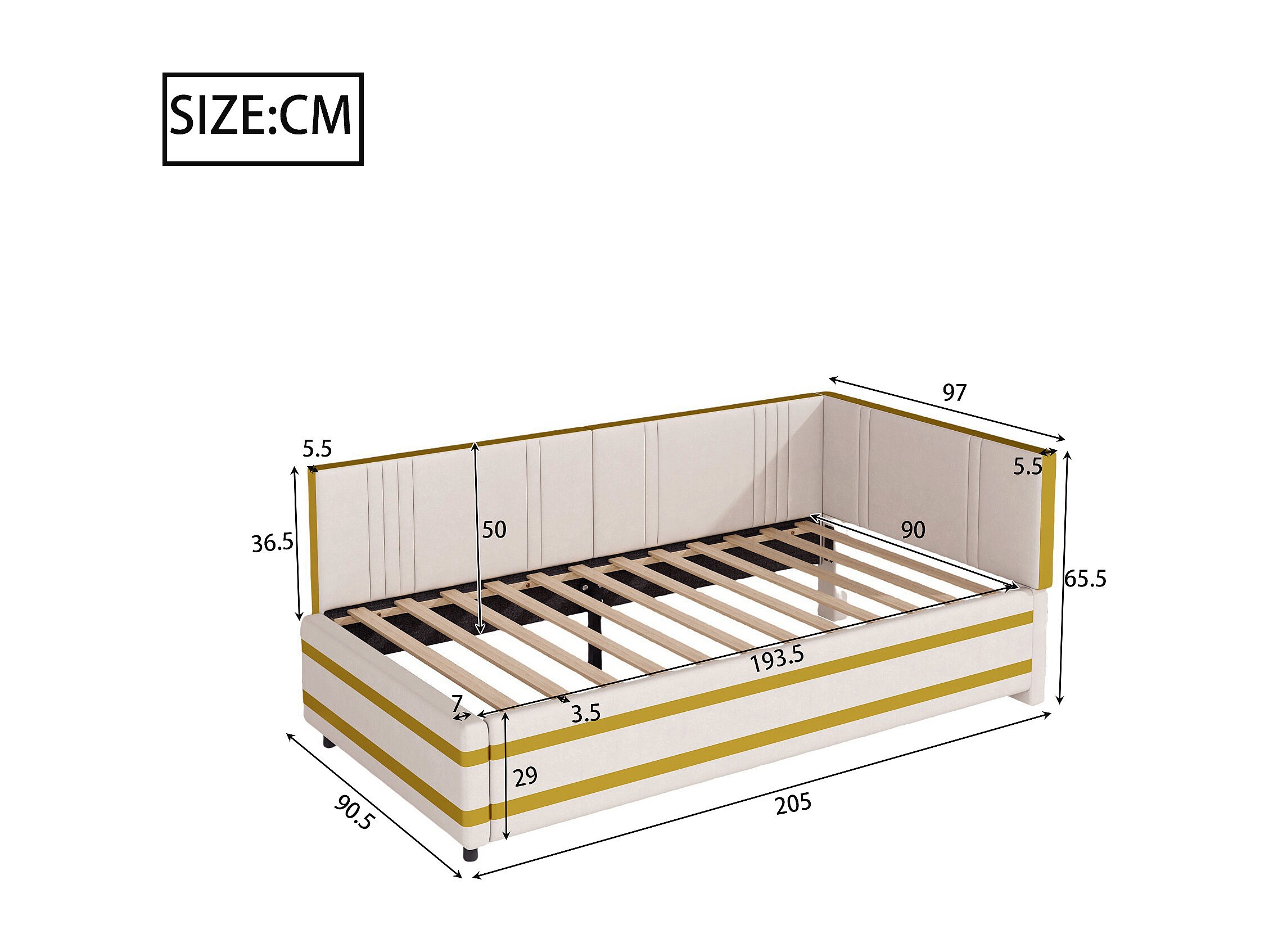 Lit rembourré 90x200 cm avec tiroirs et sommier, tête rembourrée, velours beige, lit enfant