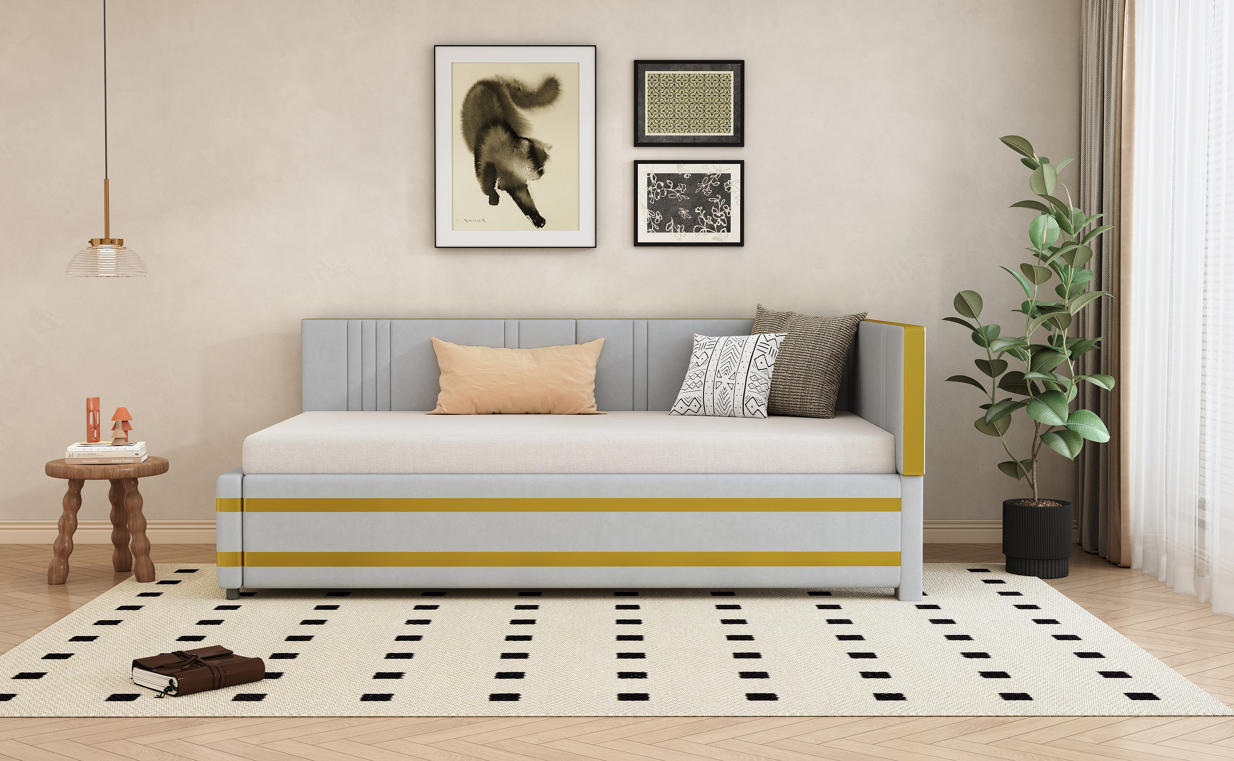 Lit rembourré 90x200 cm avec tiroirs et sommier, tête rembourrée, velours beige, lit enfant