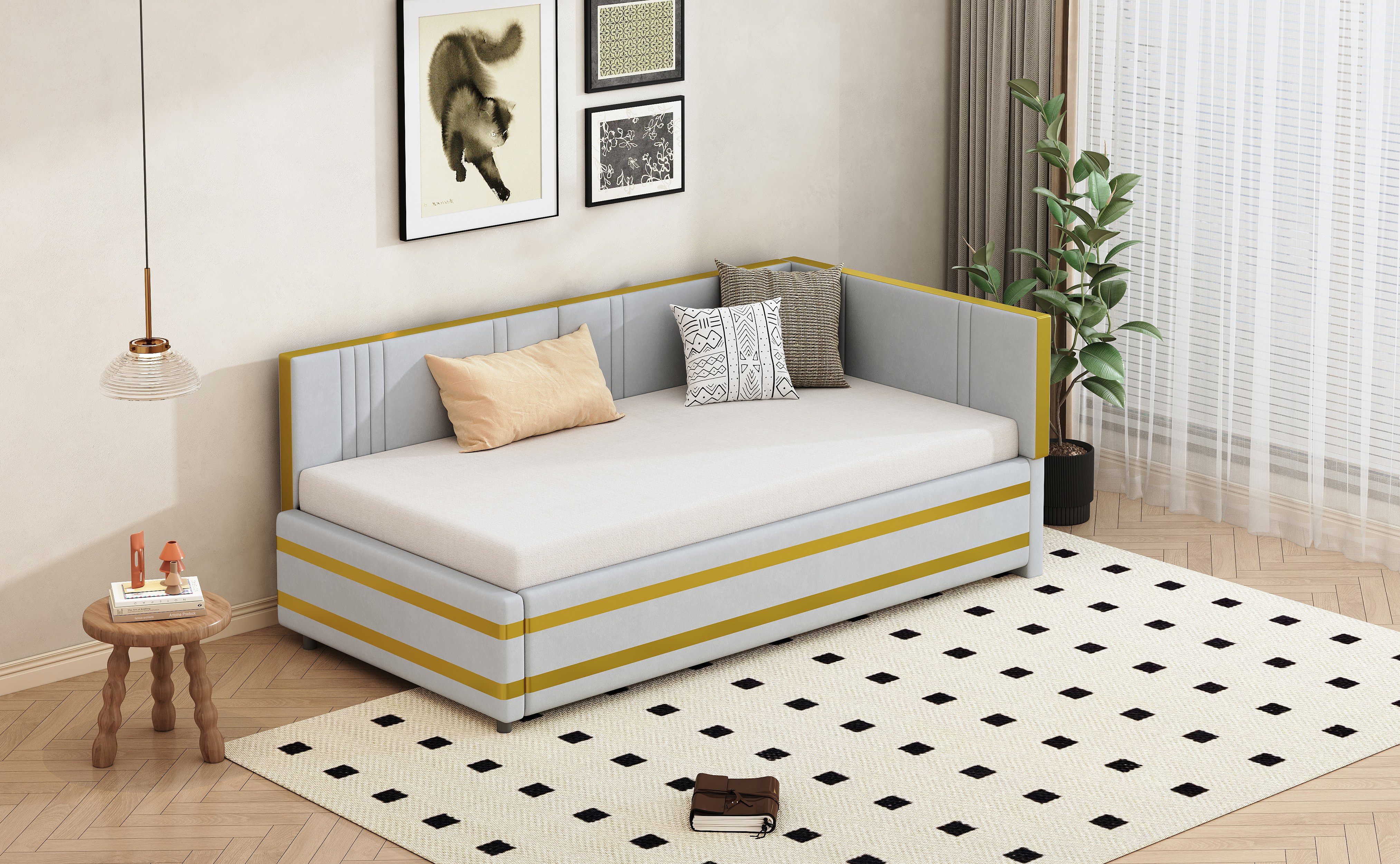 Lit rembourré 90x200 cm avec tiroirs et sommier, tête rembourrée, velours gris, lit enfant multifonction