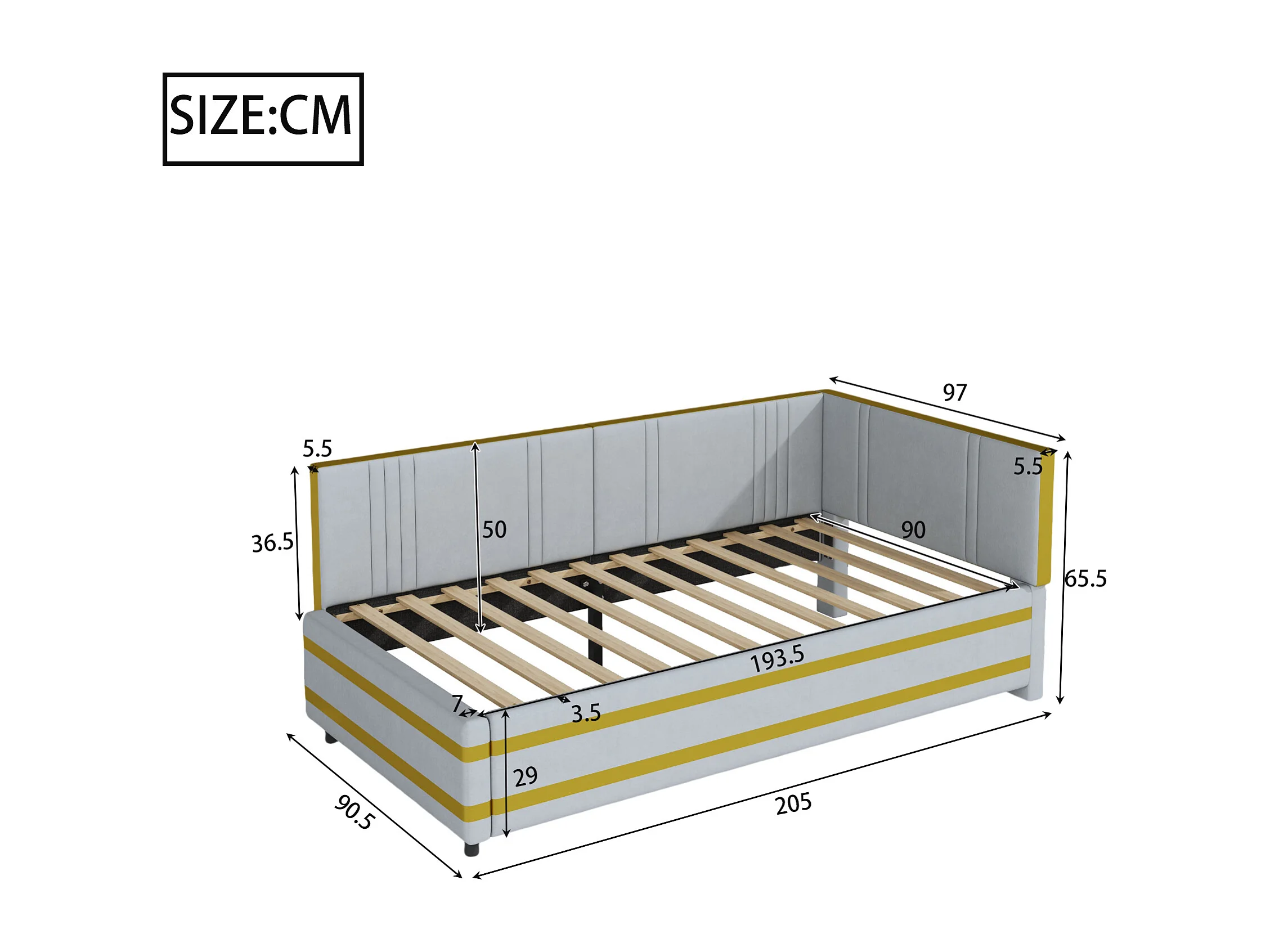 Lit individuel 90x200 avec tête de lit rembourrée, bandes décoratives dorées et port USB Type-C, lit de rangement hydraulique, beige, lin (sans matelas)