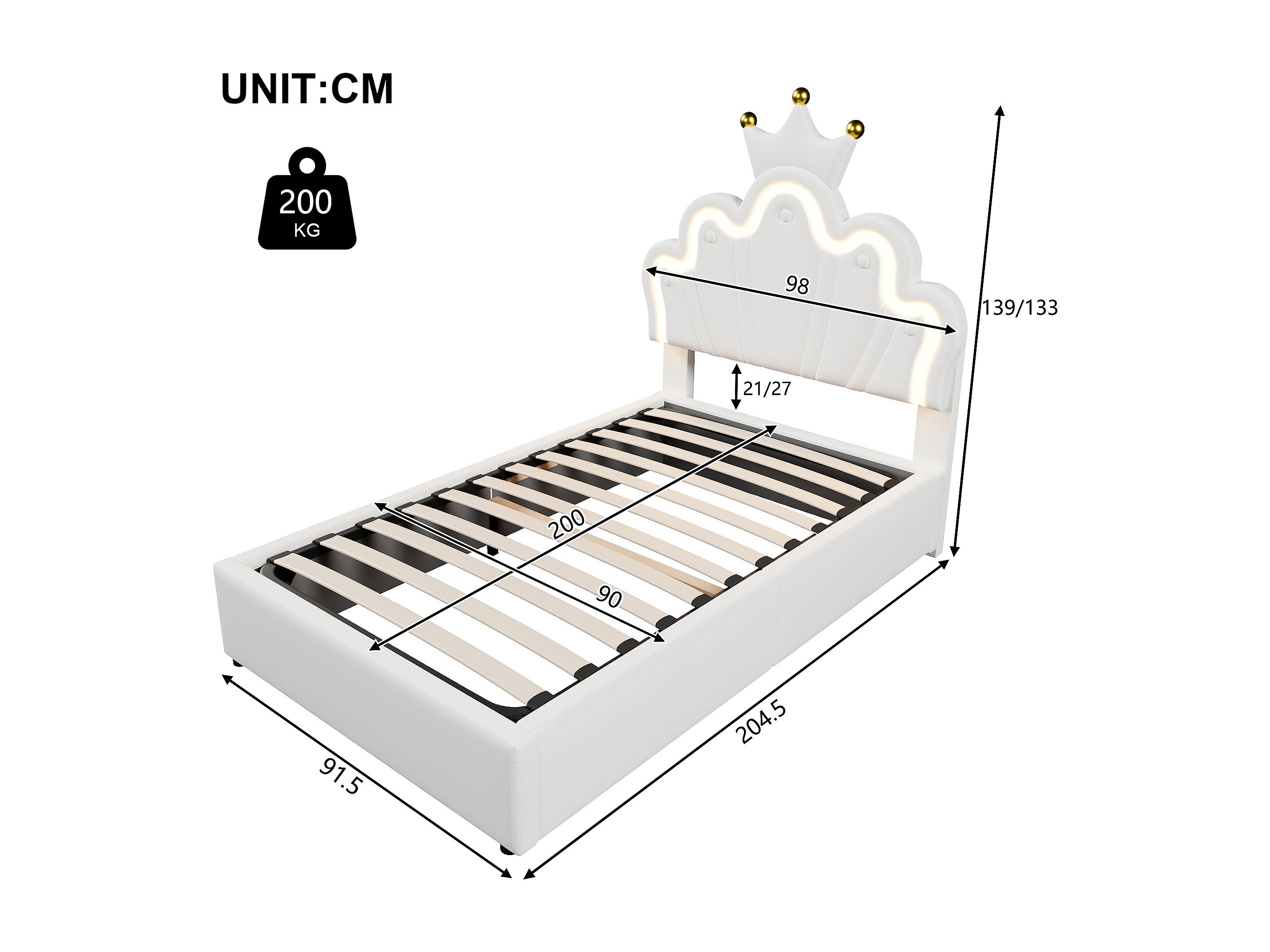 Lit rembourré 90x200 cm sans matelas, bande LED, mécanisme hydraulique, lit princesse en forme de couronne, tête de lit réglable, PU, Blanc
