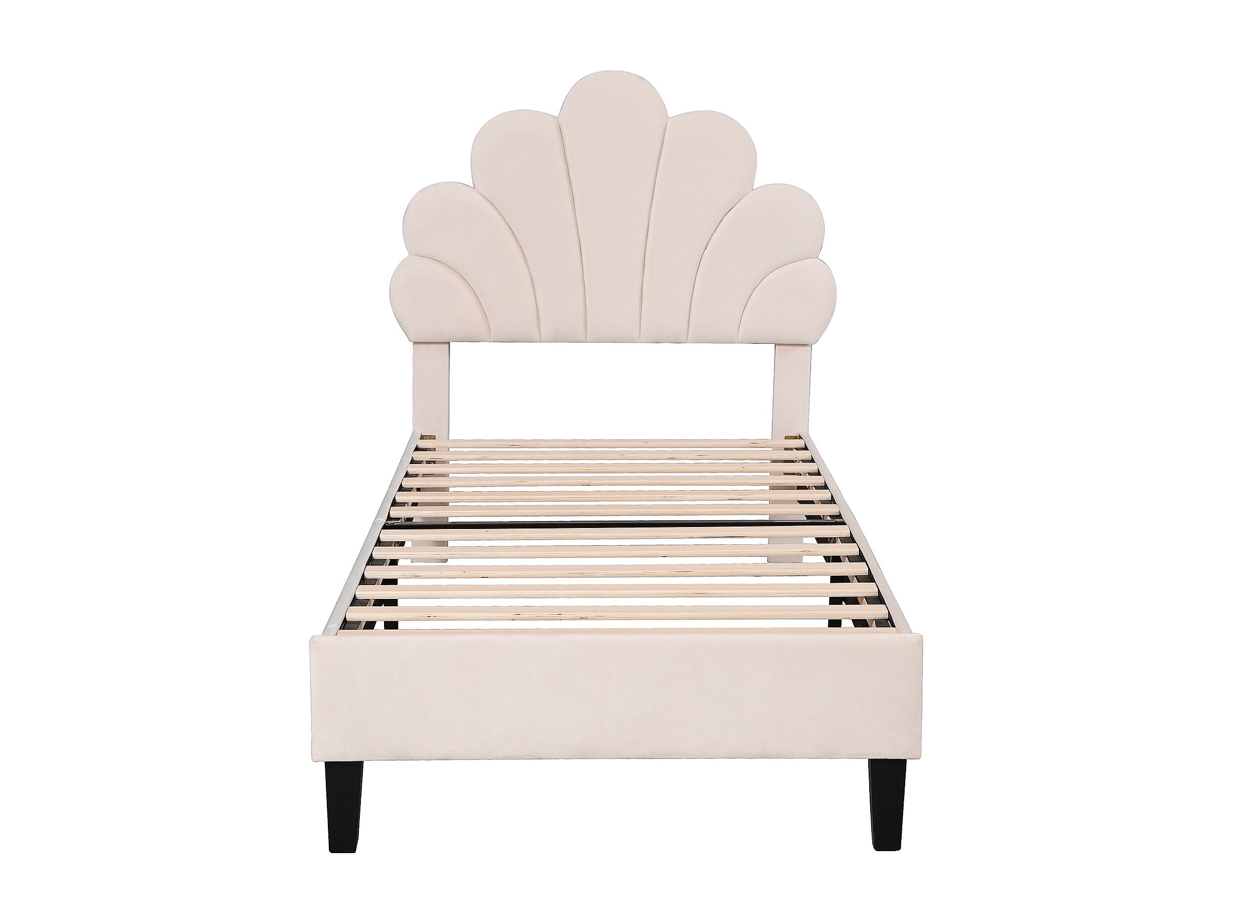 Lit rembourré 90x200 cm tête en forme de fleurs, sommier inclus, velours beige, lit fille pratique