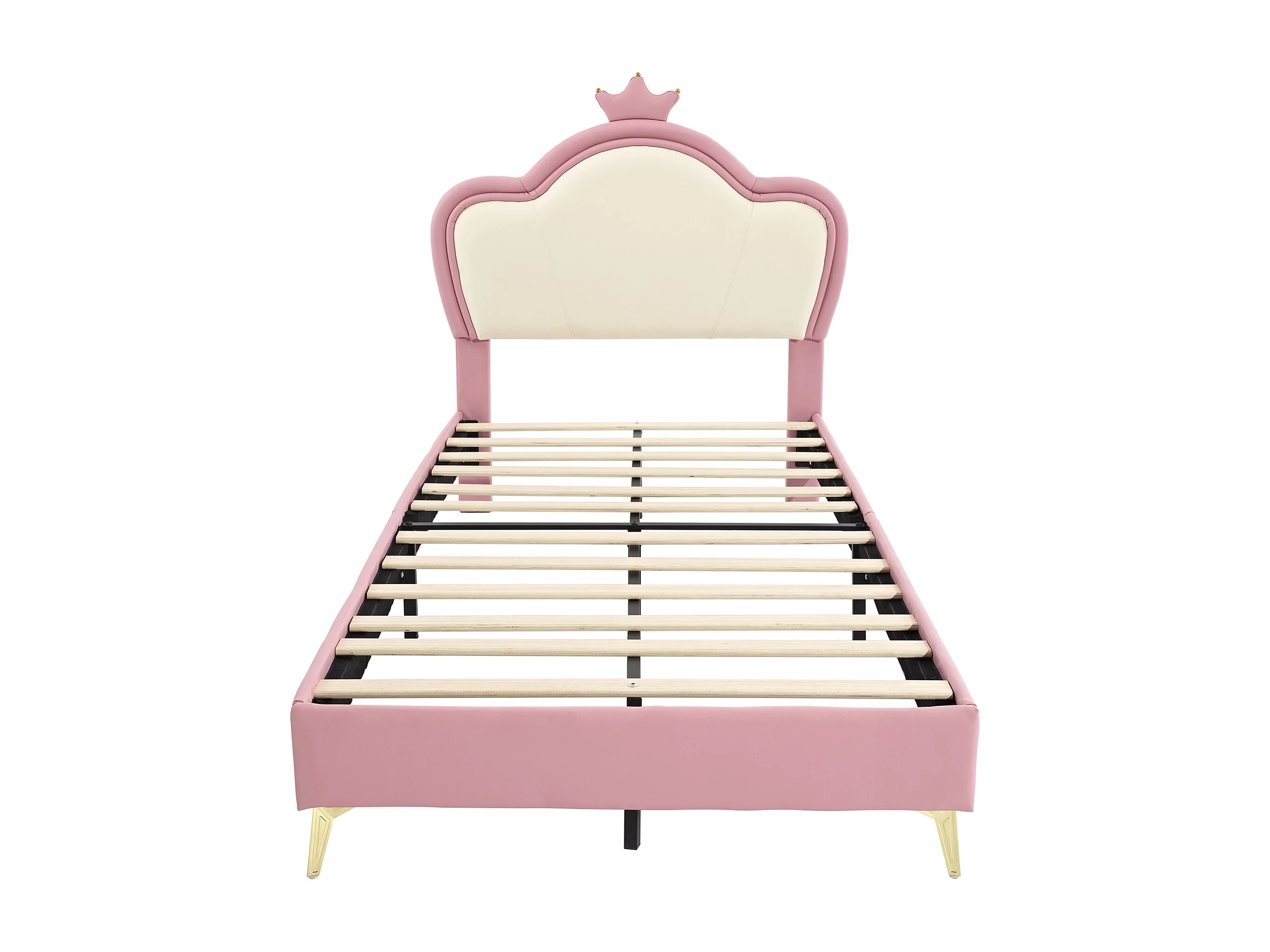 Lit rembourré 90x200cm, lit enfant, bords protecteurs doux, tête de lit ornée, pieds de lit en métal, lit simple, PU, rose et blanc