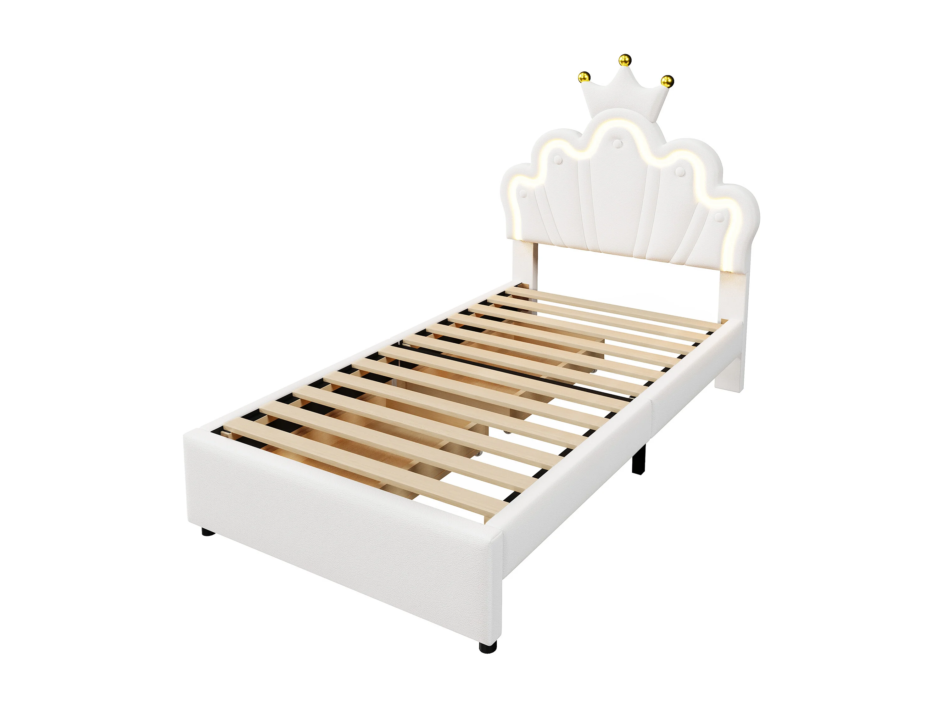 Lit rembourré, 90x200cm, lit princesse avec 2 tiroirs, éclairage d'ambiance et tête de lit réglable, PU, blanc, sans matelas