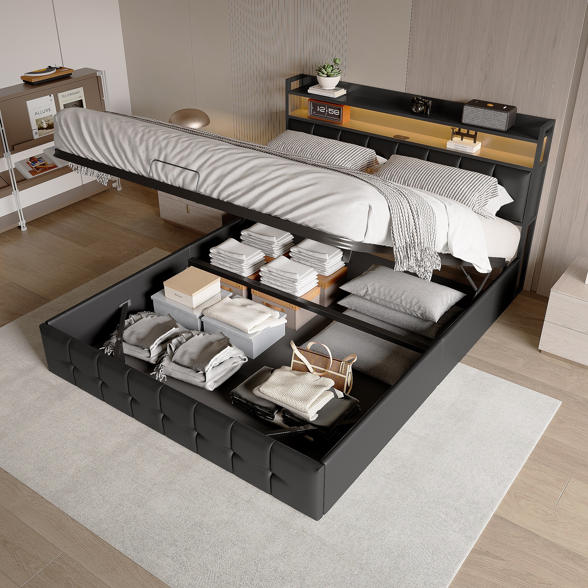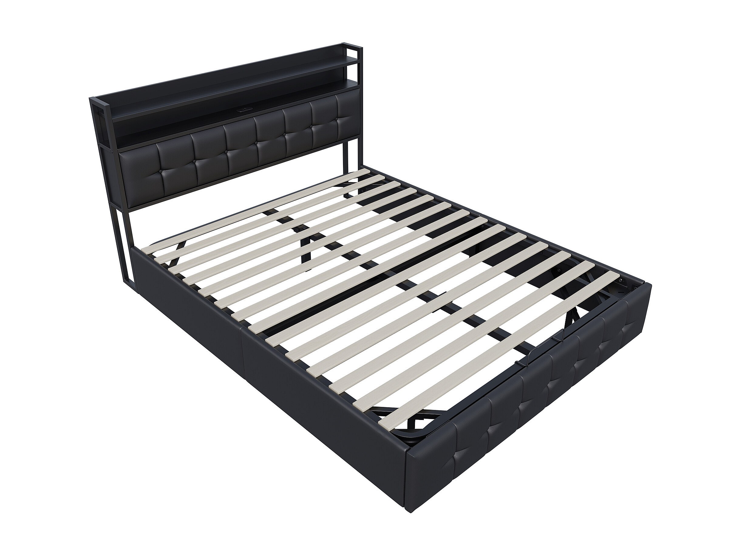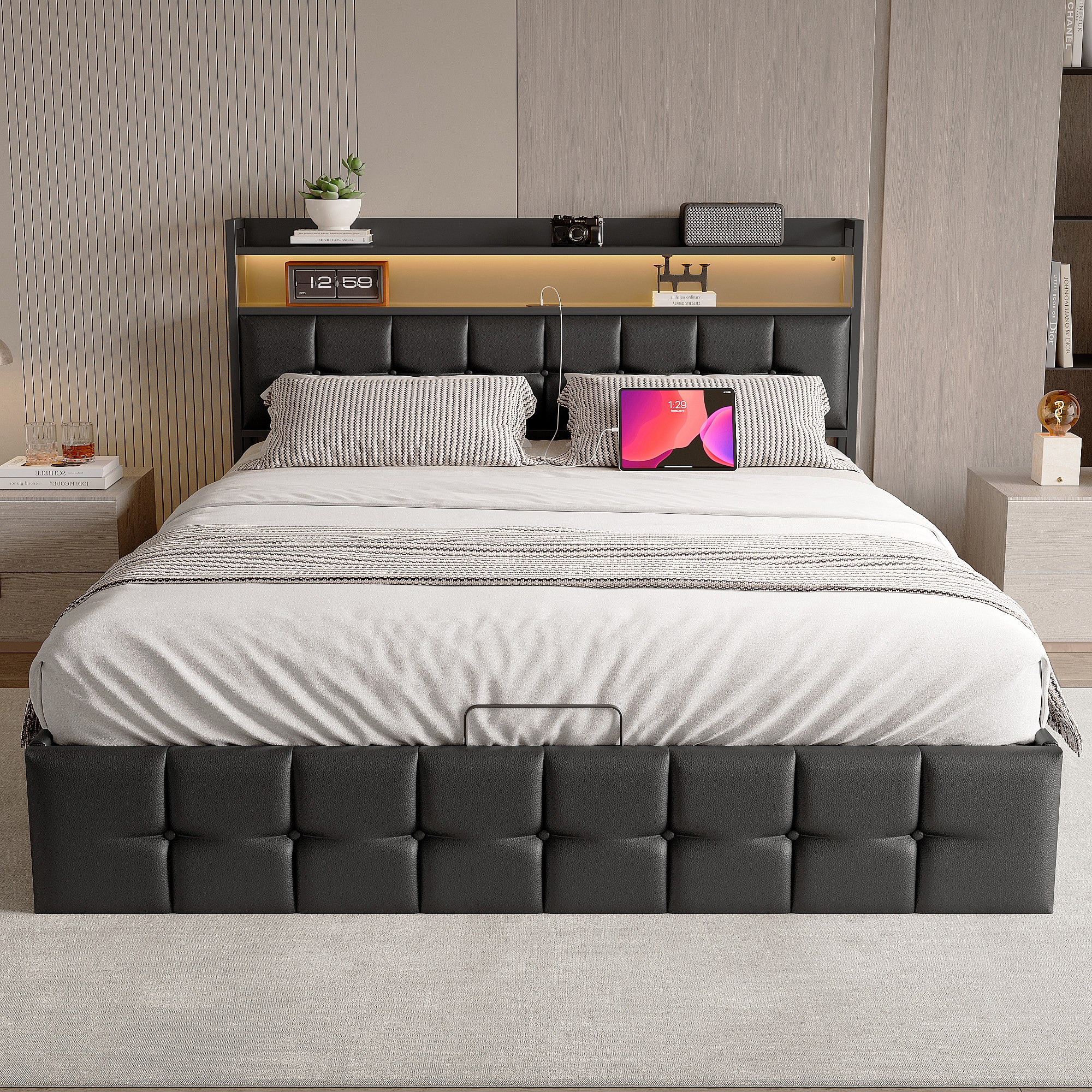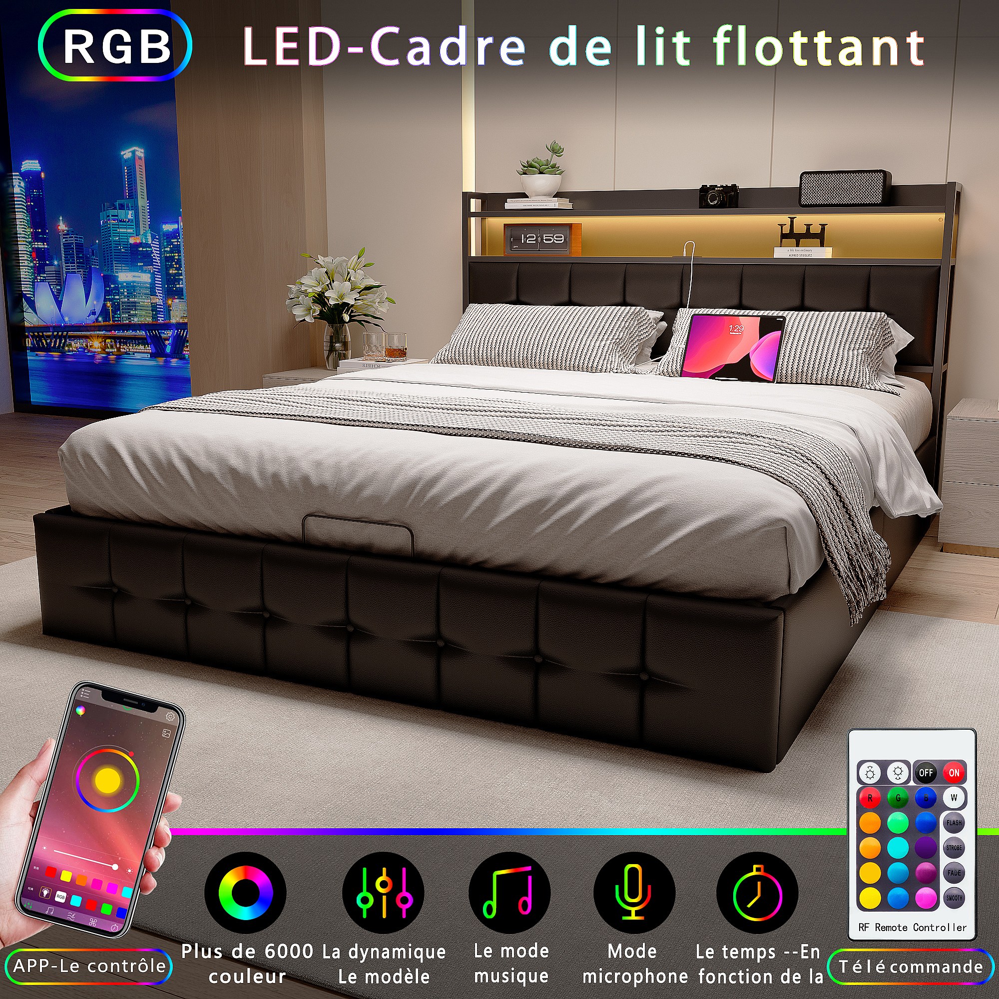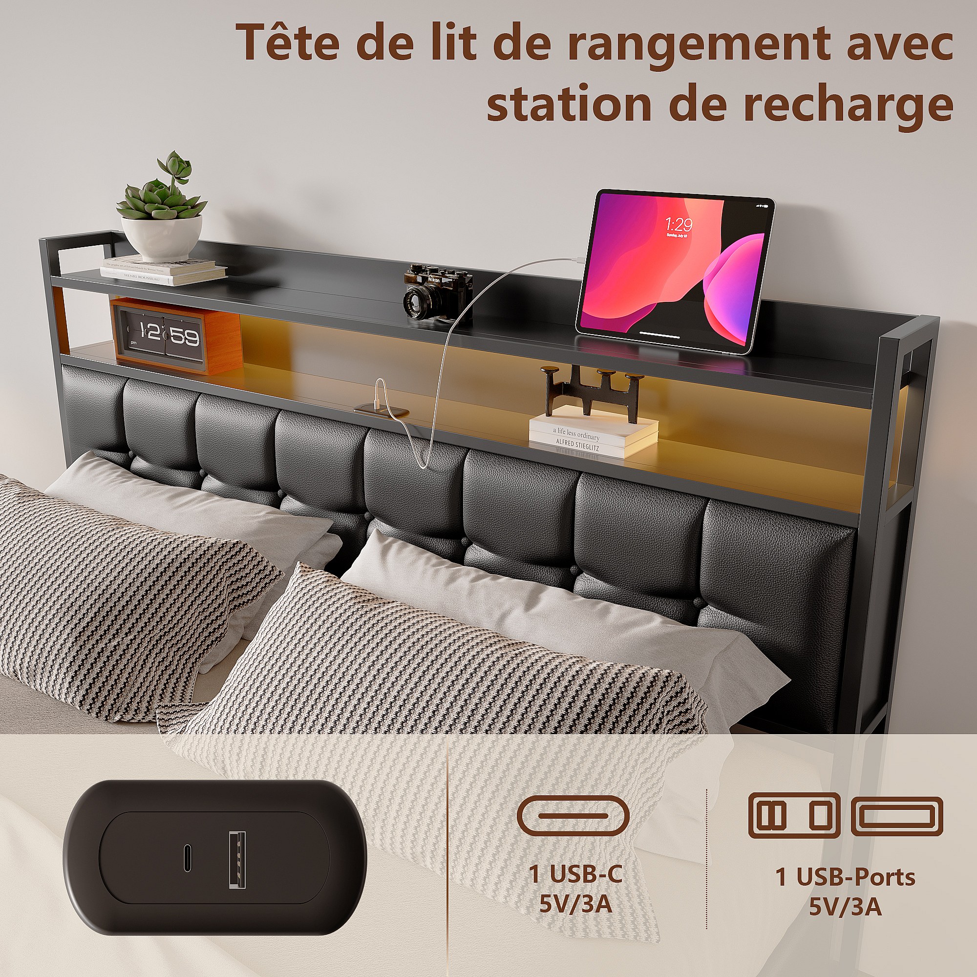 Lit rembourré avec 140 x 190 cm avec USB, lit double avec LED, avec sommier à lattes, PU, Noir