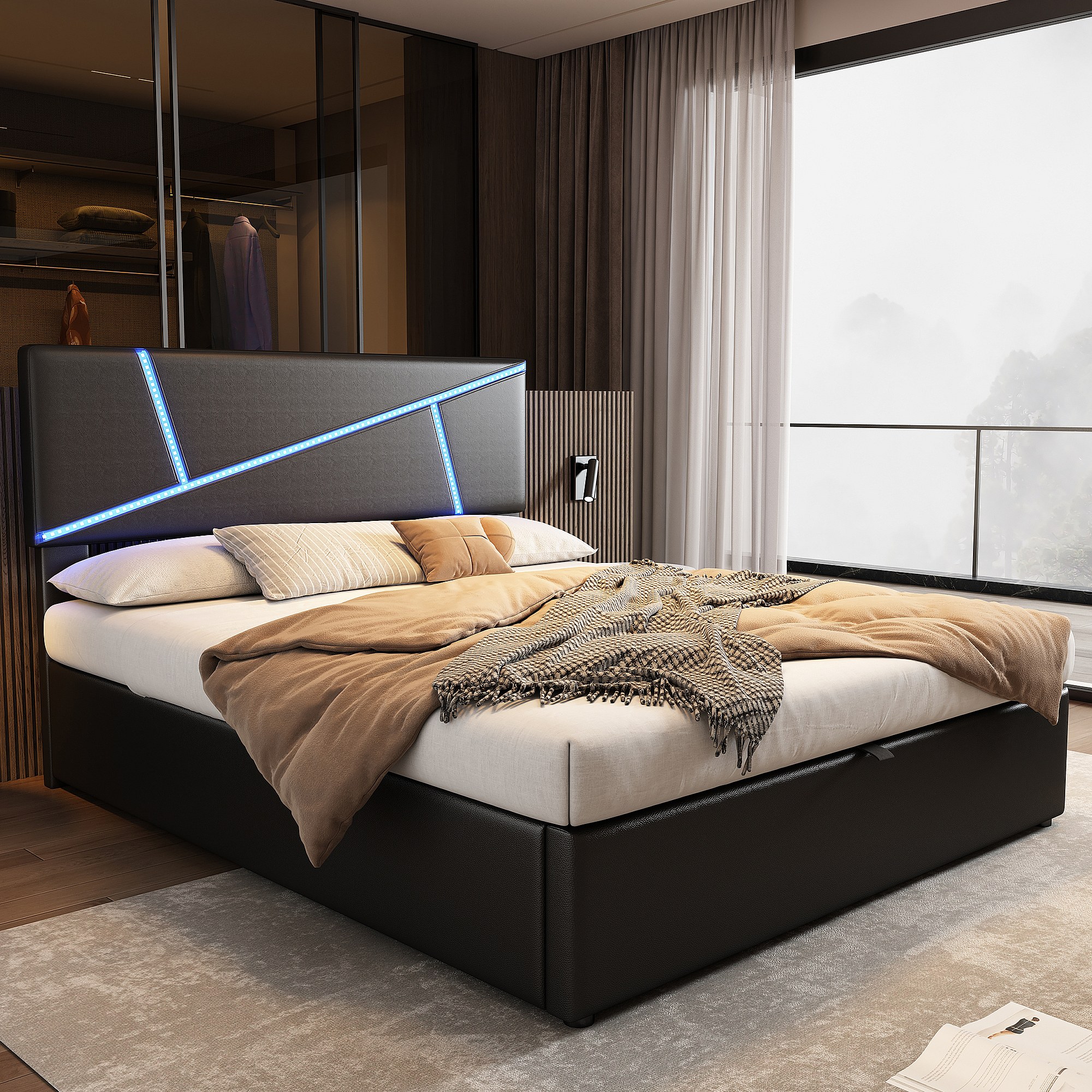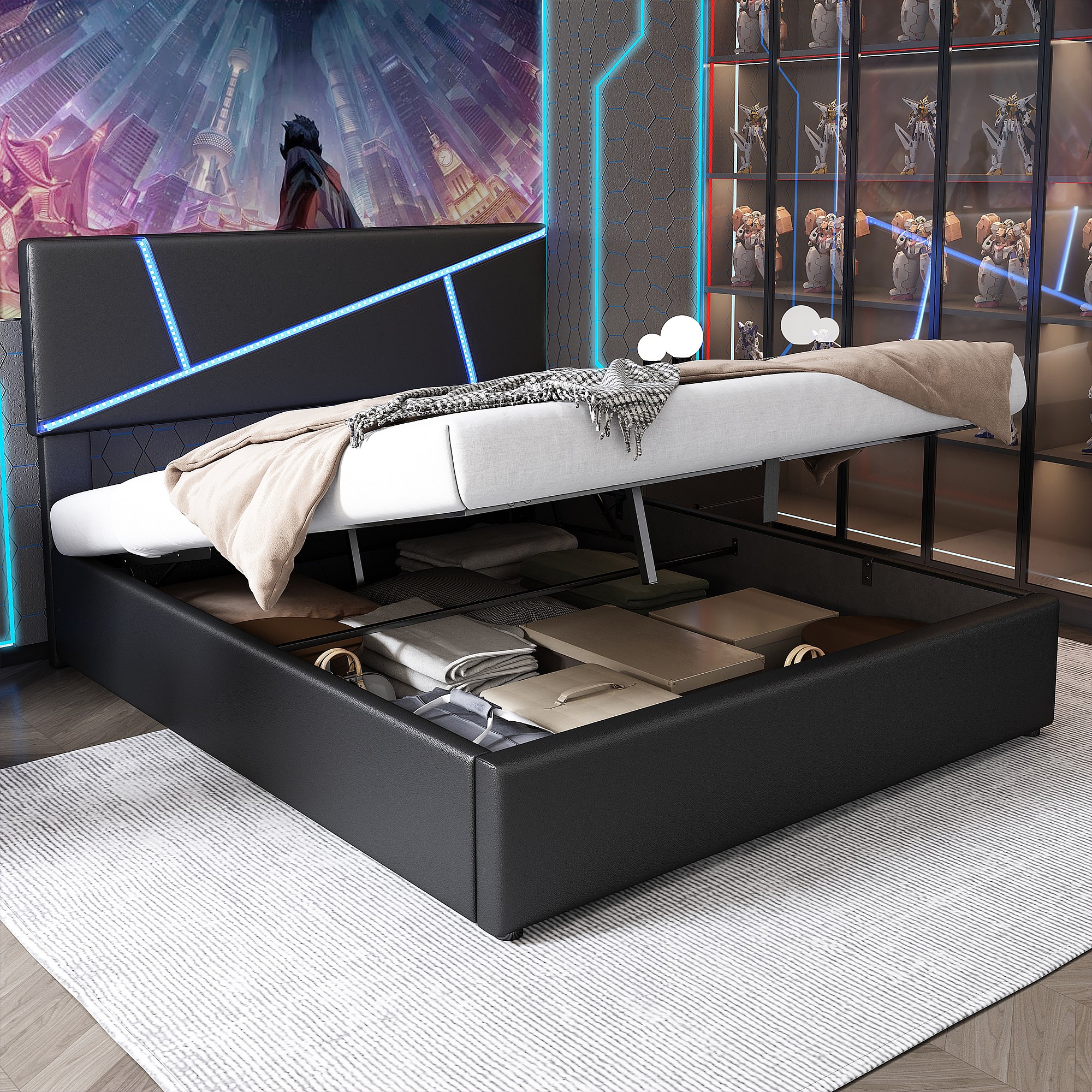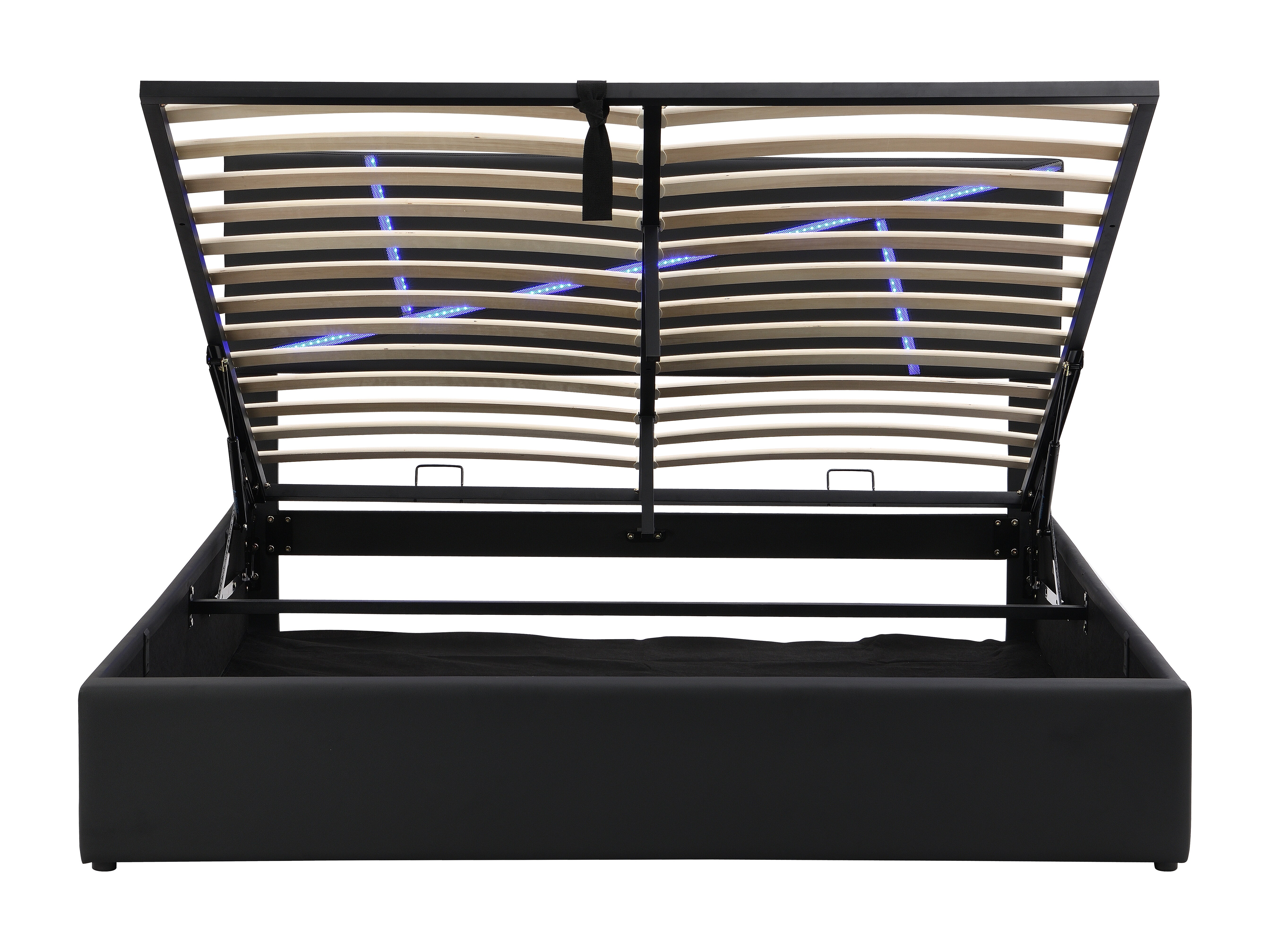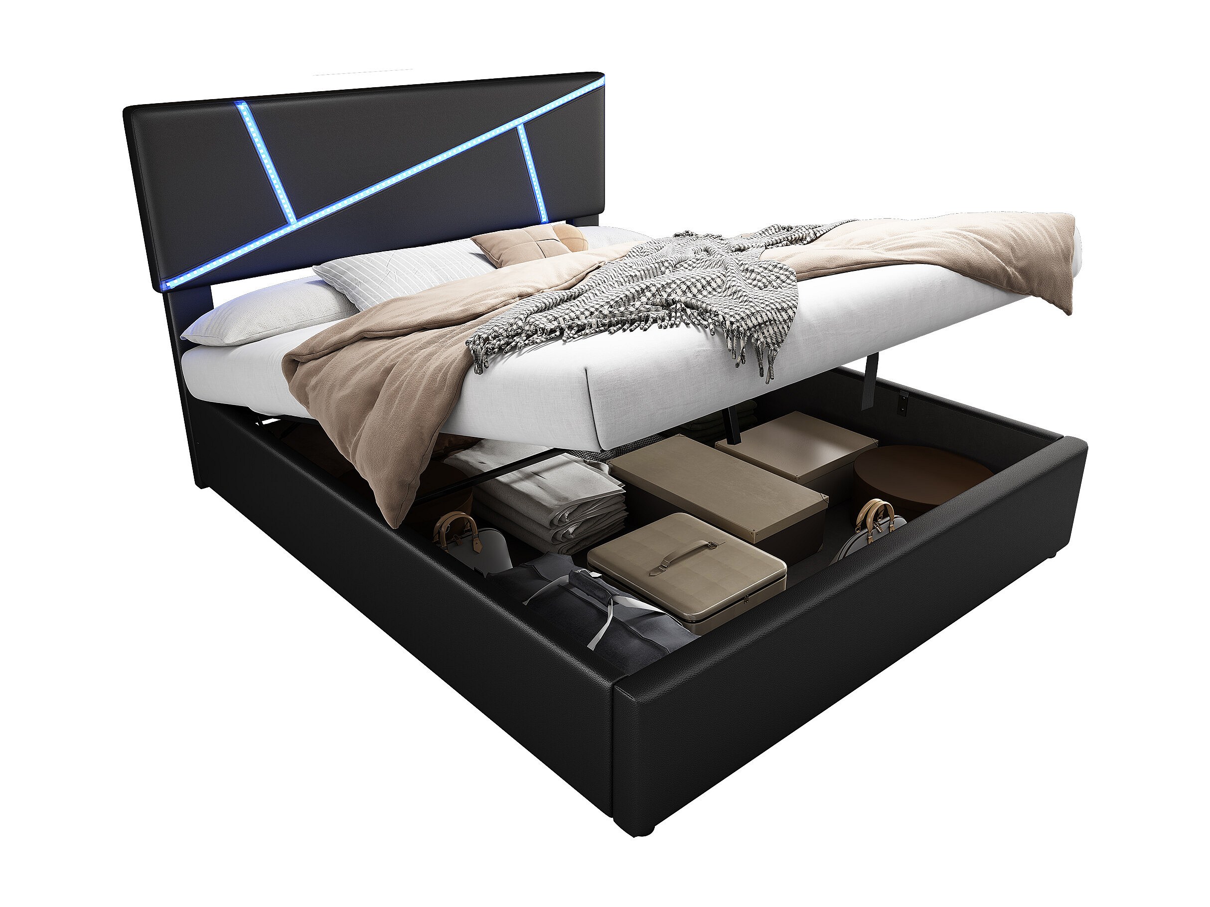 Lit rembourré avec éclairage LED, 140×200 cm, lit double avec sommier à lattes, tête de lit, hydraulique, cuir synthétique, noir