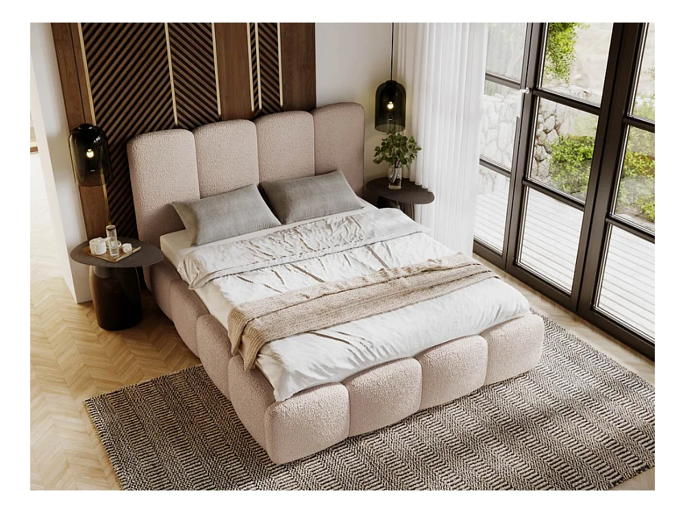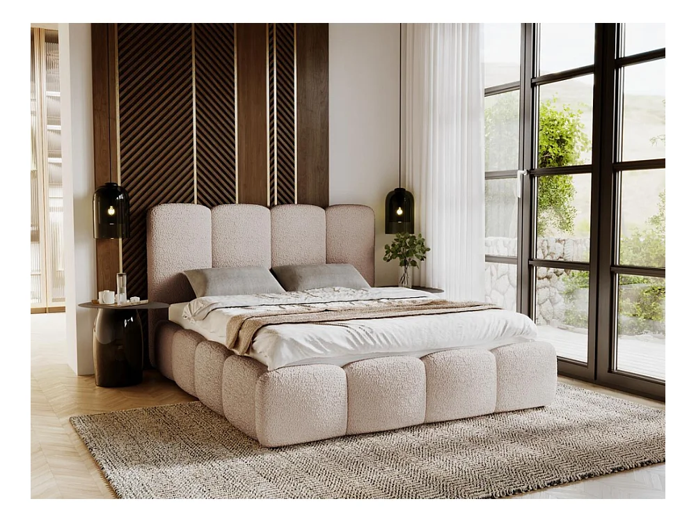 Lit rembourré avec rangement - 160 x 200 - lit double - bouclé - beige - Galli