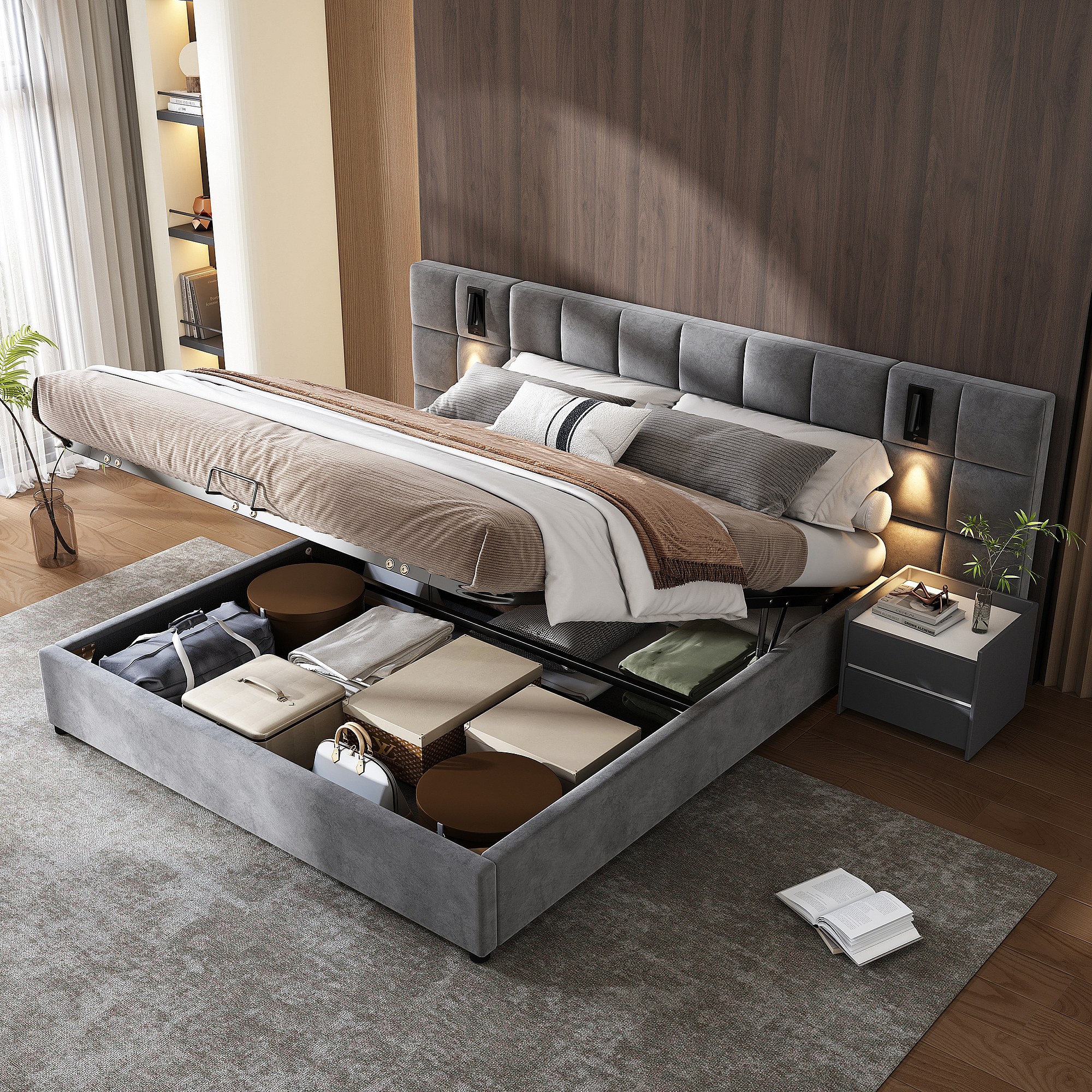 Lit rembourré avec rangement hydraulique, lampe directionnelle et USB, 180×200 cm, gris, tête de lit en mousse