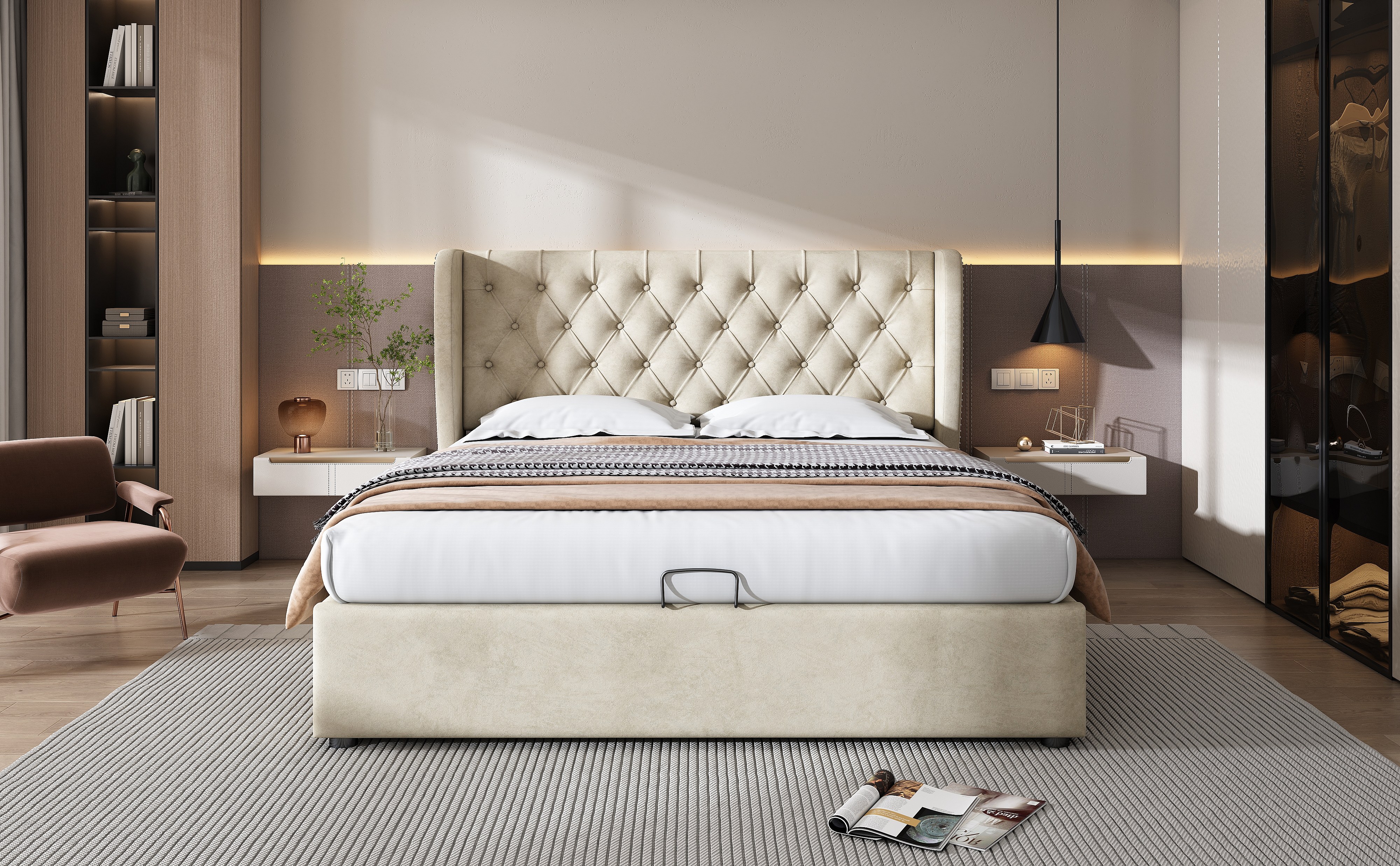 Lit rembourré beige 140x200 cm avec tête de lit haute et rangement hydraulique, style chic et fonctionnel