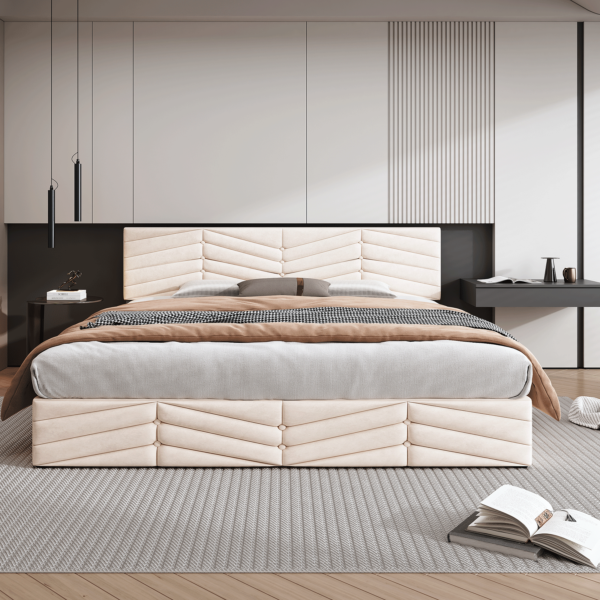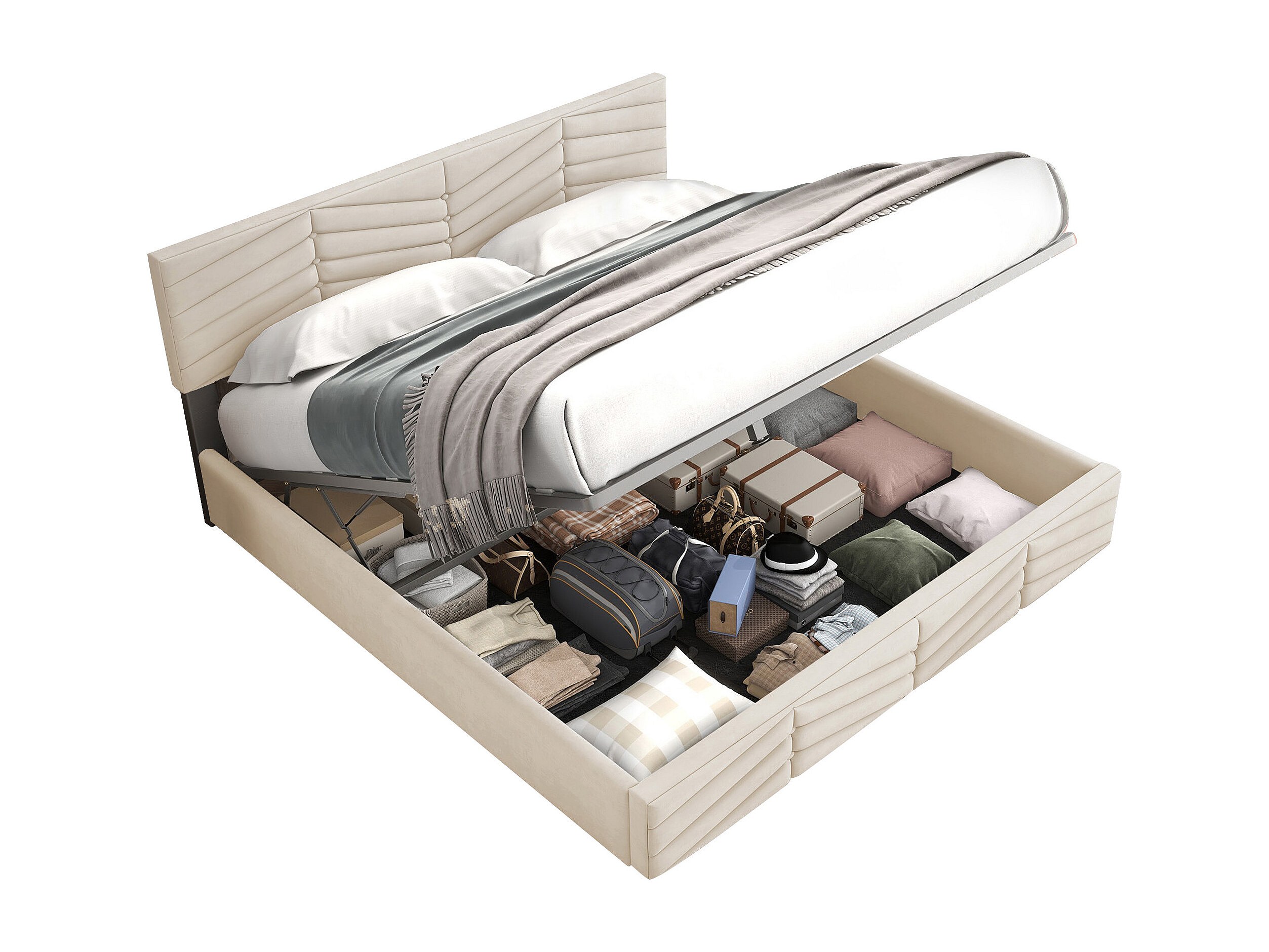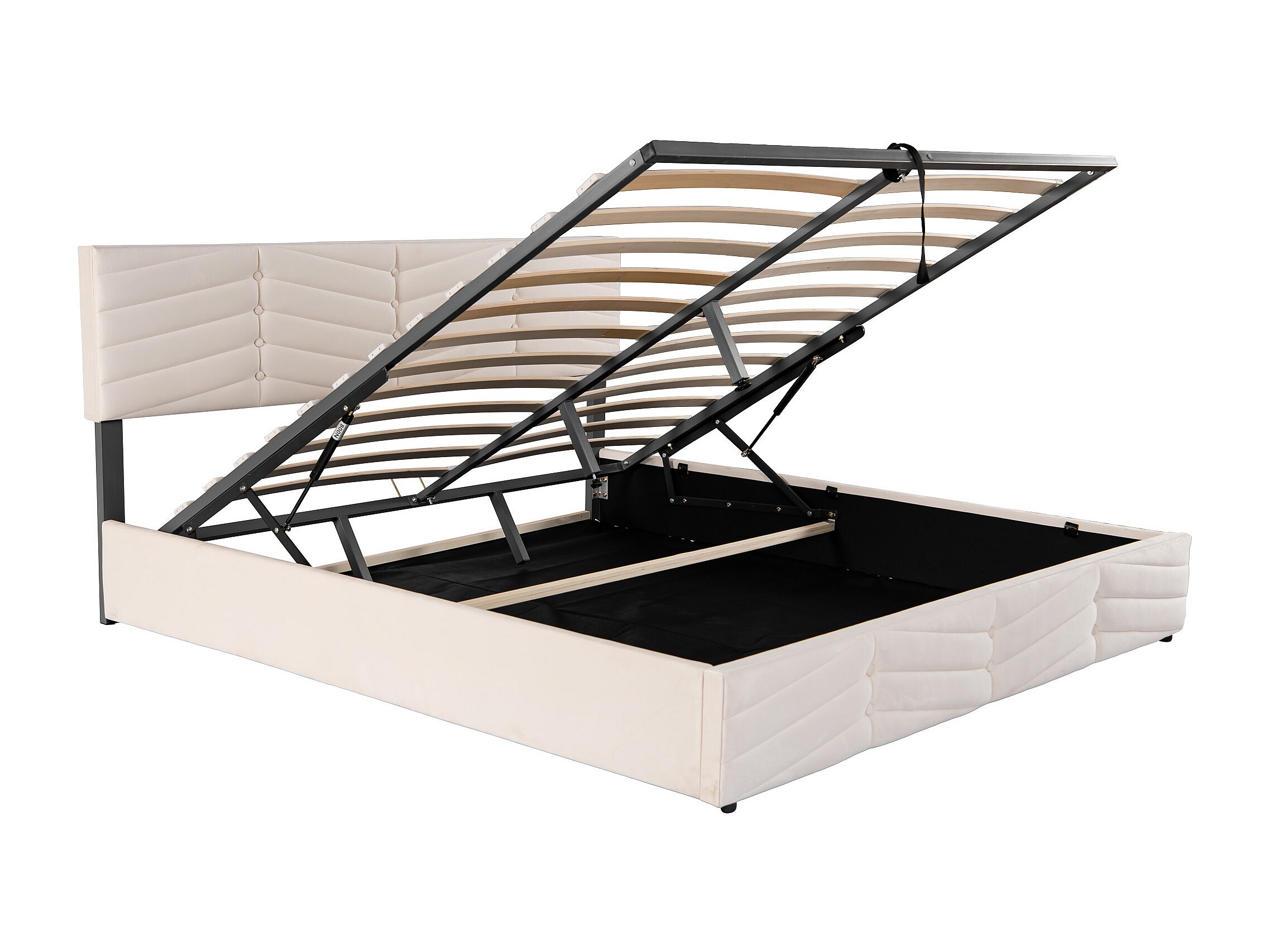 Lit rembourré beige 160x200 cm avec tête de lit réglable et rangement hydraulique, confortable et pratique