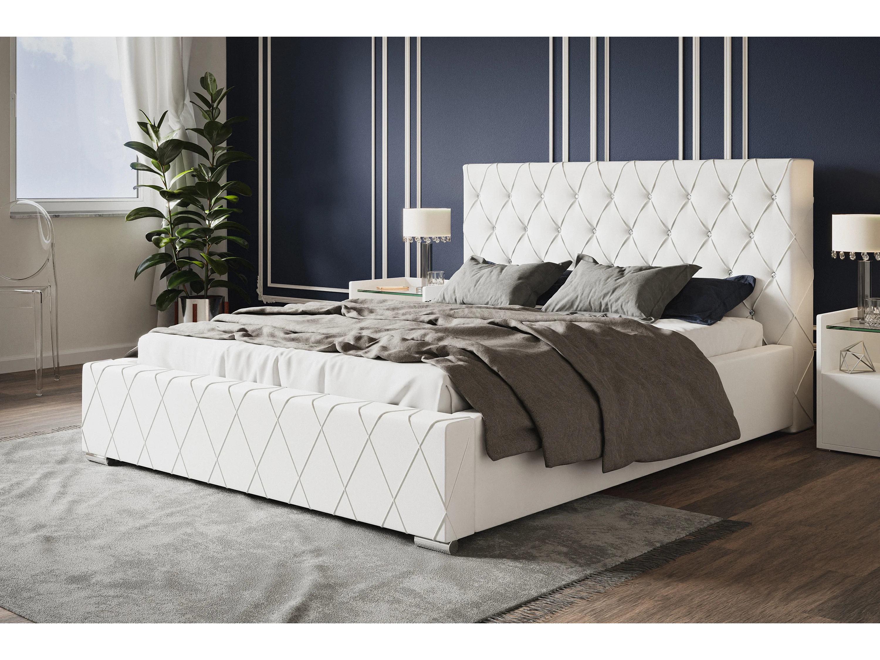 Lit rembourré Berlin avec tête de lit, 120x200 cm, avec coffre de rangement et sommier à lattes en bois, similicuir, couleur: blanc