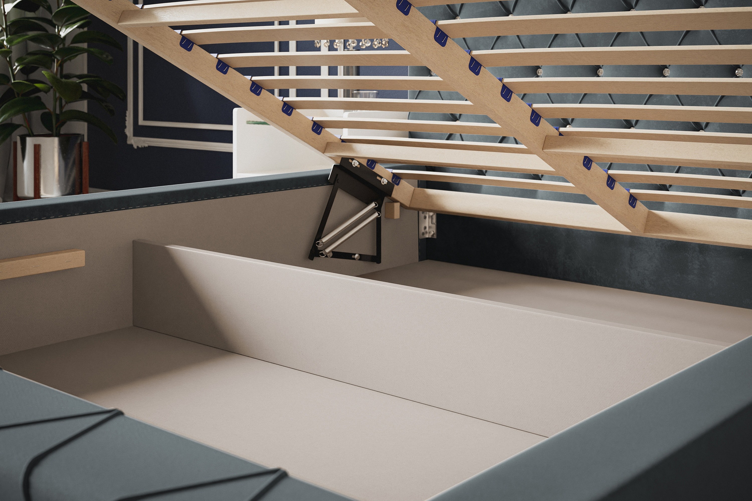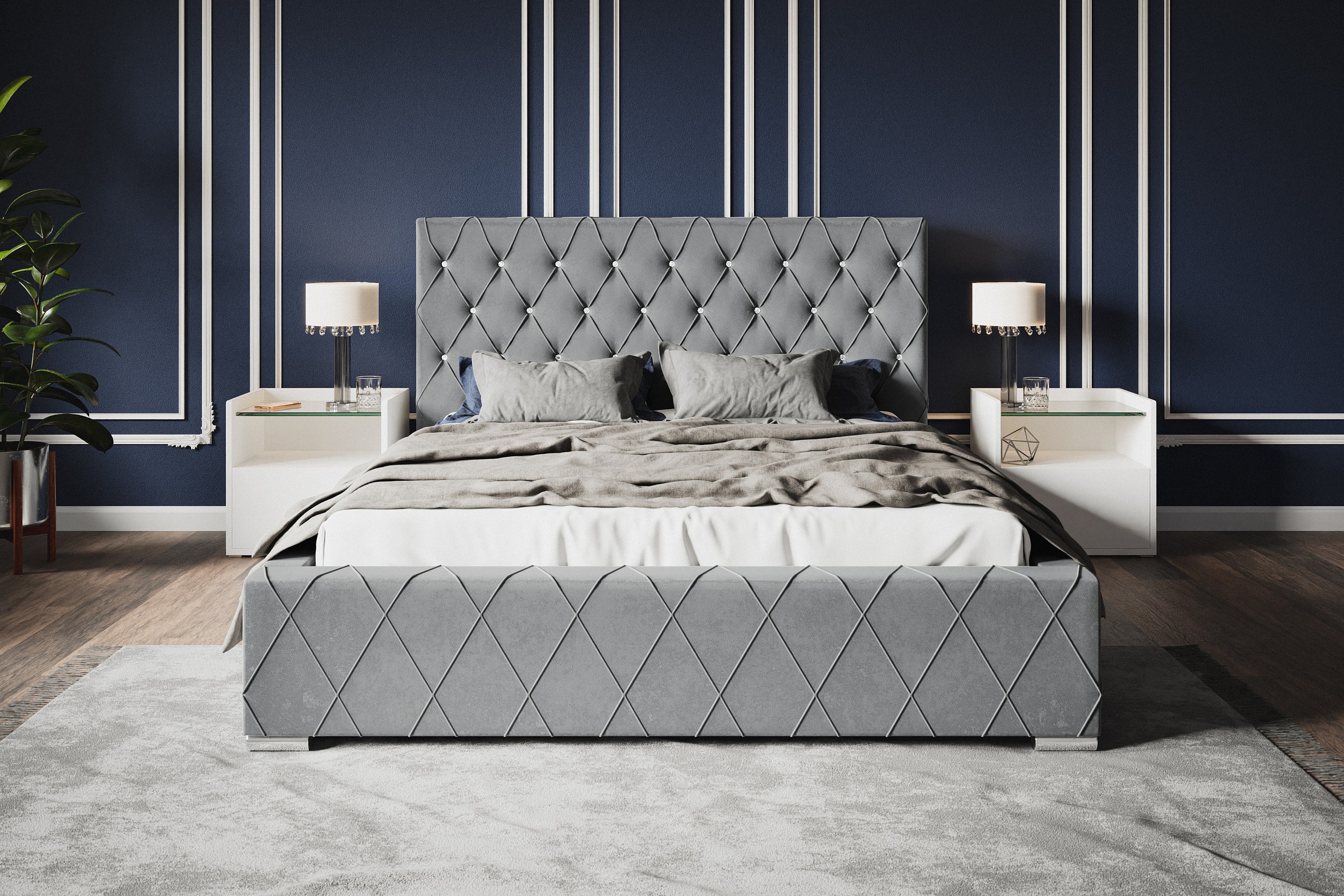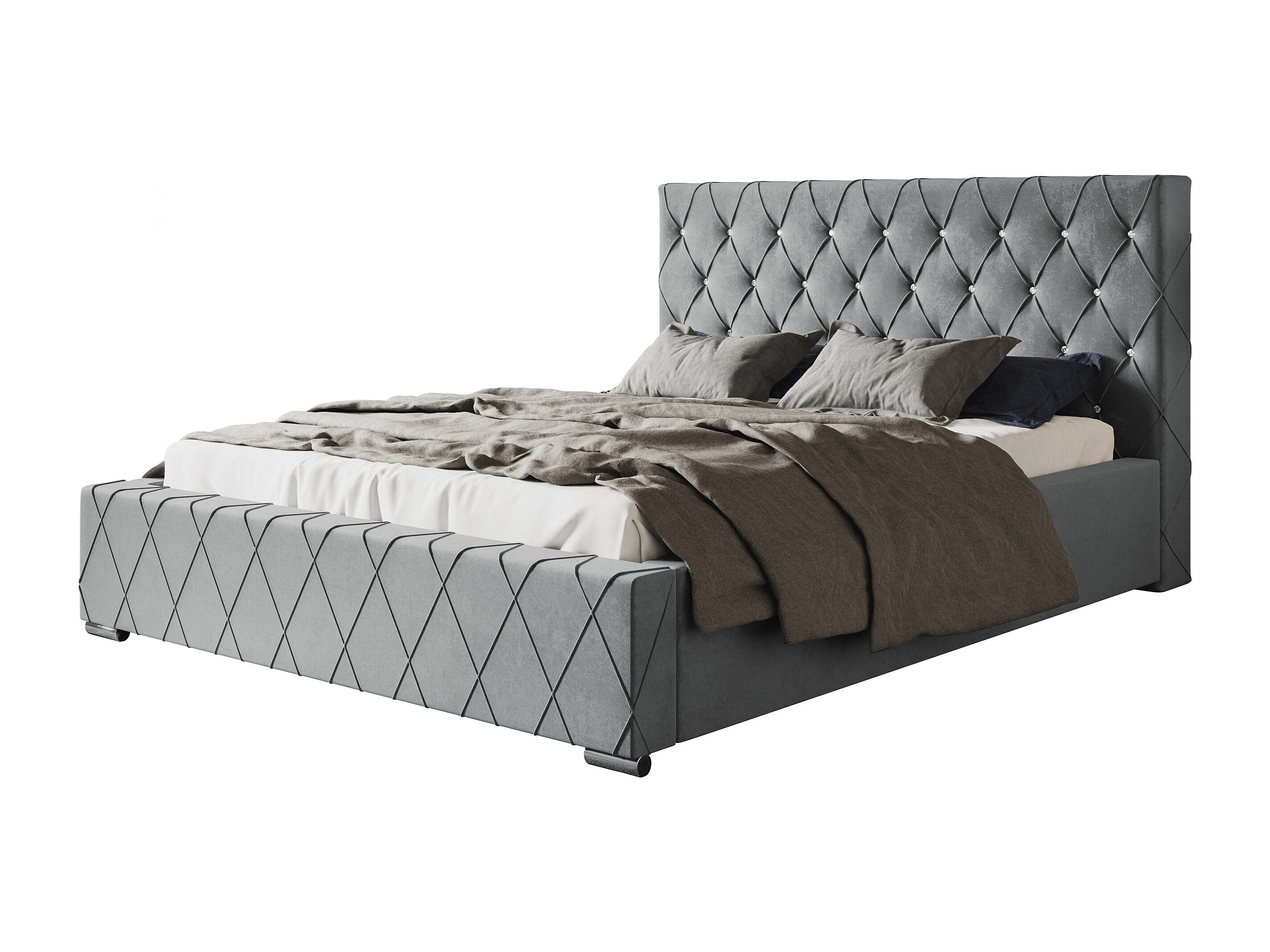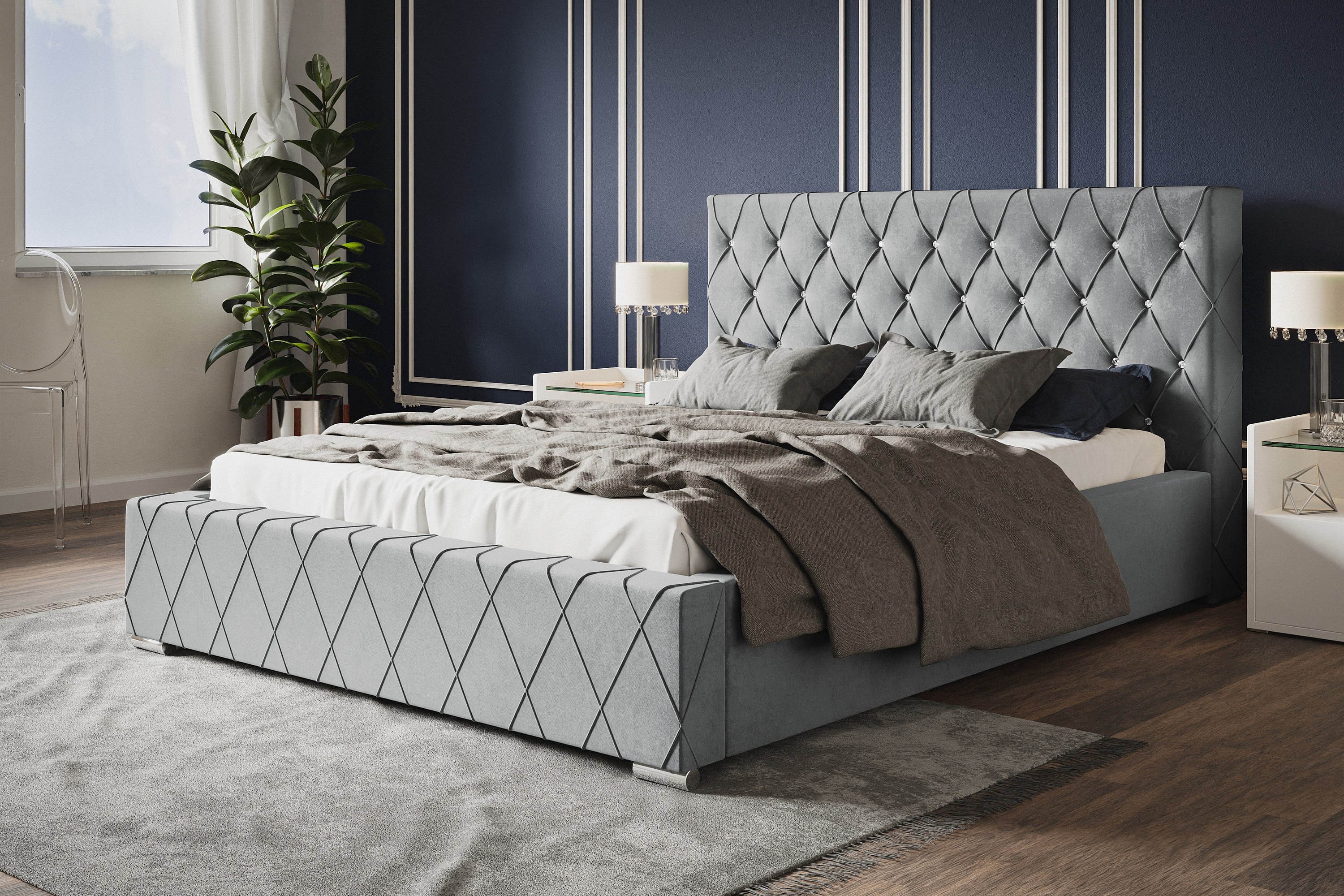 Lit rembourré Berlin avec tête de lit, 140x200 cm, lit double avec coffre de rangement et sommier à lattes en bois, tissu velours, couleur : gris